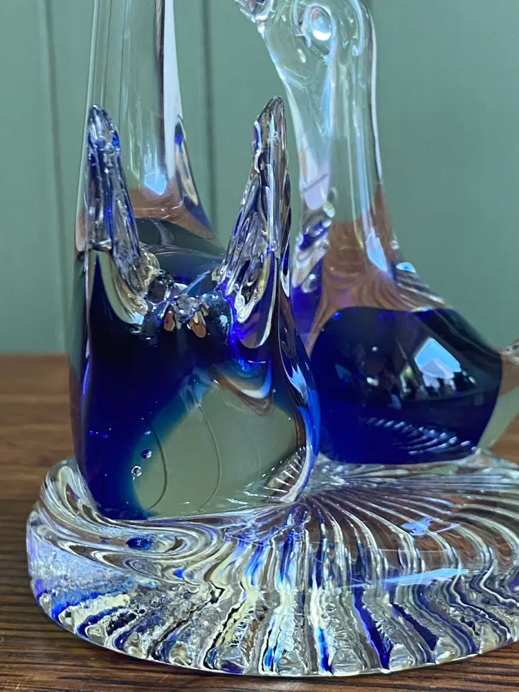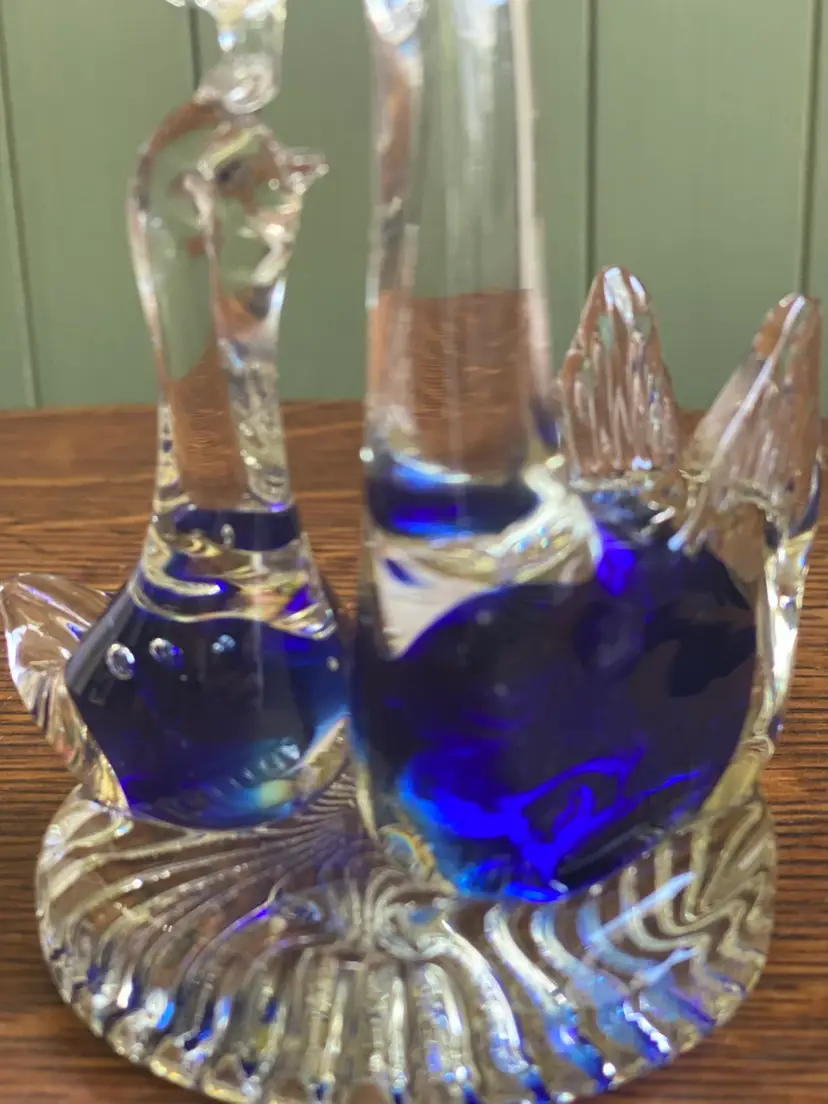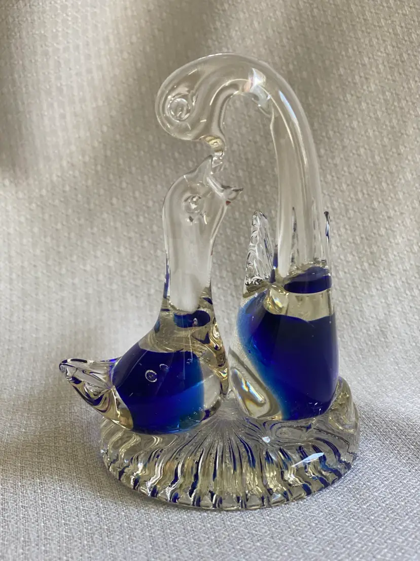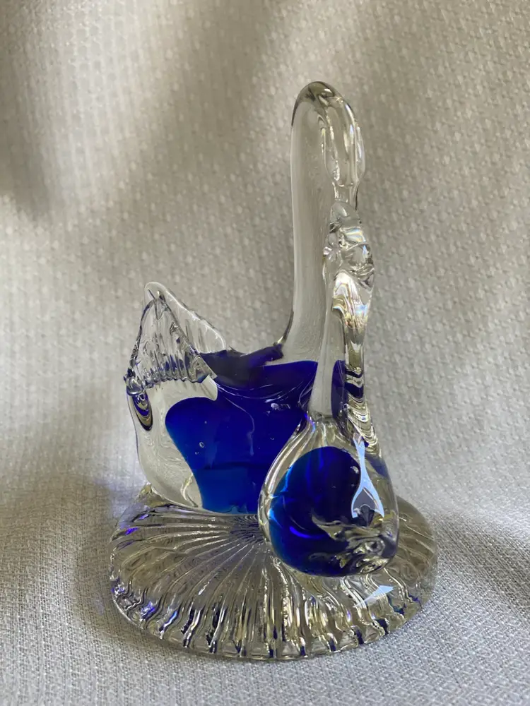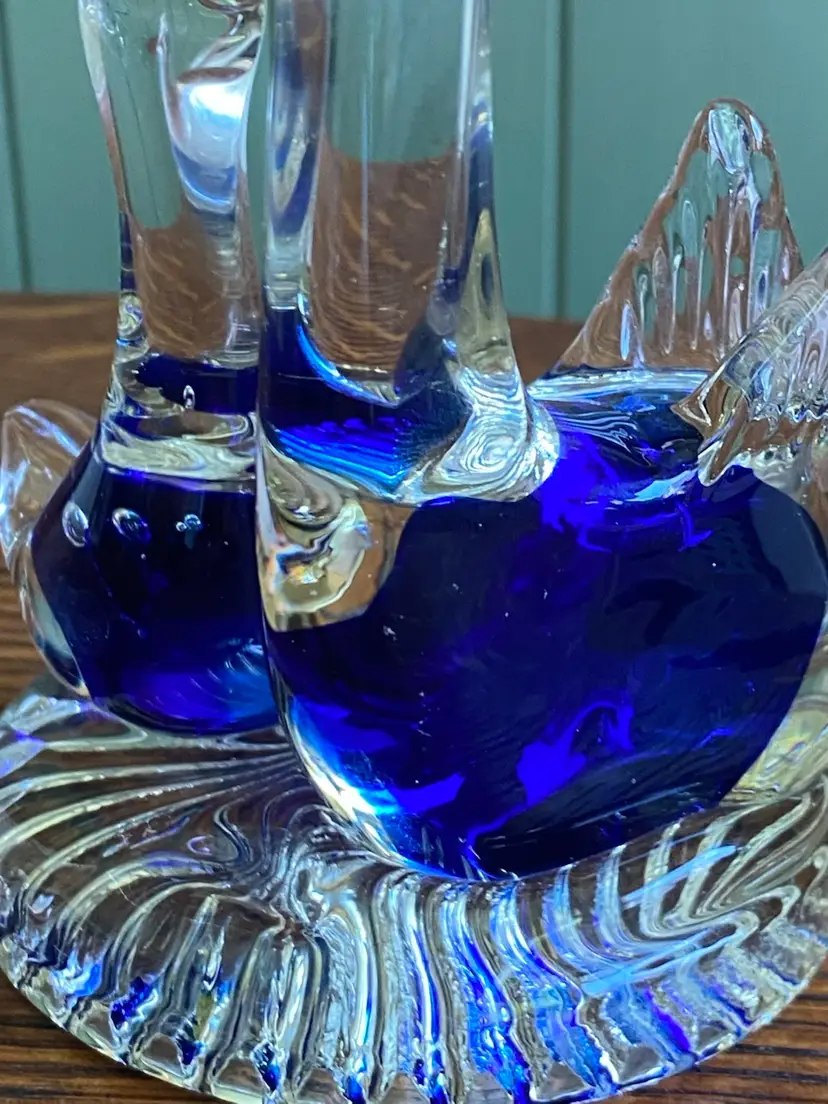 This art glass figurine is 4.5” tall and the base is just under 3” in diameter. It’s in good condition except for a small knick on the mama swan in the blue part. There are some bubbles in each swan. See pictures.