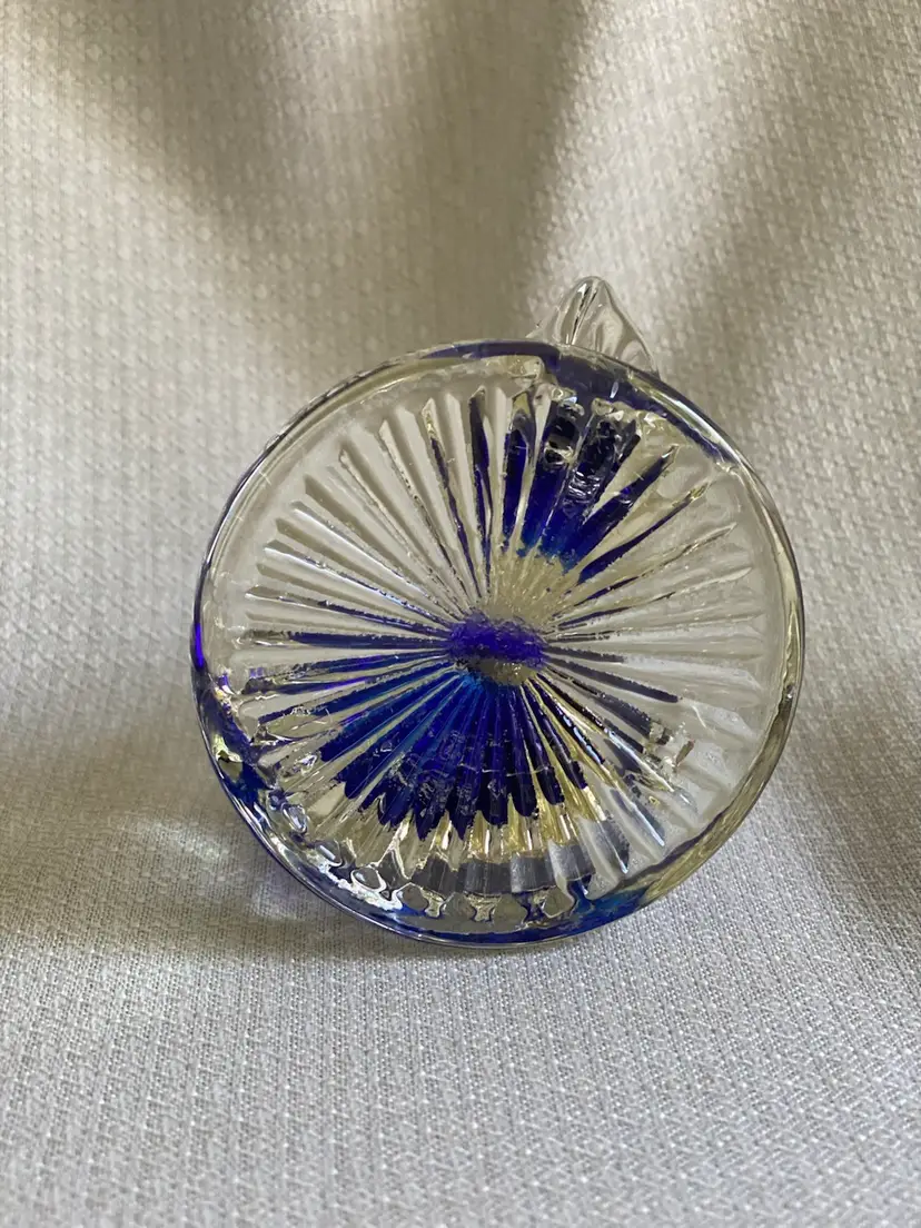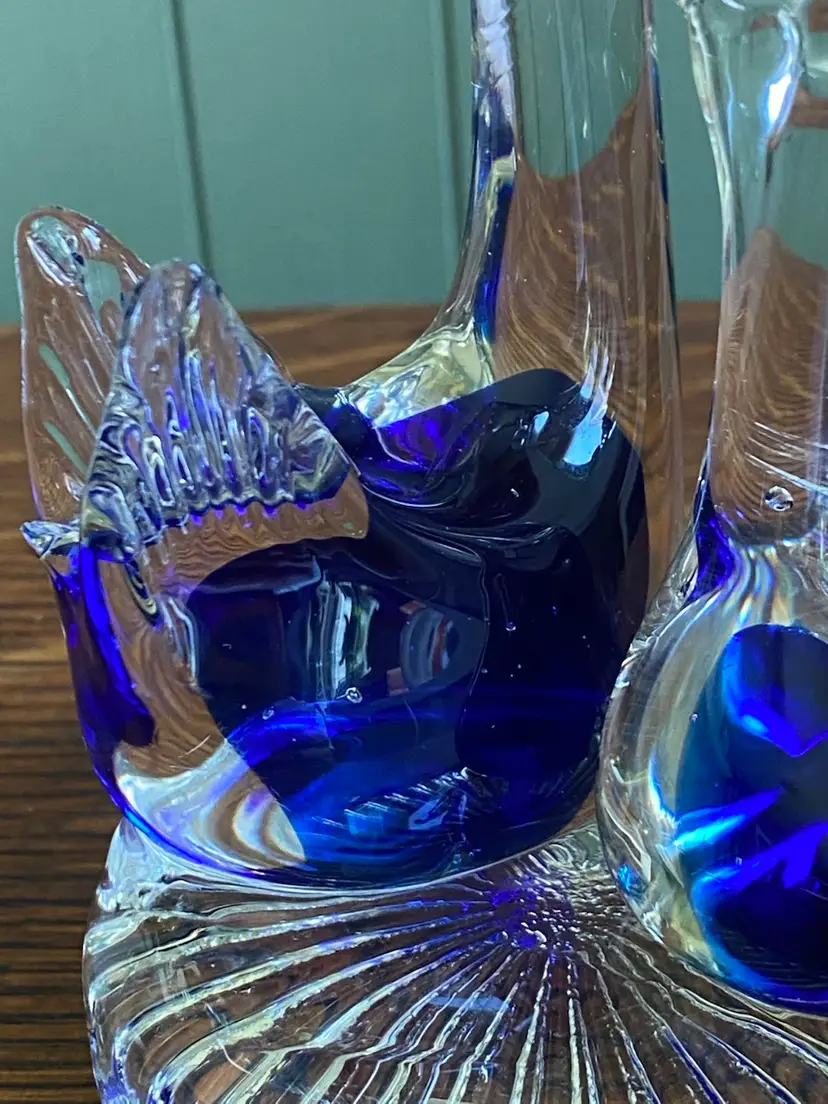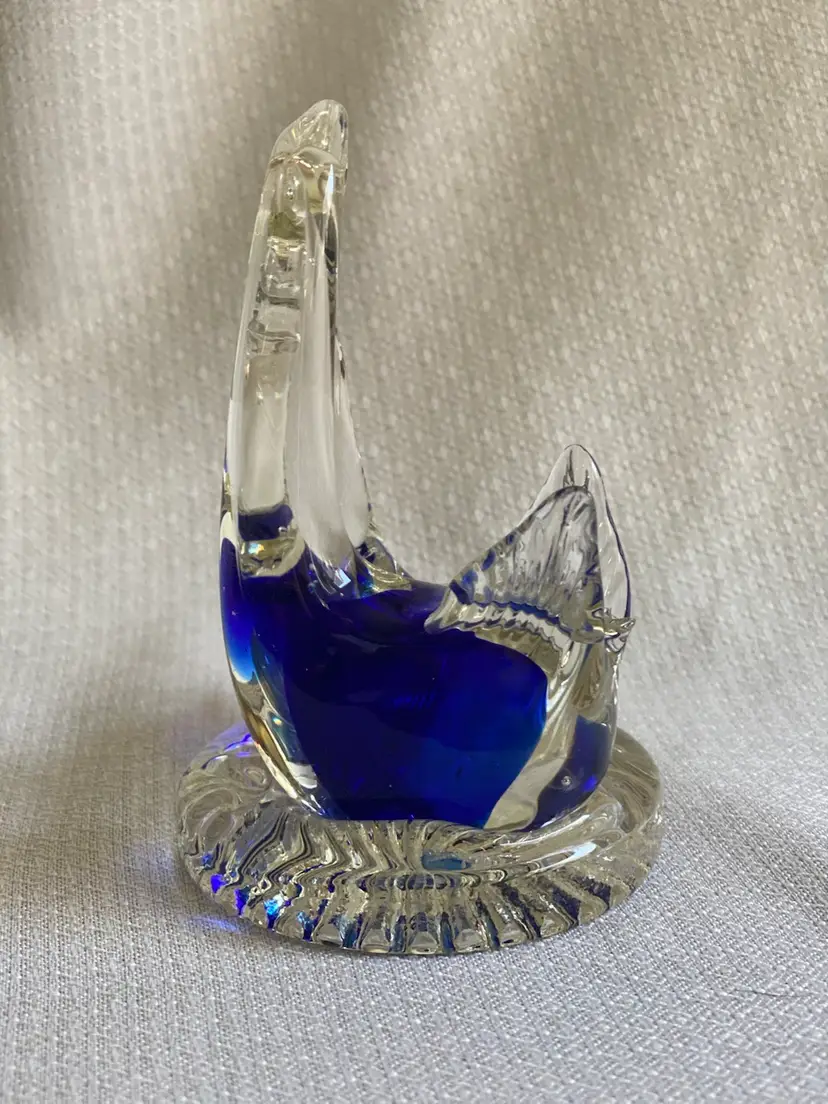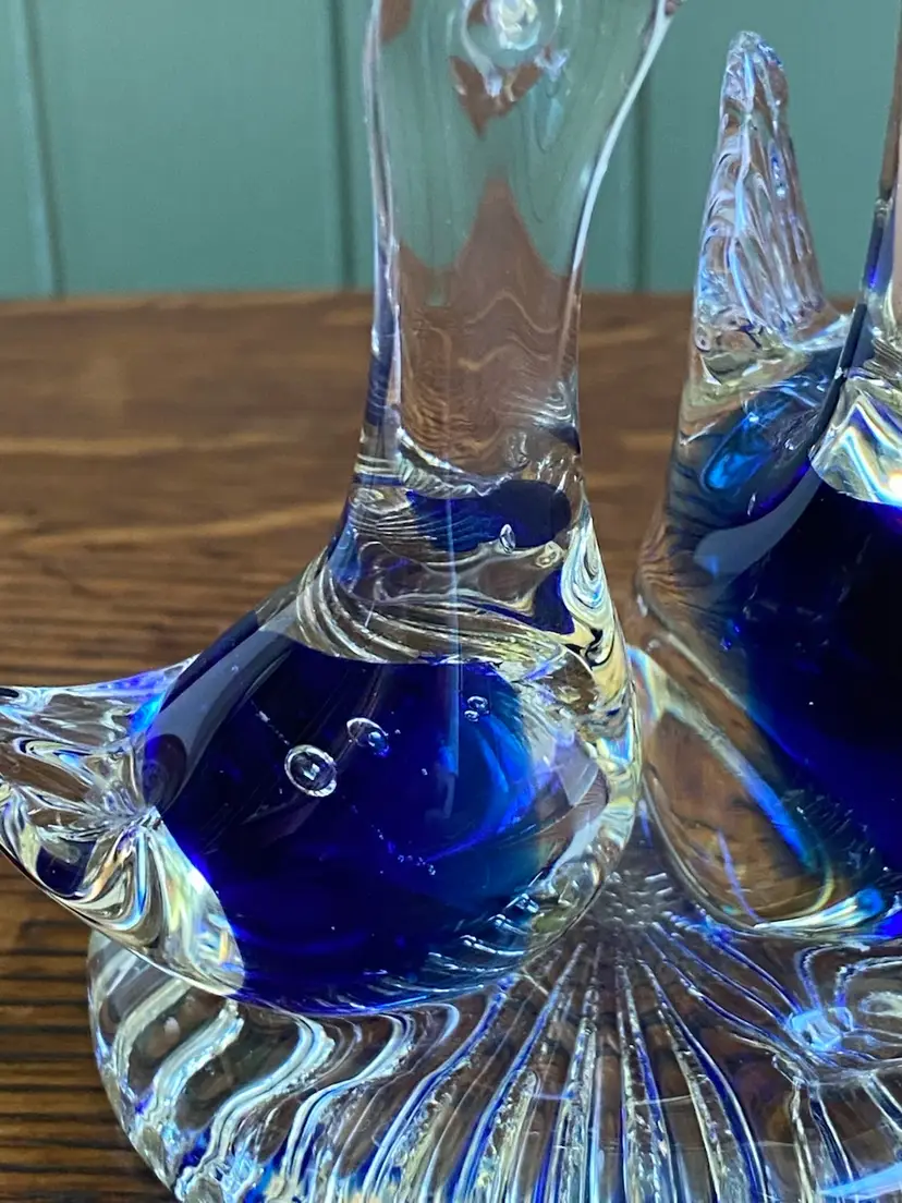 This art glass figurine is 4.5” tall and the base is just under 3” in diameter. It’s in good condition except for a small knick on the mama swan in the blue part. There are some bubbles in each swan. See pictures.