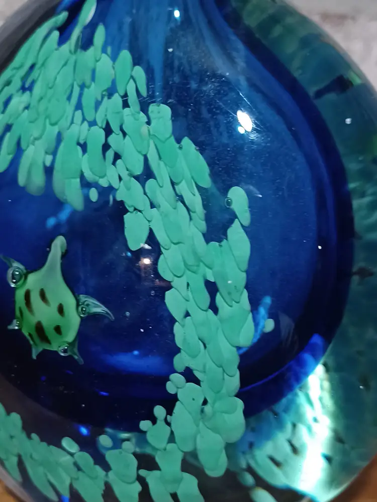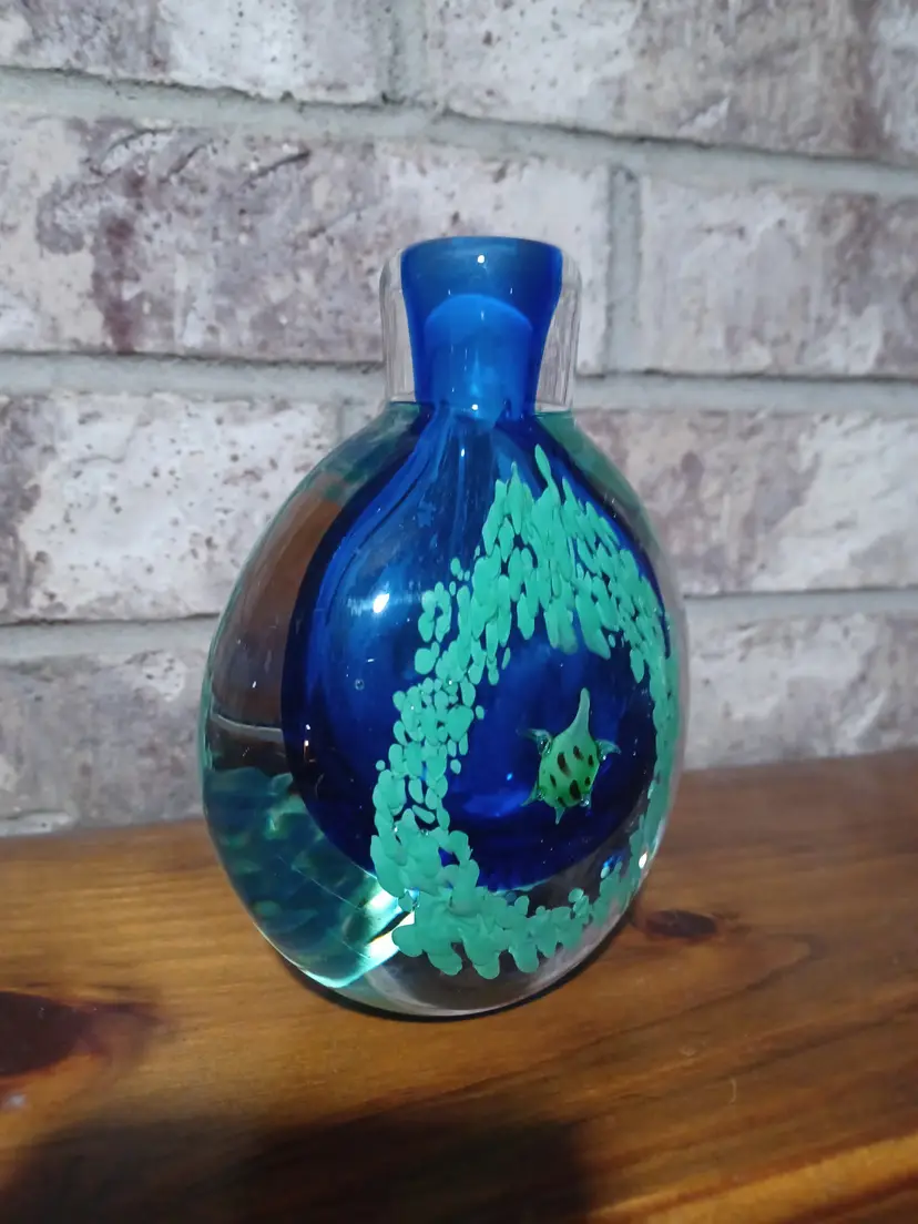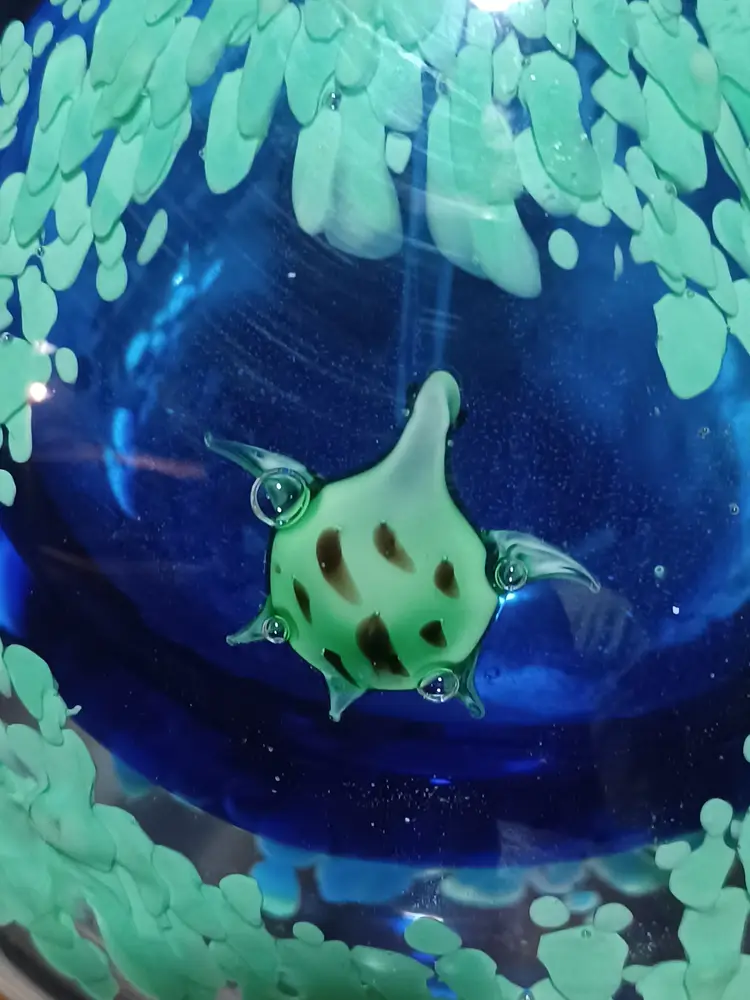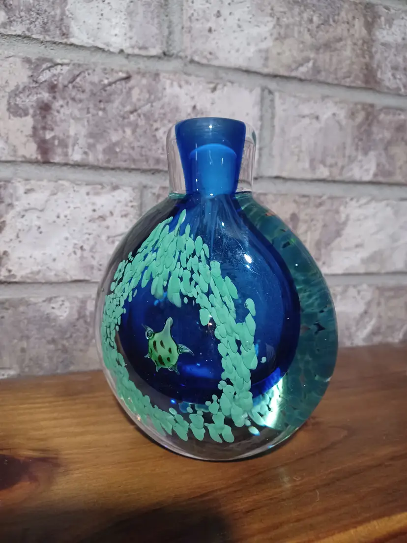 This unique ocean-themed glass piece makes a wonderful coastal décor accent, art glass display item, or collector’s piece. Its weight and craftsmanship give it the presence of a small sculpture and it displays beautifully on a desk, shelf, or curio cabinet.