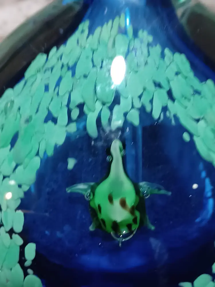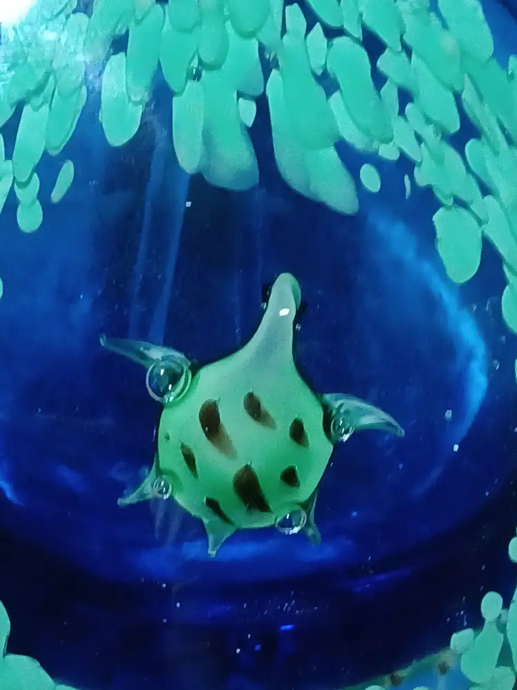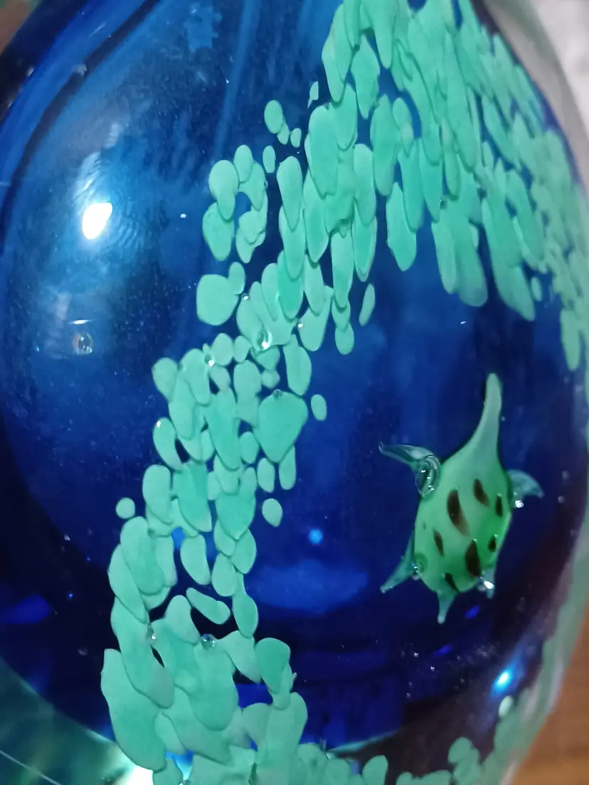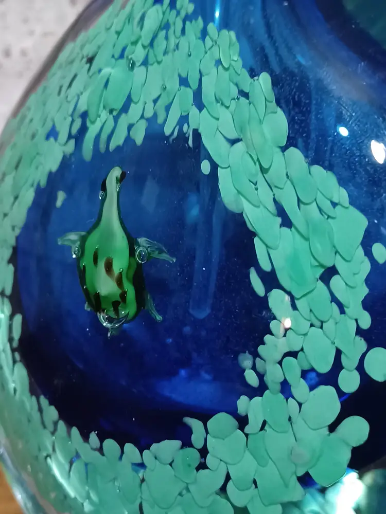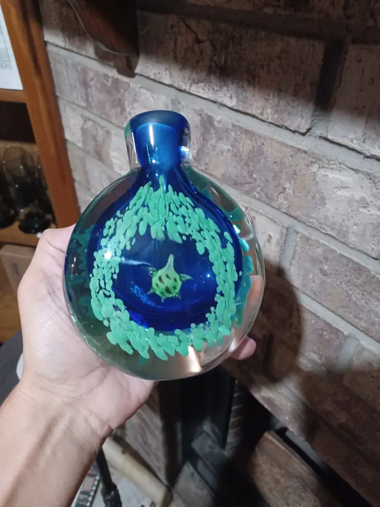 This unique ocean-themed glass piece makes a wonderful coastal décor accent, art glass display item, or collector’s piece. Its weight and craftsmanship give it the presence of a small sculpture and it displays beautifully on a desk, shelf, or curio cabinet.