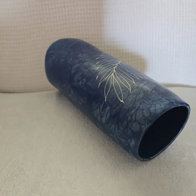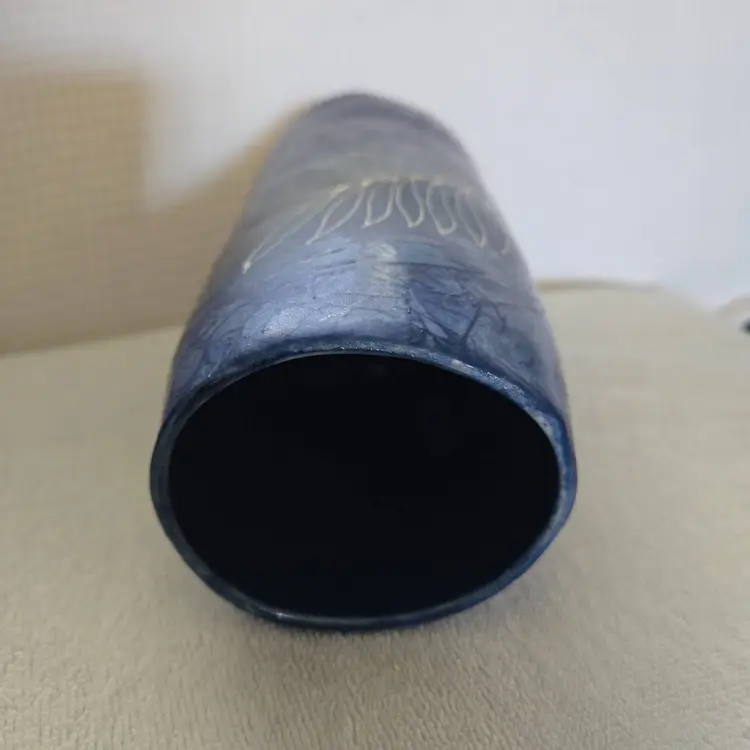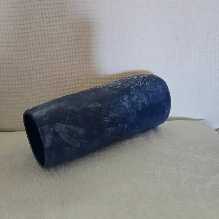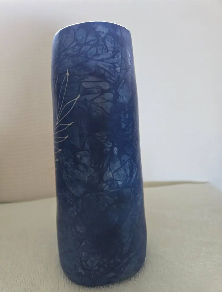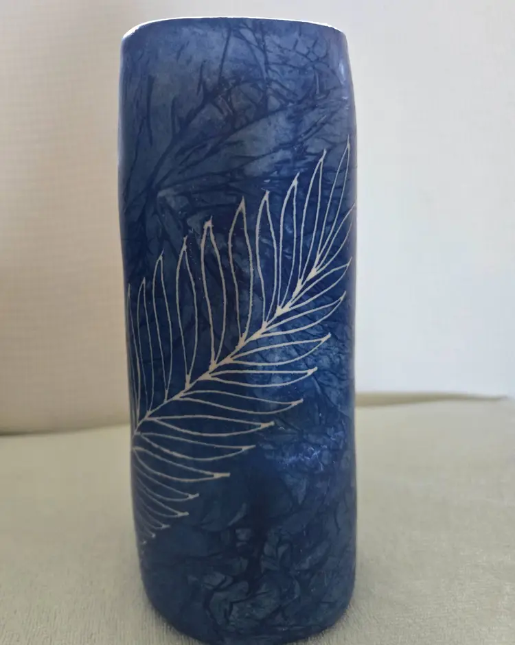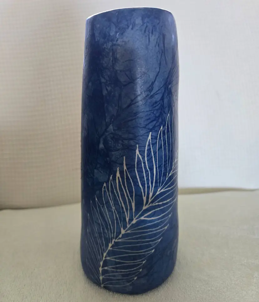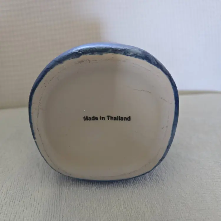 Pretty pottery/ceramic vase. It almost looks like denim with an etched fern pattern the top is oval shaped and the bottom is square shaped. Made in Thailand. 9" tall and 3 3/4" across the bottom. No chips, cracks, or repairs. Excellent condition.