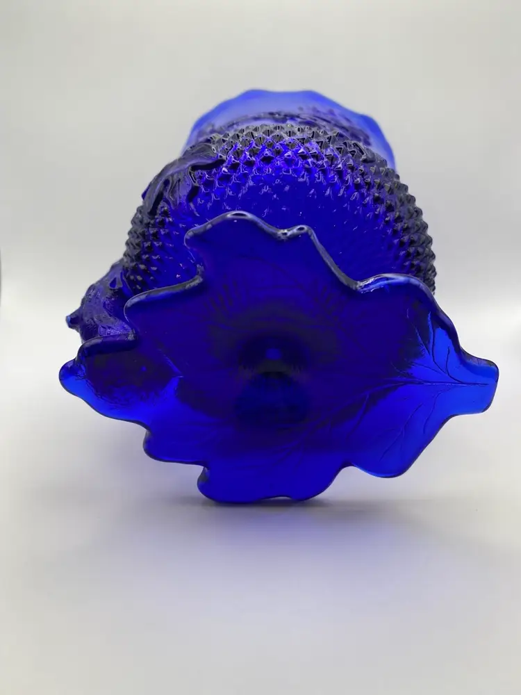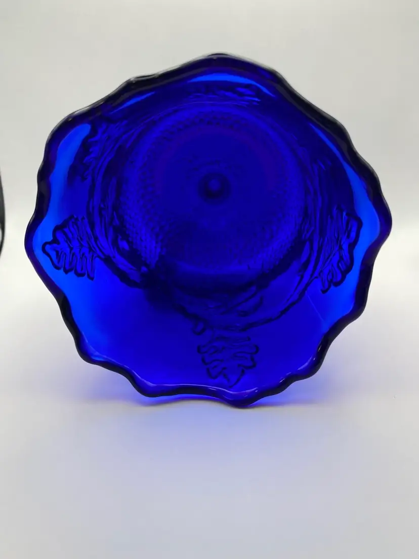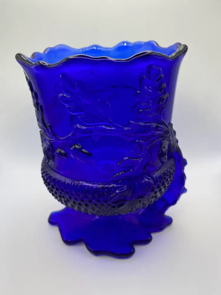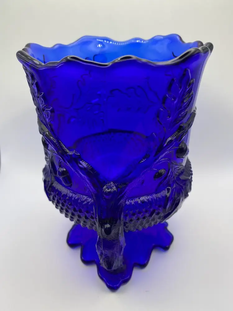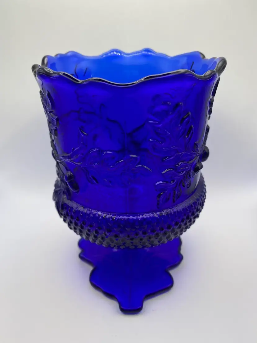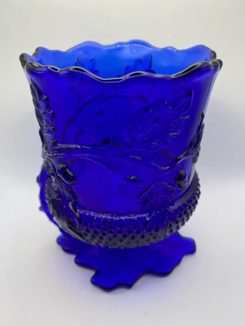 Cobalt Blue Glass Cup/Vase w/Leaf & Acorn Pattern w/Branch Handle. 5 1/4” x 4”. Great condition. See pictures.