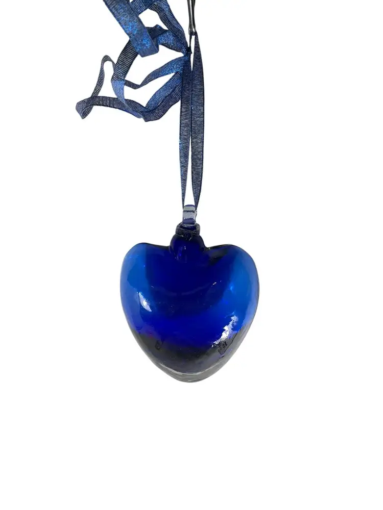 Weight 9.8 oz. Length 5”, width 4” x 2”. Attached ribbon for hanging. Hand blown. No chips or cracks.