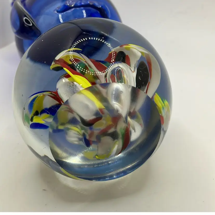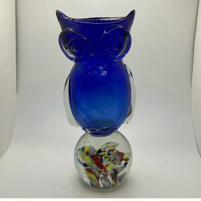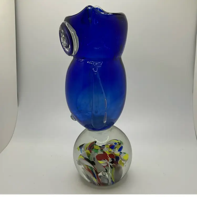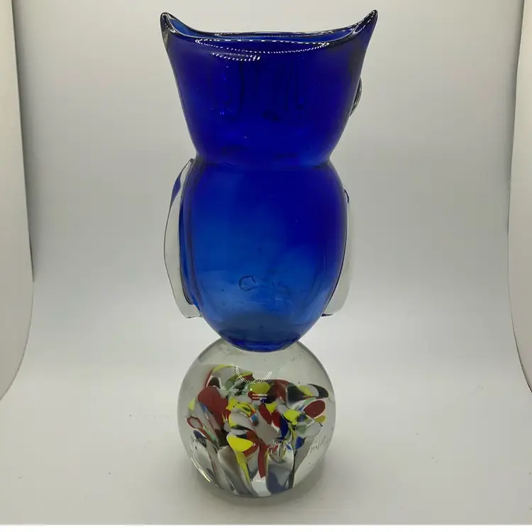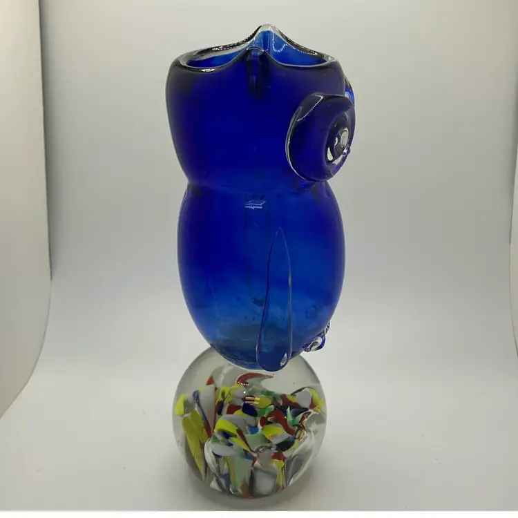 TWO great things in one!! Cobalt blue owl vase atop a multi- colored paperweight!! Bottom is pretty clear. No chips or cracks. Some minor scuffs. A very solid piece weighing in at over 2 lbs.