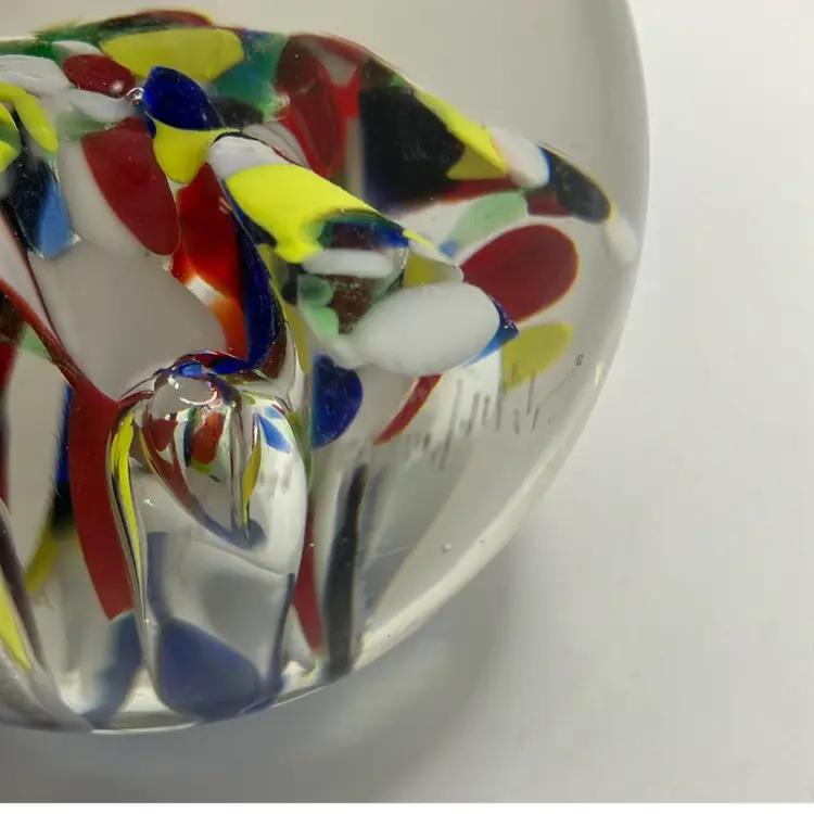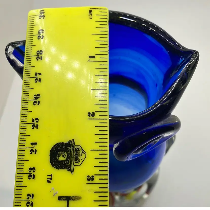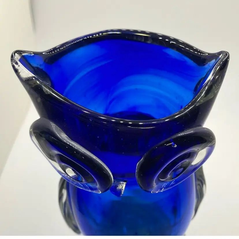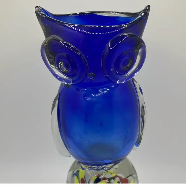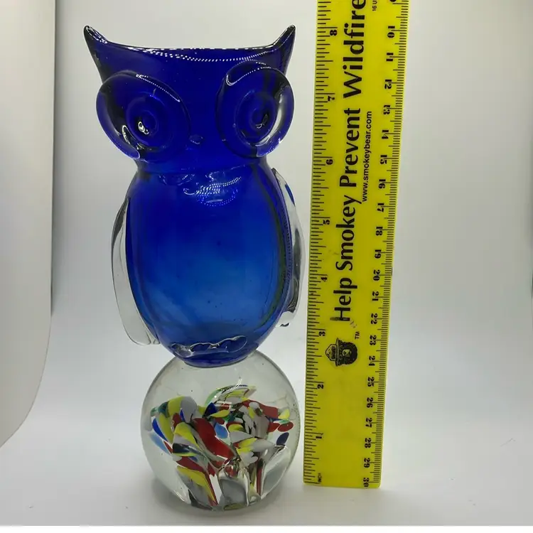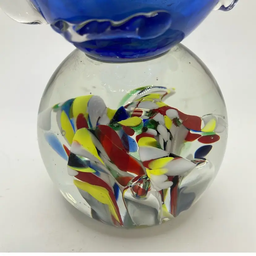 TWO great things in one!! Cobalt blue owl vase atop a multi- colored paperweight!! Bottom is pretty clear. No chips or cracks. Some minor scuffs. A very solid piece weighing in at over 2 lbs.