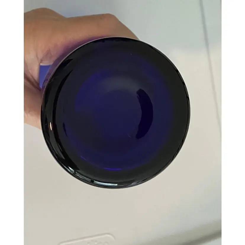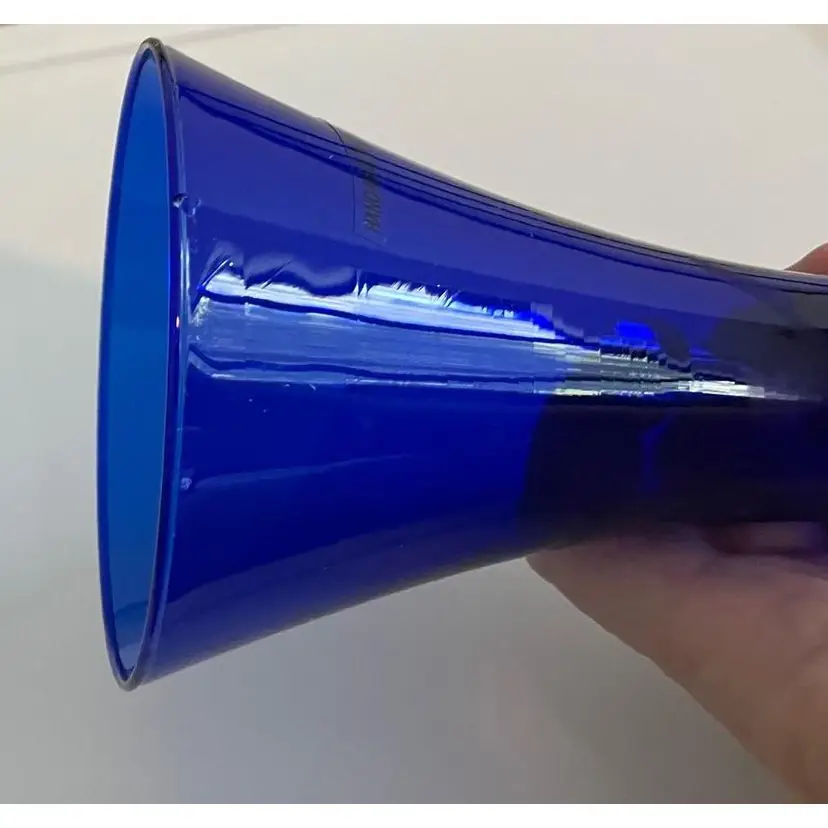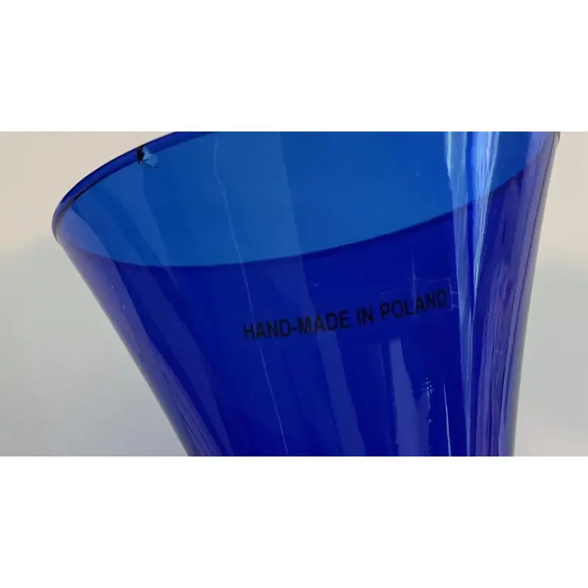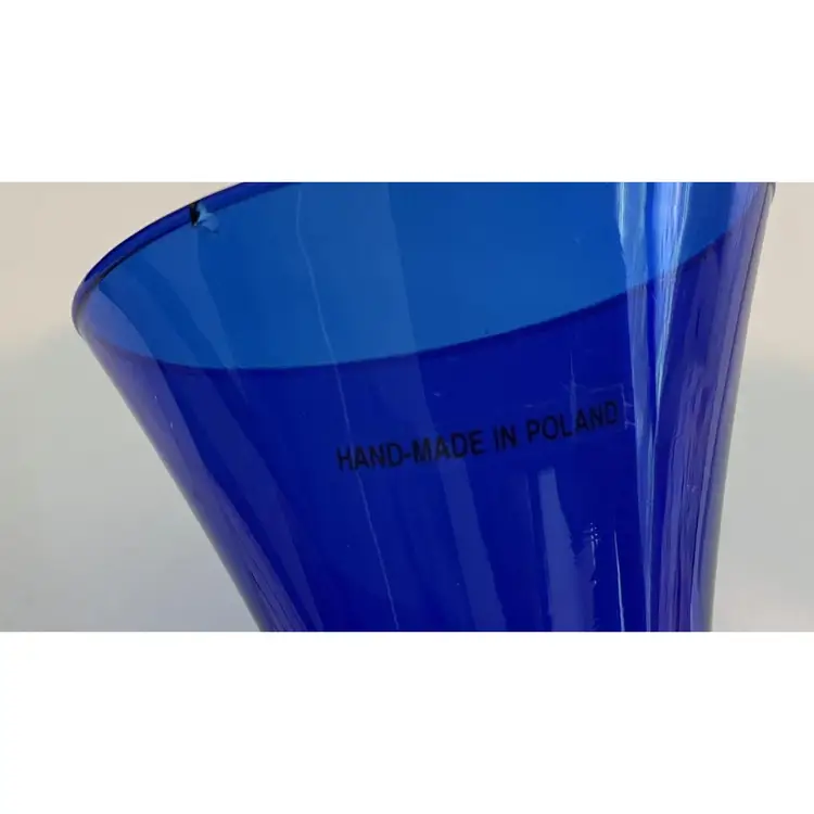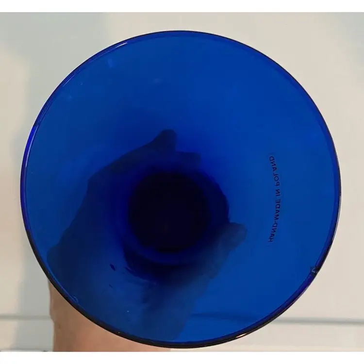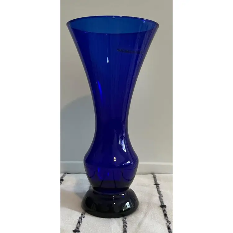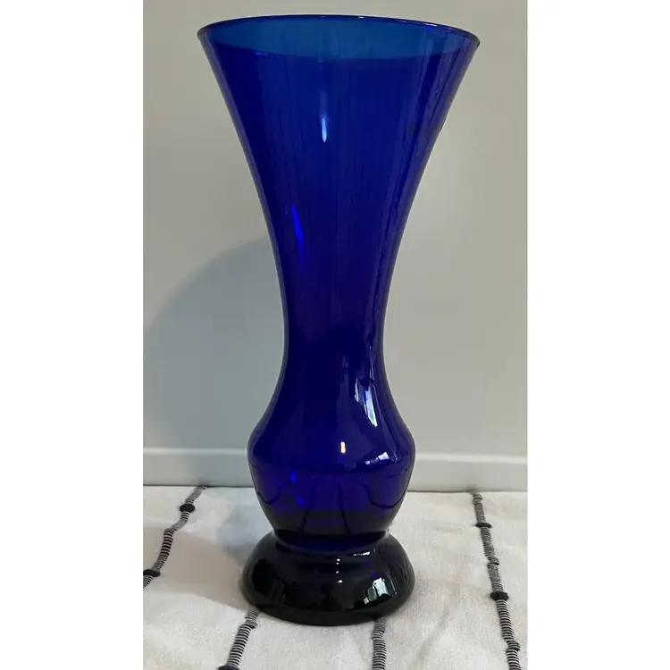 8 inch tall cobalt glass vase. No cracks but it does have a small chip on the underside of the lip - see pictures. Base is about 2 1/2 inches and the top opening is about 4 inches.