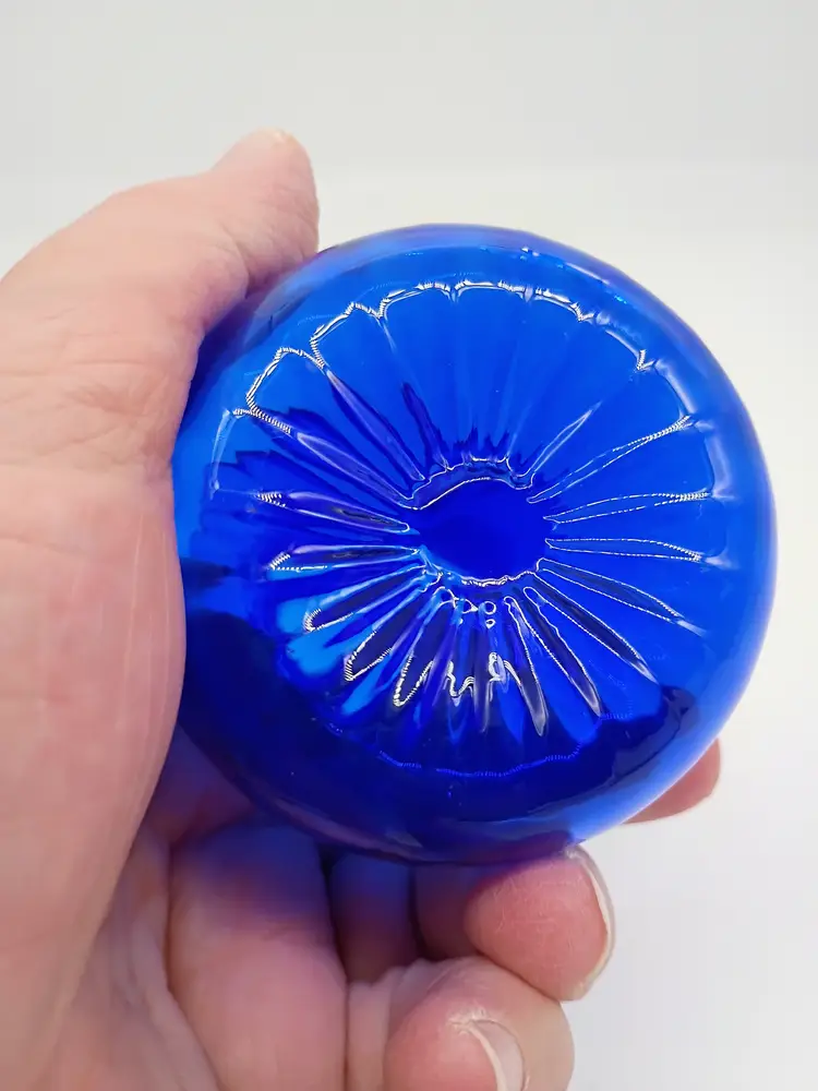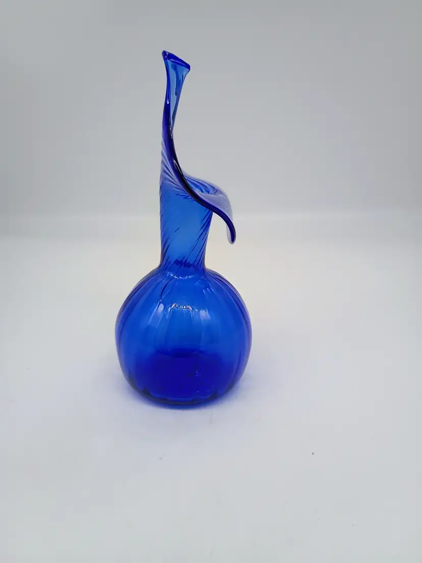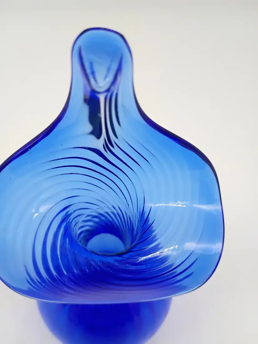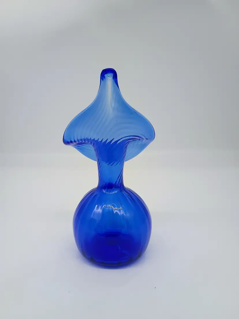 Cobalt Blue Hand Blown Art Glass Optic Swirl Jack-in-the-Pulpit Tulip Vase. This is 6 inches tall and 3 inches in diameter. This unmarked for maker or country of origin. Many artists have made this style vase over the last 70 years. This shows very little wear on bottom so I'm strongly suspecting it to have been made in last 20 years. This is preowned, Delicate thin glass. No chips cracks or flea bites. No hard water stains. Excellent condition. Ships USPS domestically and international Shipping globally