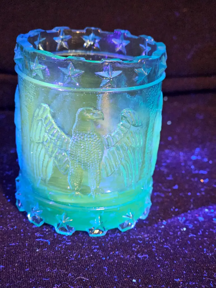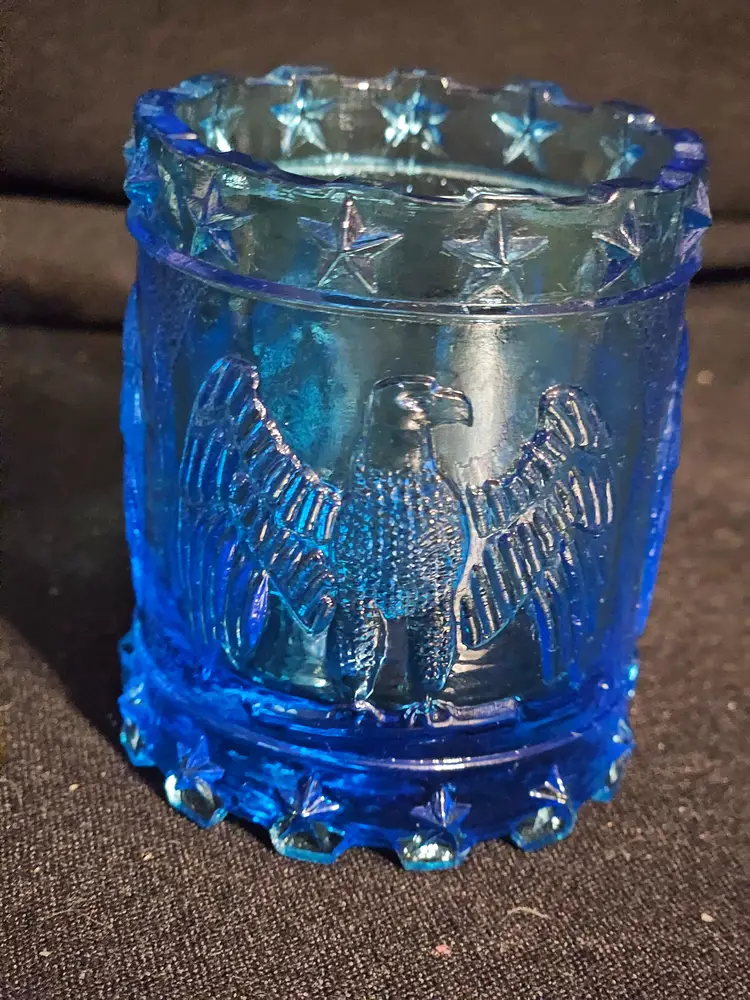 Maker: Kanawha Height: 2 1/2" Glows: Yes Description: Nice little cobalt blue glass toothpick holder with an eagle on all 4 "sides" and starts across top and bottom. It is in good condition with no chips or cracks.