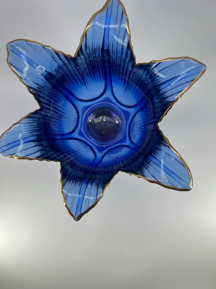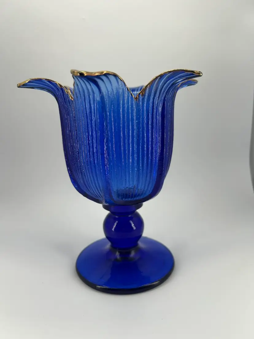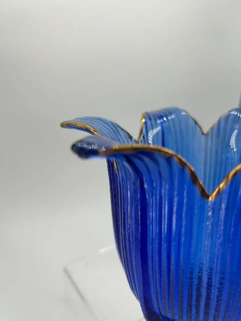 This piece is a cobalt blue ribbed glass vase featuring fluted petal like rim. The rim is accented with gold. It stands 7 inches tall and is 6 inches across the top. One petal is chipped as shown in pictures.