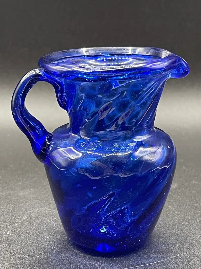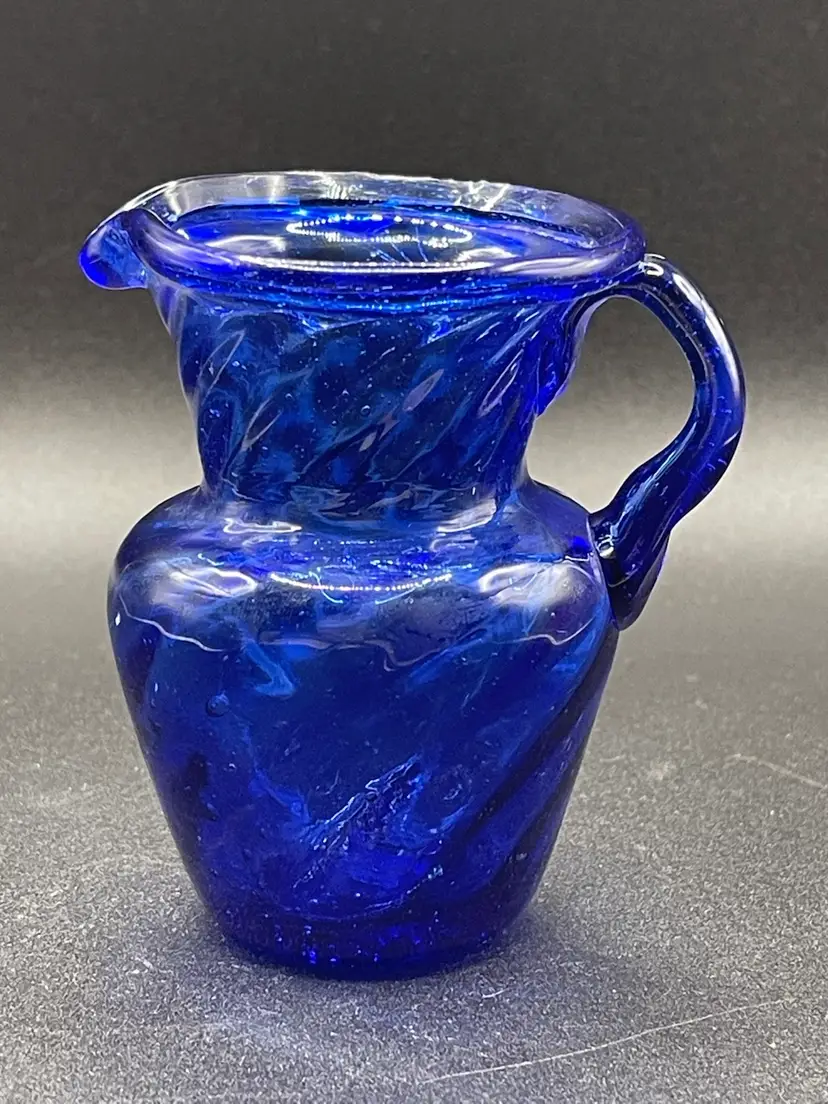 Cobalt Blue Swirled Hand Blown Glass Mini Pitcher