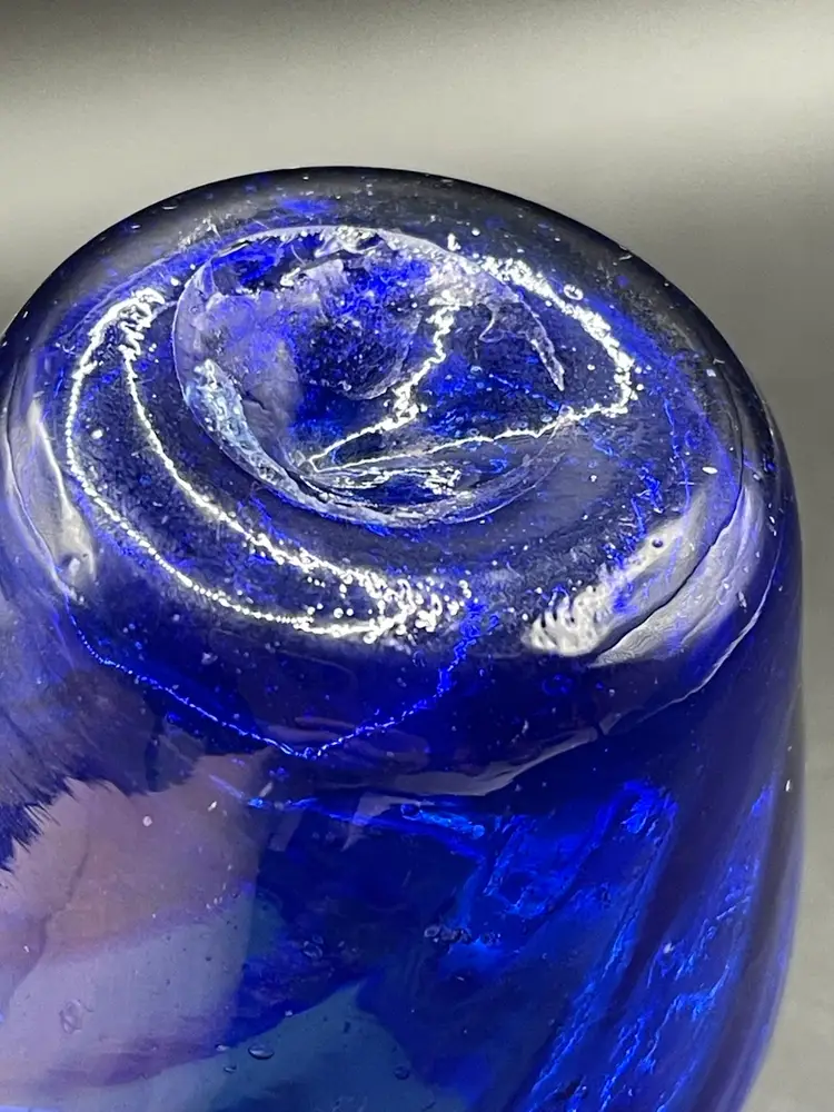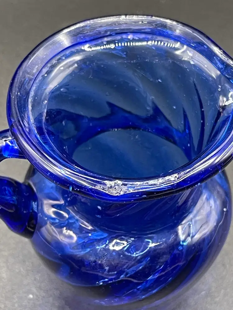 Mini. Cobalt blue swirled hand blown glass pitcher. This adorable little piece will add a fun pop of color to any space. This stands 3 and half inches tall. There is a rough spot in the right side of the rim that can be seen in the last photo. There are no other chips or cracks.