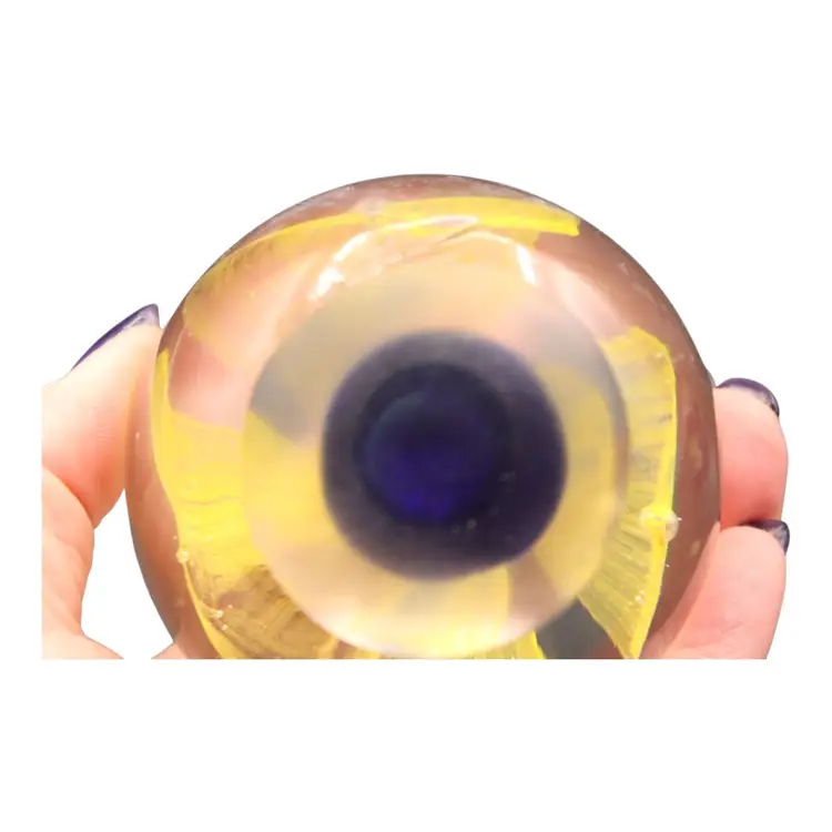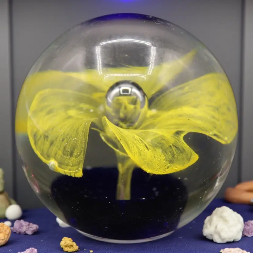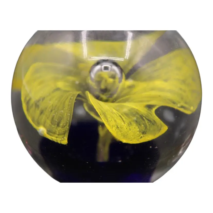 Cobalt Blue with Lacy Yellow Flower & Center Bubble Paperweight 2 1/2” Tall 1#1.5oz. No chips or cracks.