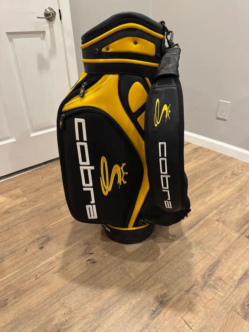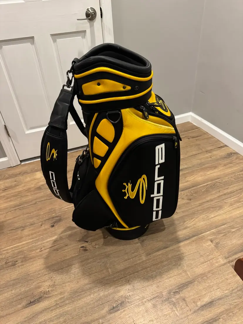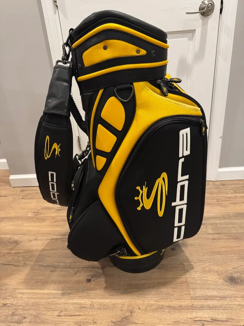 Cobra Staff Bag – Black & Yellow Cobra tour-style staff bag in a bold black and yellow colorway with bright, vibrant Cobra logos throughout. Features multiple pockets and sleeves for organized storage. Sturdy, high-quality construction with a true staff bag look and feel. Includes original rain cover. Clean, sharp, and ready for the course or display.