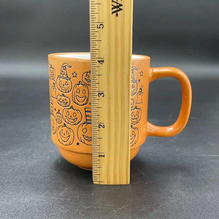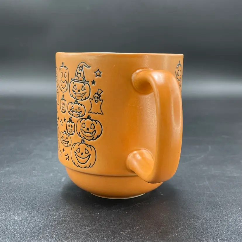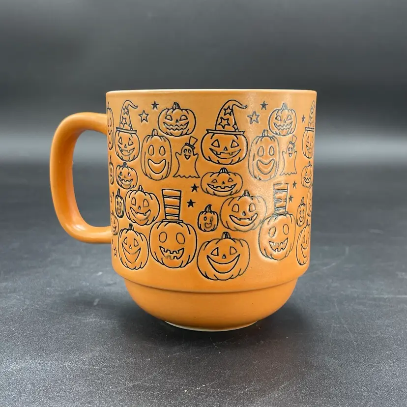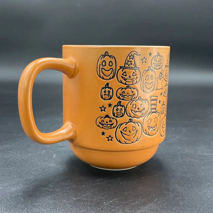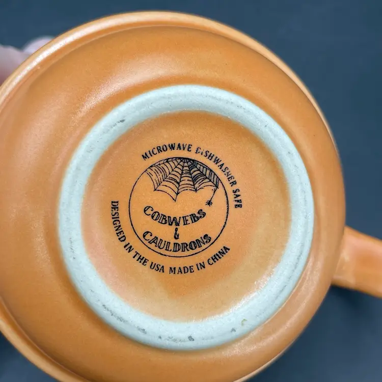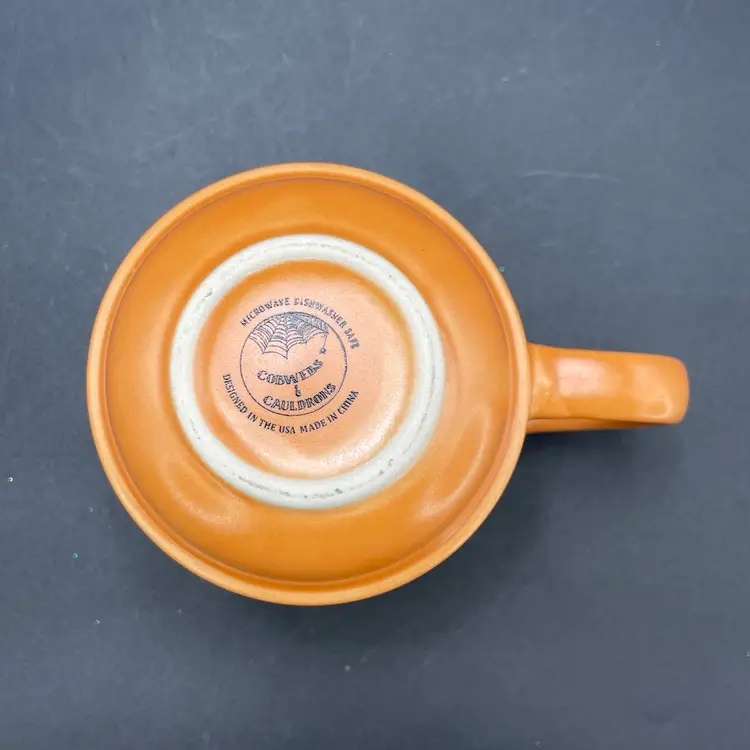 This is a Cobwebs & Cauldrons stoneware Halloween coffee mug with a Jack O'Lanterns pattern. Measures approximately 4" tall x 3.5" across and holds approximately 16fl oz. No chips or cracks.
