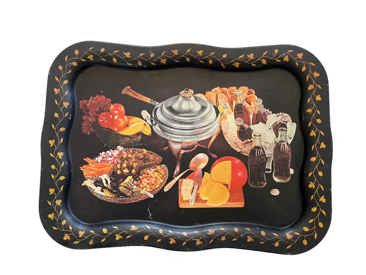 Fantastic TV tray from the 1950s. Coca-Cola Fondue Party Graphics. This tray is metal and the design is painted on. 18.5" x 13.5" There are a couple flaws like scratches and bubbled up paint on the tray.