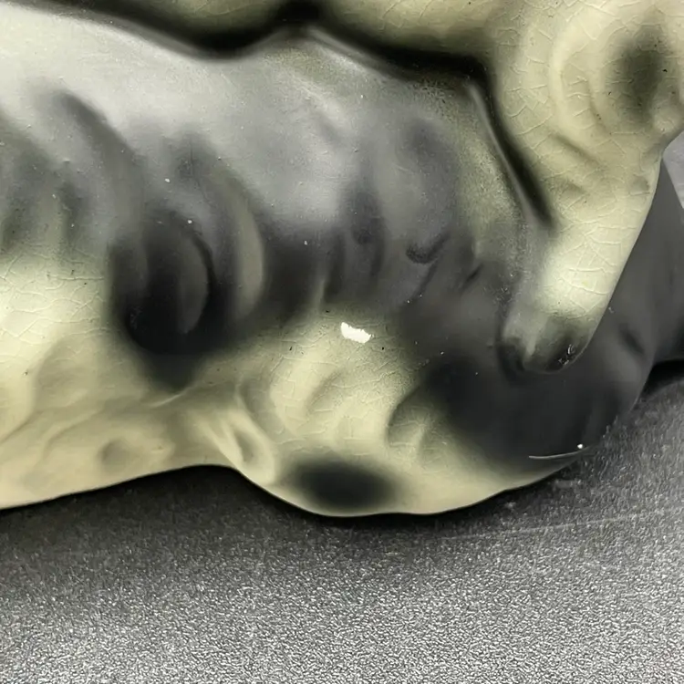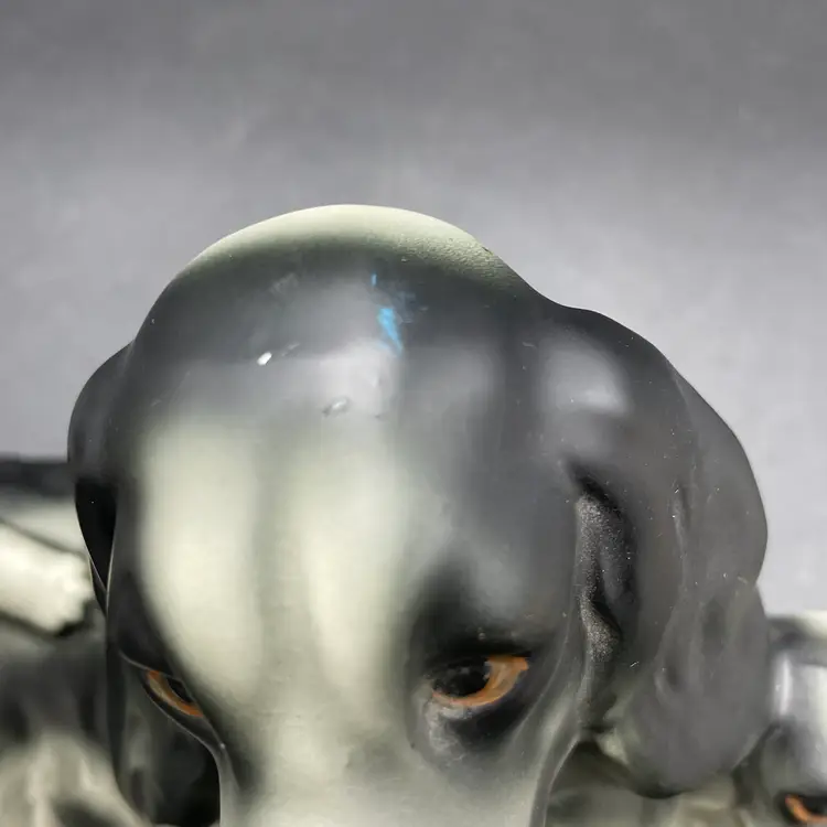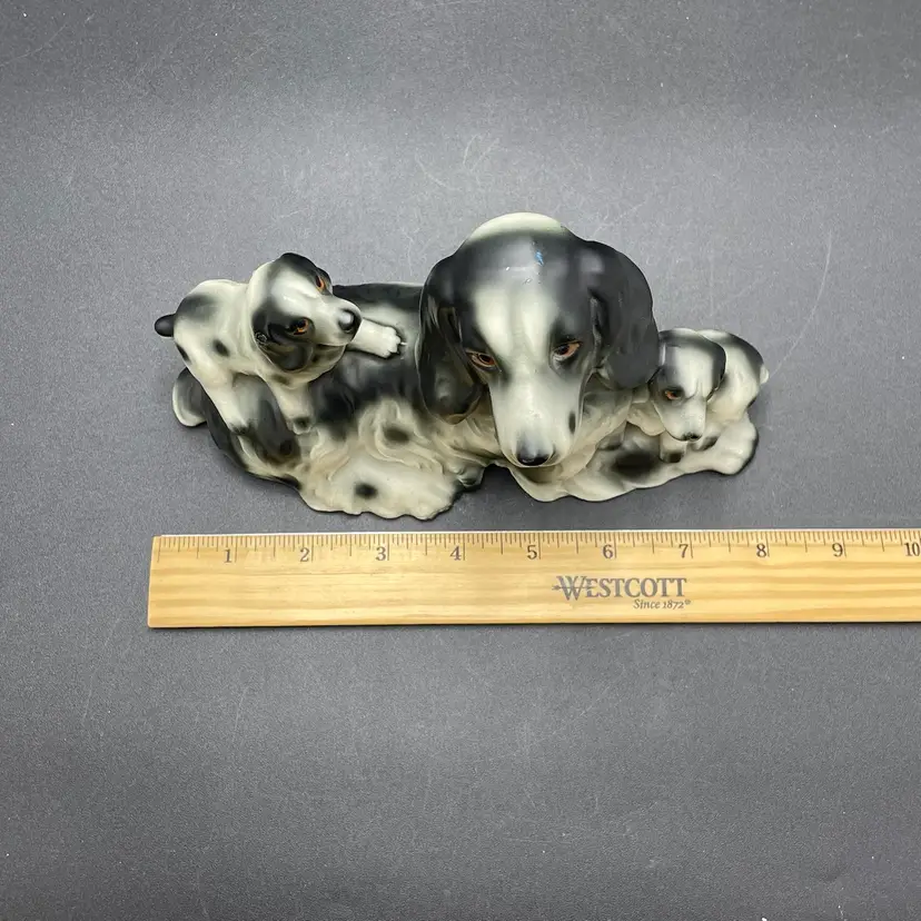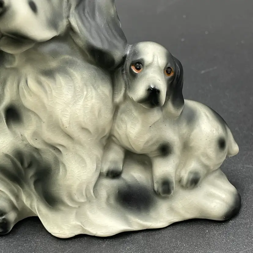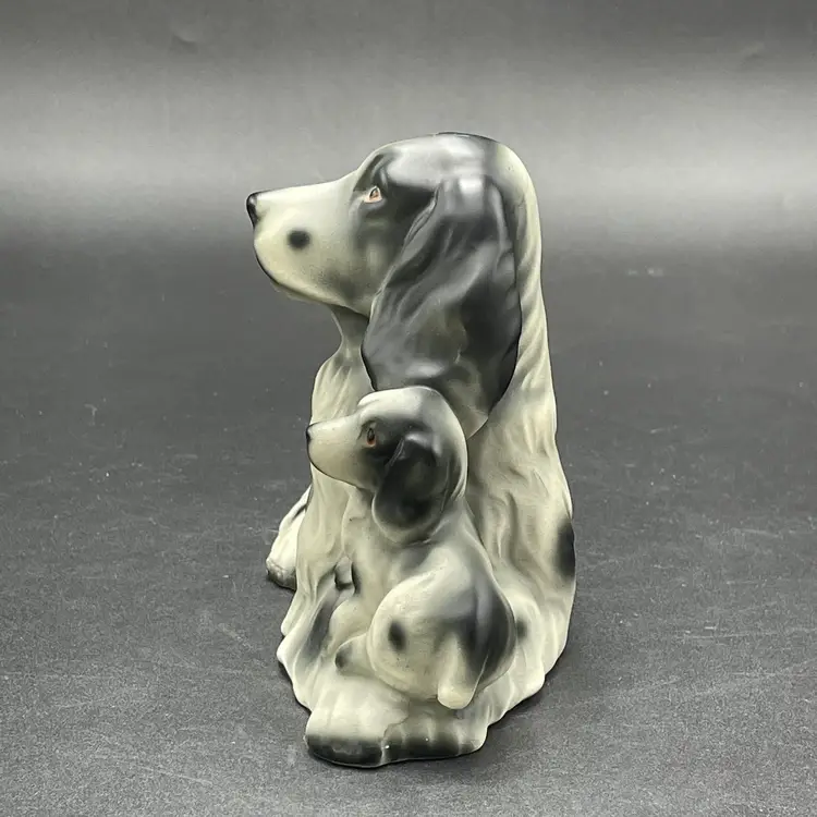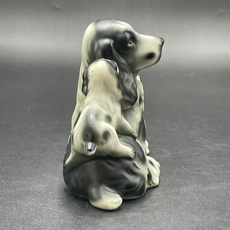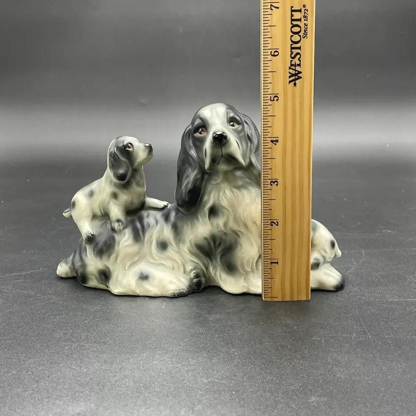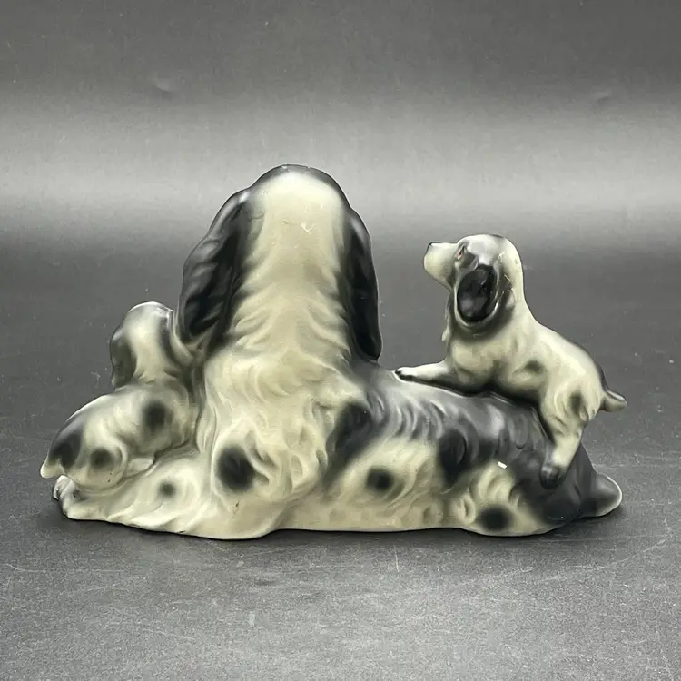 This is a vintage ceramic figurine depicting a momma Cocker Spaniel dog with her two puppies. Measures approximately 4.5" tall x 8" long. There is a paint chip on one side and a blue mark on top of the mother's head. No other major flaws.