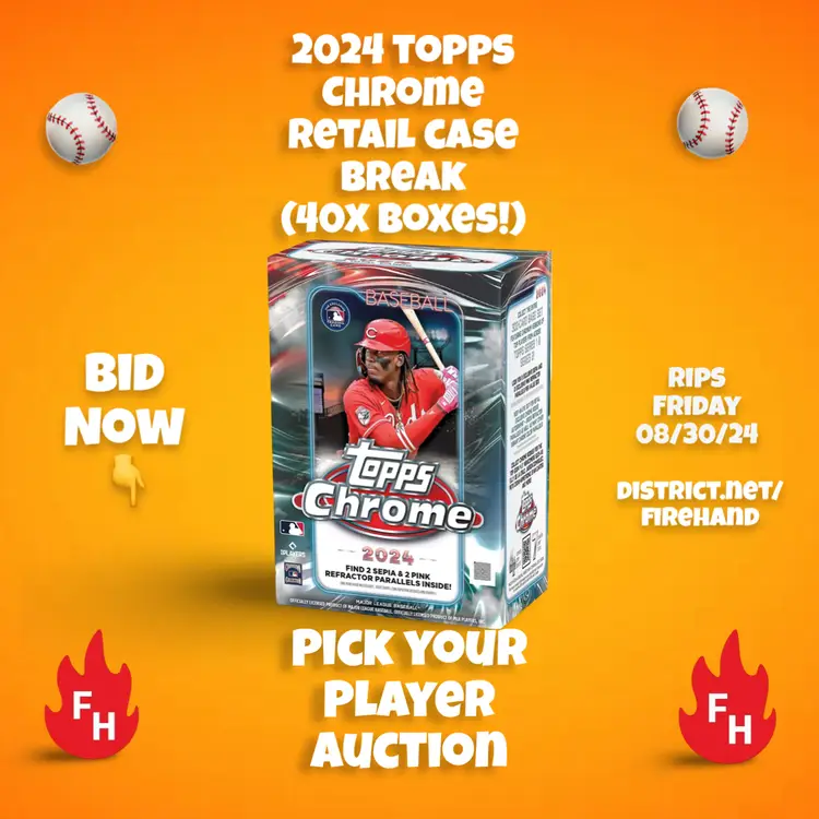 You are bidding on all the cards of the player listed in the title in this RETAIL Case (40x Blaster Boxes!) of 2024 Topps Chrome Baseball Cards. Auctions end Thursday 8/29/2024 and case rips on Friday 8/30/24. Opening will be viewable & simulcast on Firehand Cards District as well as YouTube. US Shipping is $5.00 for your first auction spot won and only $.25 per additional spot won after that! Any spot won where no cards of the player are found in the box will receive a bonus card or pack from the Firehand collection. Any multi-player base cards will be split as fairly as possible between the spots of the players depicted on the card. Any hit pulled (On the Spot, Sketches, Hidden Gems etc) of a player who is NOT listed in the auction will be assigned by draw between all participants. Any dual or multi-player #'d or auto cards featuring multiple players will be assigned live between the spots depicted on the card.