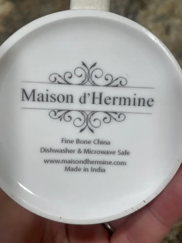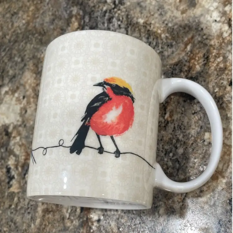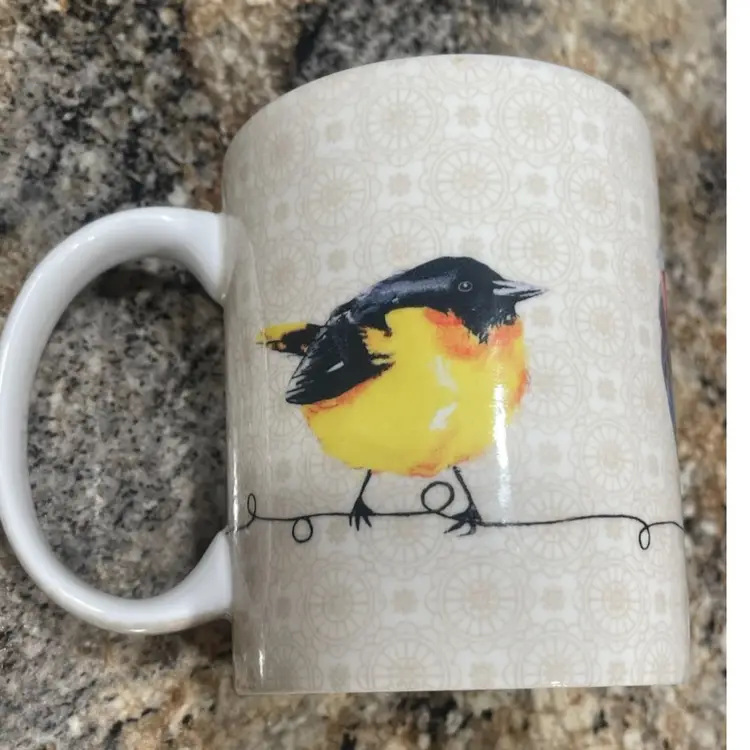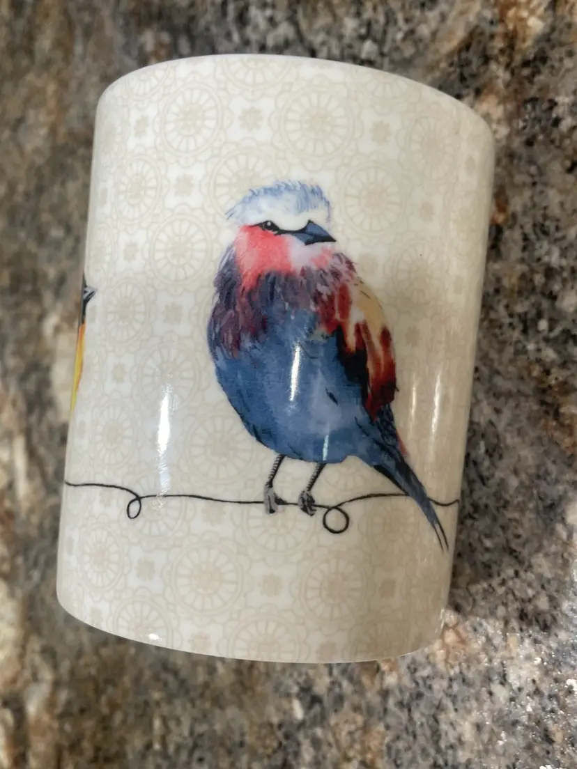 This mug is part of the 'Birdies On Wire' collection by Maison d'Hermine, a home goods brand known for nature-inspired designs. The collection features stylized bird illustrations on various household items including textiles and ceramics, and was likely produced within the last decade.