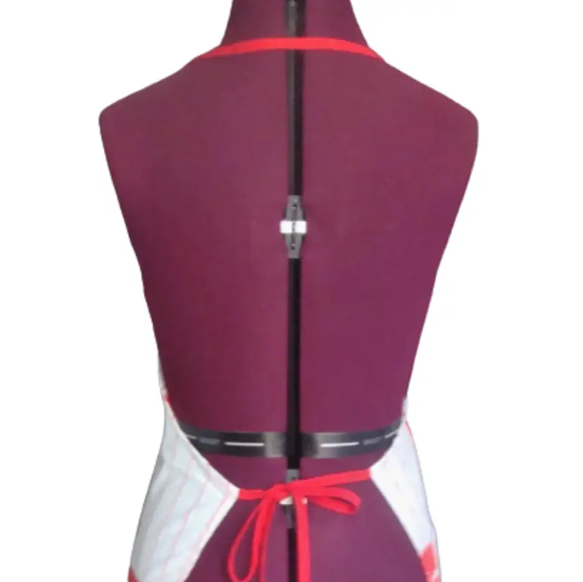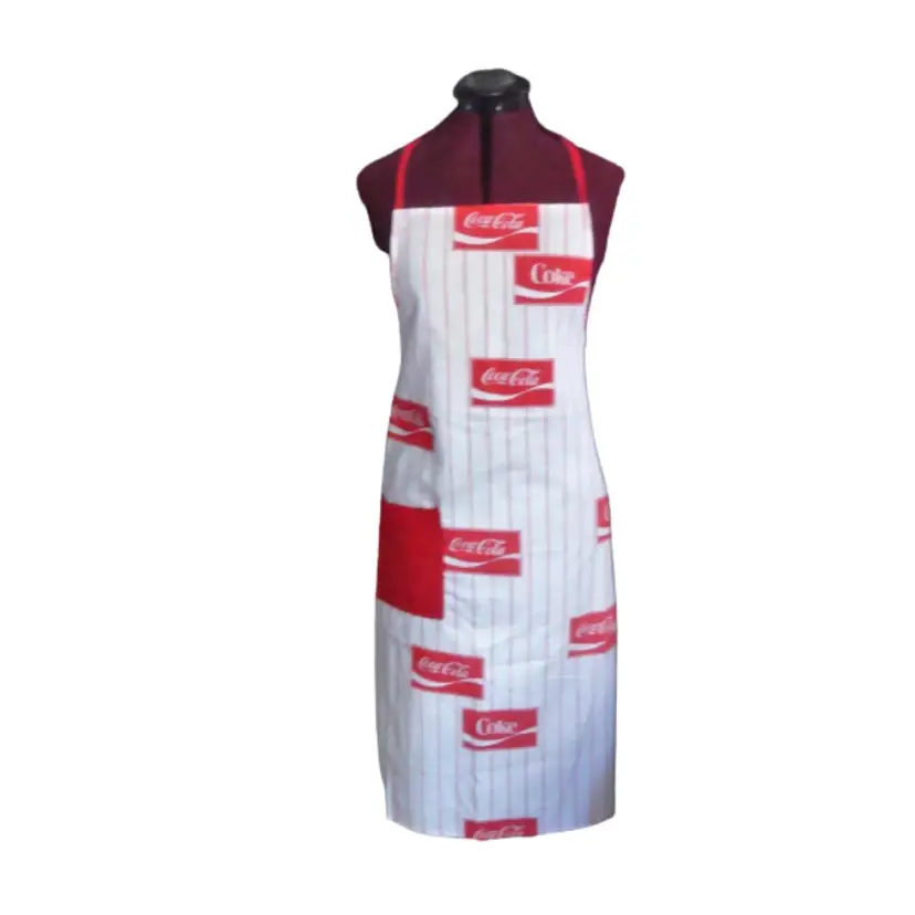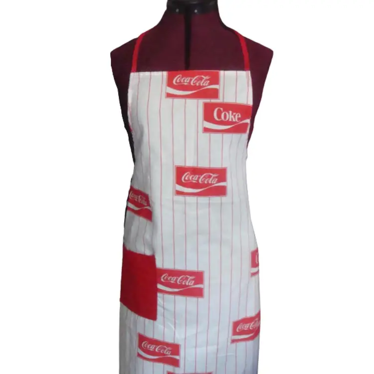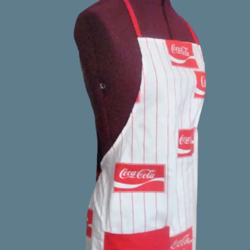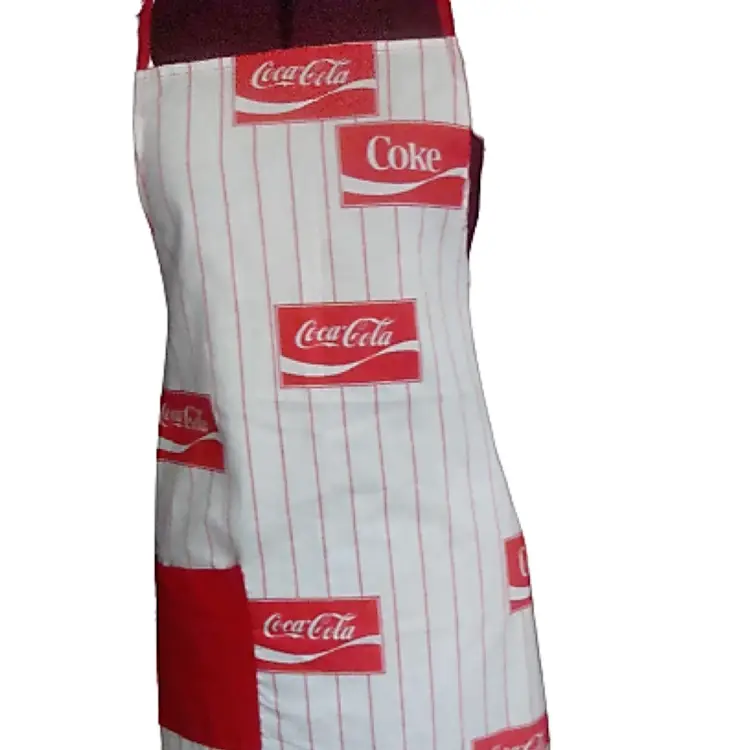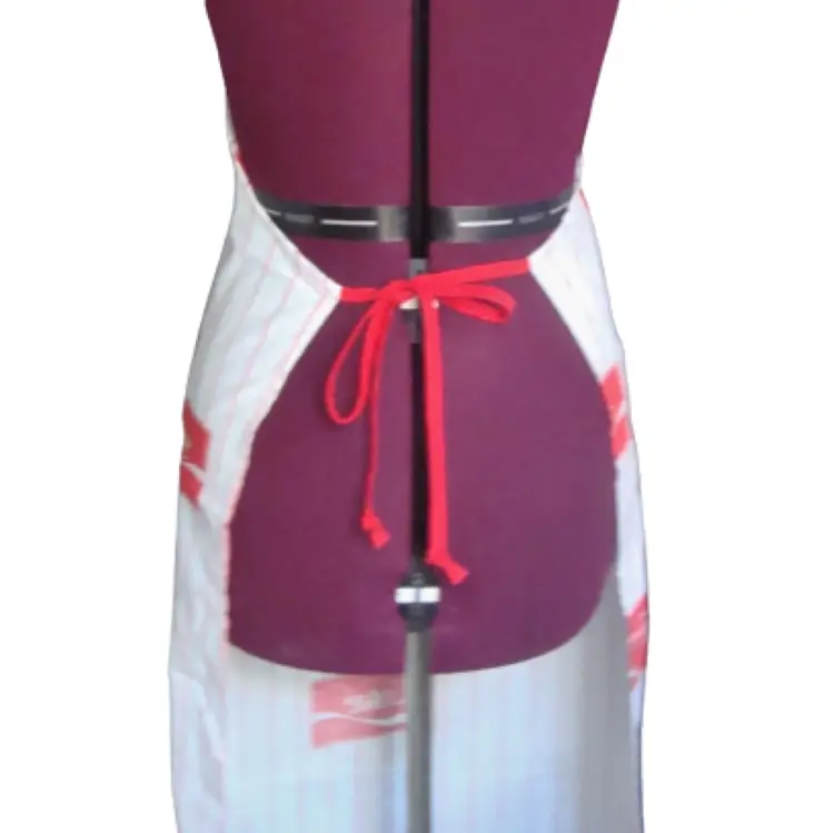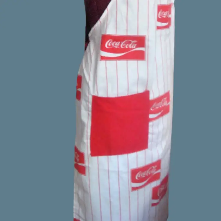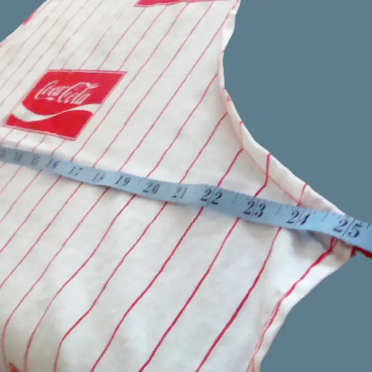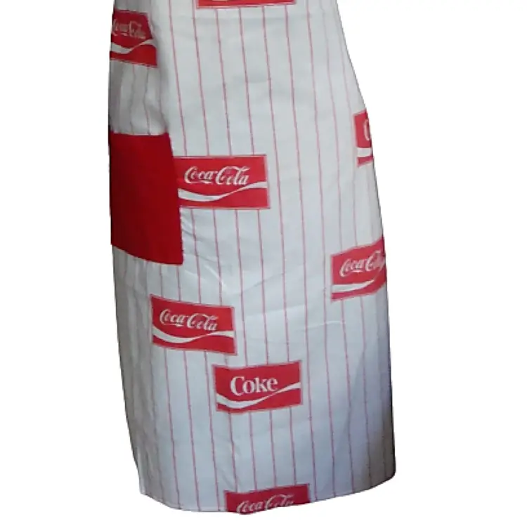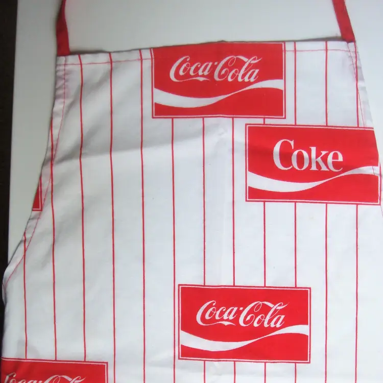 COKE Coca Cola logo full length apron White with red pin stripe Lightweight, handmade(?) Material: cotton or linen Runs small. Bib width: 10" Length: 36" approx. Best guess, 70s/80s. Possibly never used.