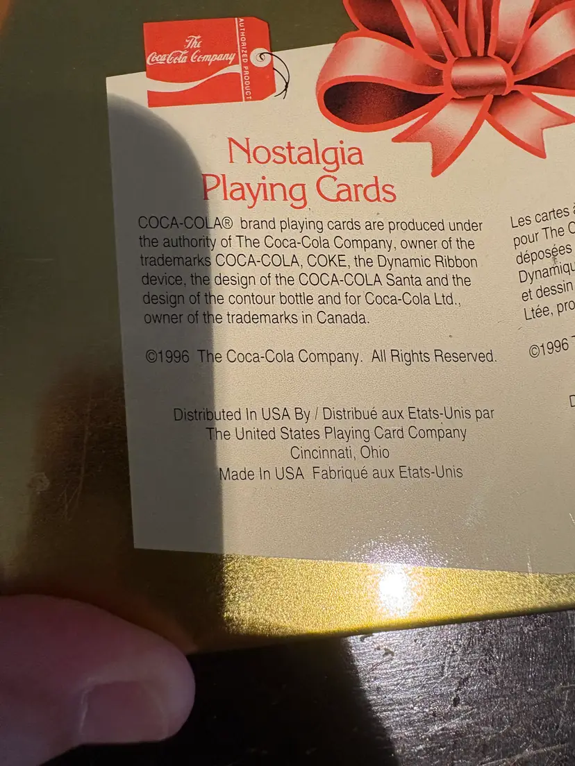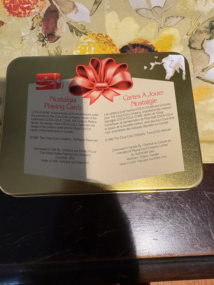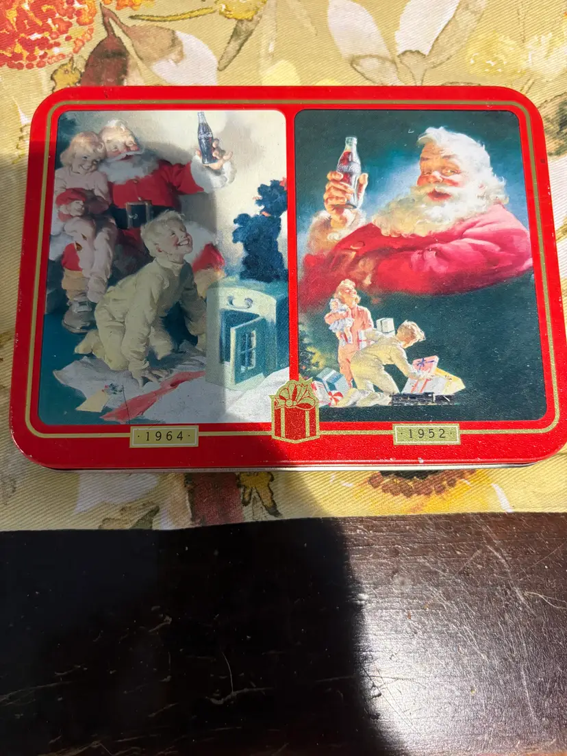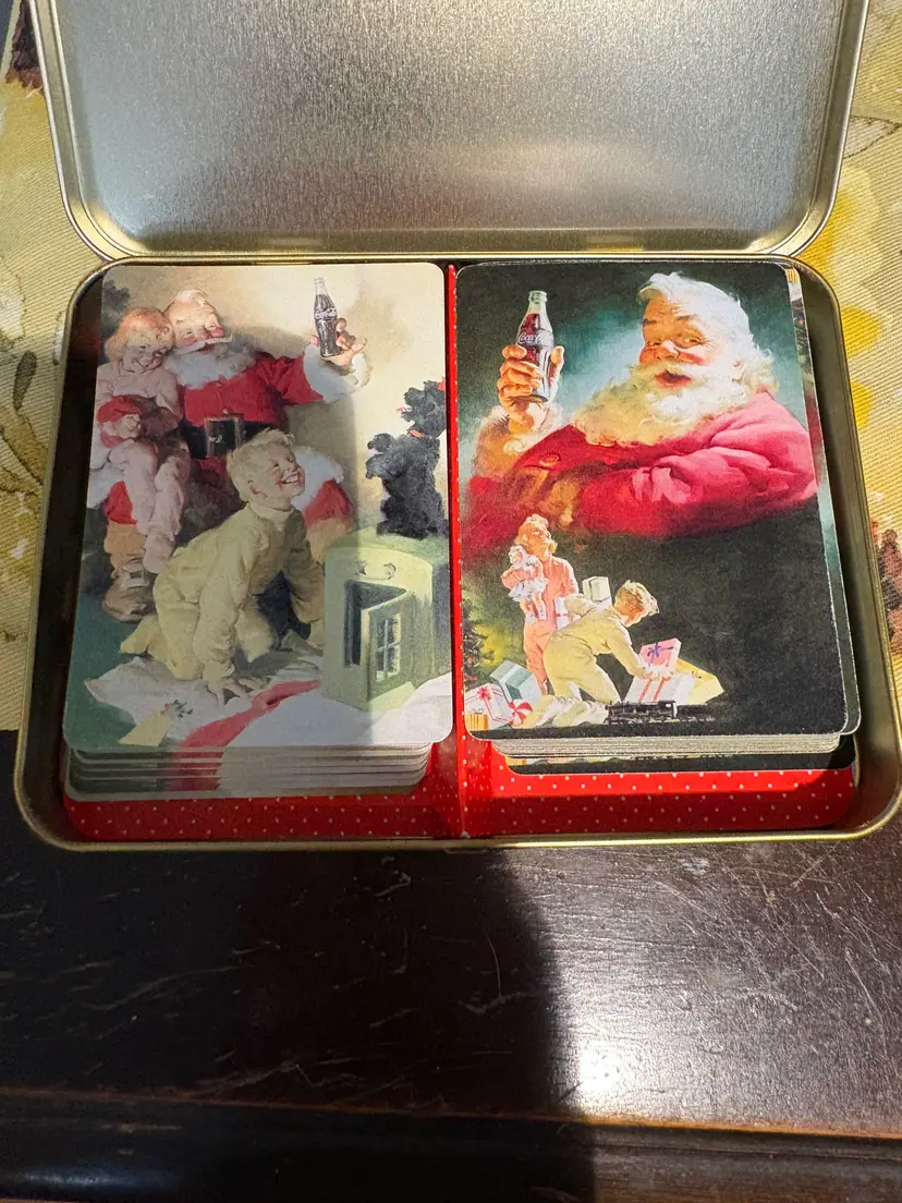 Coca-Cola collection with these festive 1996 Santa Claus Christmas Playing Cards. This set of cards are not sealed. The playing cards come housed in a classic tin container, making it a perfect collectible or holiday gift for enthusiasts of Coca-Cola memorabilia. The deck's theme revolves around the soda brand, merging the timeless appeal of Christmas with the vintage charm of Coca-Cola advertising. Add a touch of holiday cheer and a nod to classic advertising with this charming set.