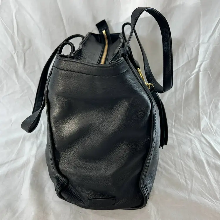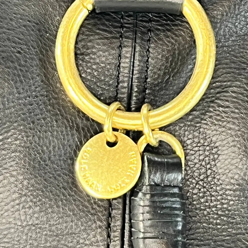 Classic Cole Haan black leather shoulder bag featuring soft pebbled leather, gold-tone hardware, and a timeless everyday silhouette.