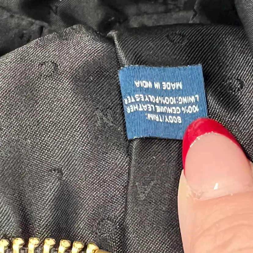 Details: Zip-top closure Fabric-lined interior with slip pocket Genuine leather exterior Gold-tone hardware Made in India