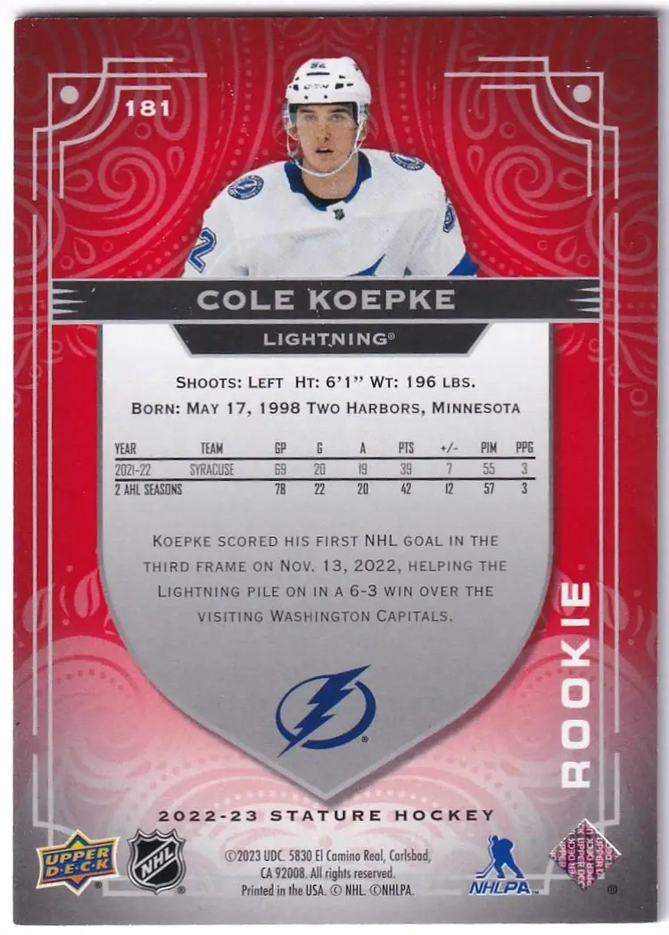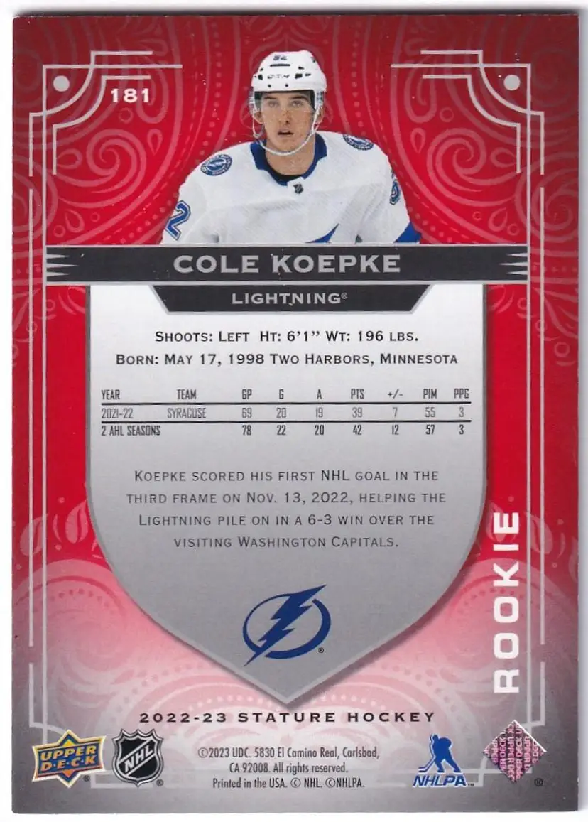 2022-23 Upper Deck Stature Photo Variant Red #181 Cole Koepke Tampa Bay Lightning Print Run - 33