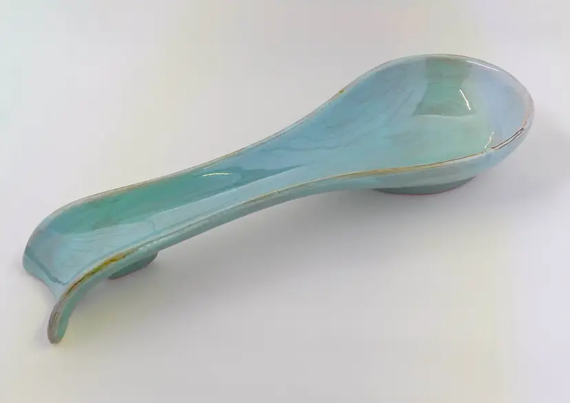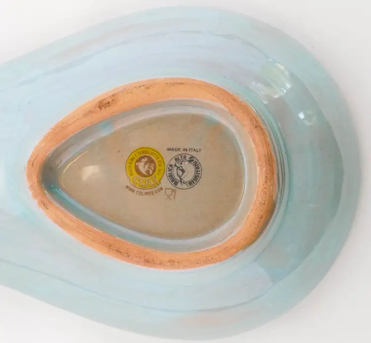 A glossy ceramic spoon rest in a long, flowing shape. The glaze is a vibrant, iridescent turquoise and blue with undertones of brown and gold, giving it a mottled, unique appearance. The piece is made of terracotta, visible on the unglazed bottom. A stamp on the base identifies the maker as "Coli" from Italy. In good condition, but does have a small flea bite on the outer front edge revealing the red terracotta. The approx. size is 11" long x 4" wide.