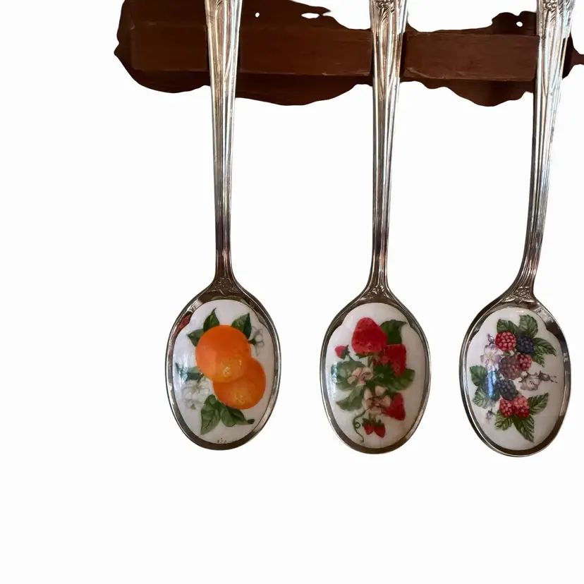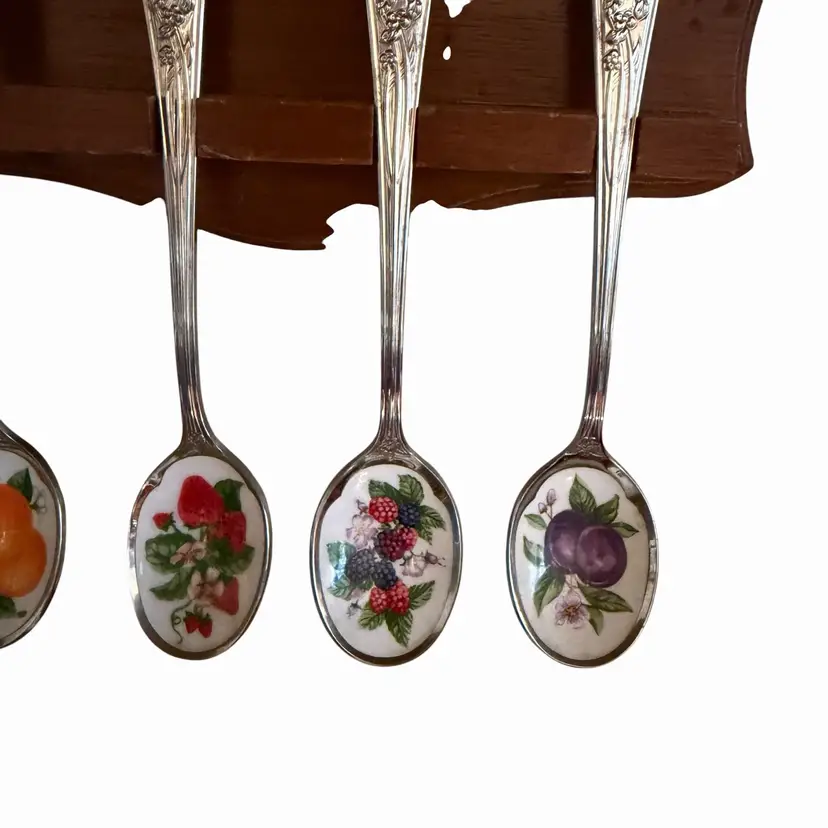 Collectible Avon 1981 Fruit Jelly Spoons Stainless Steel Porcelain Enamel Set.