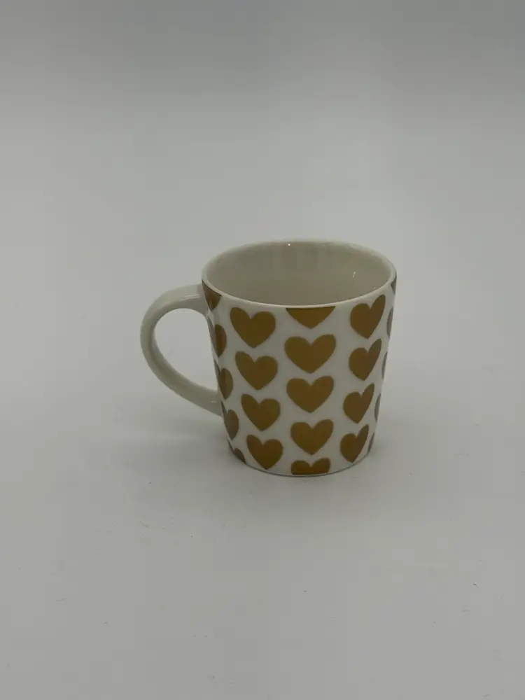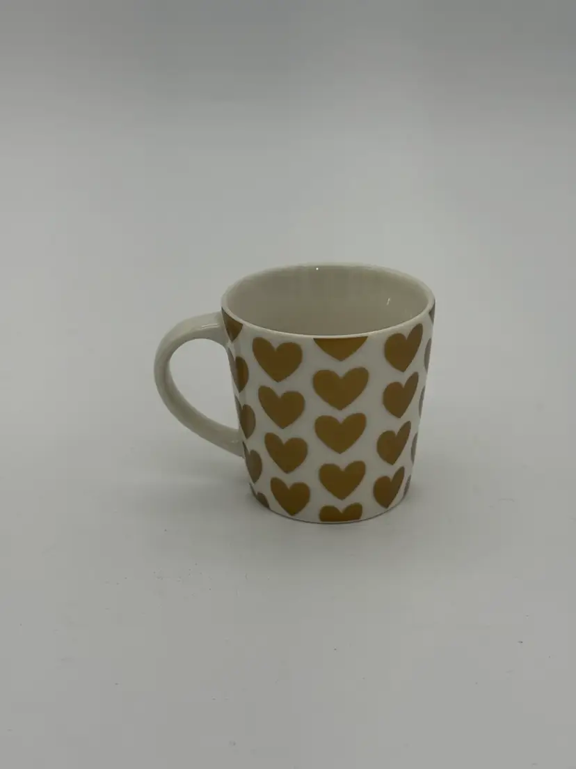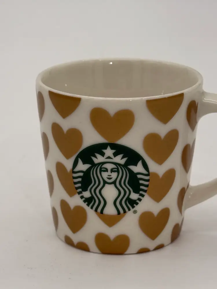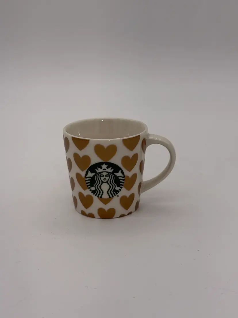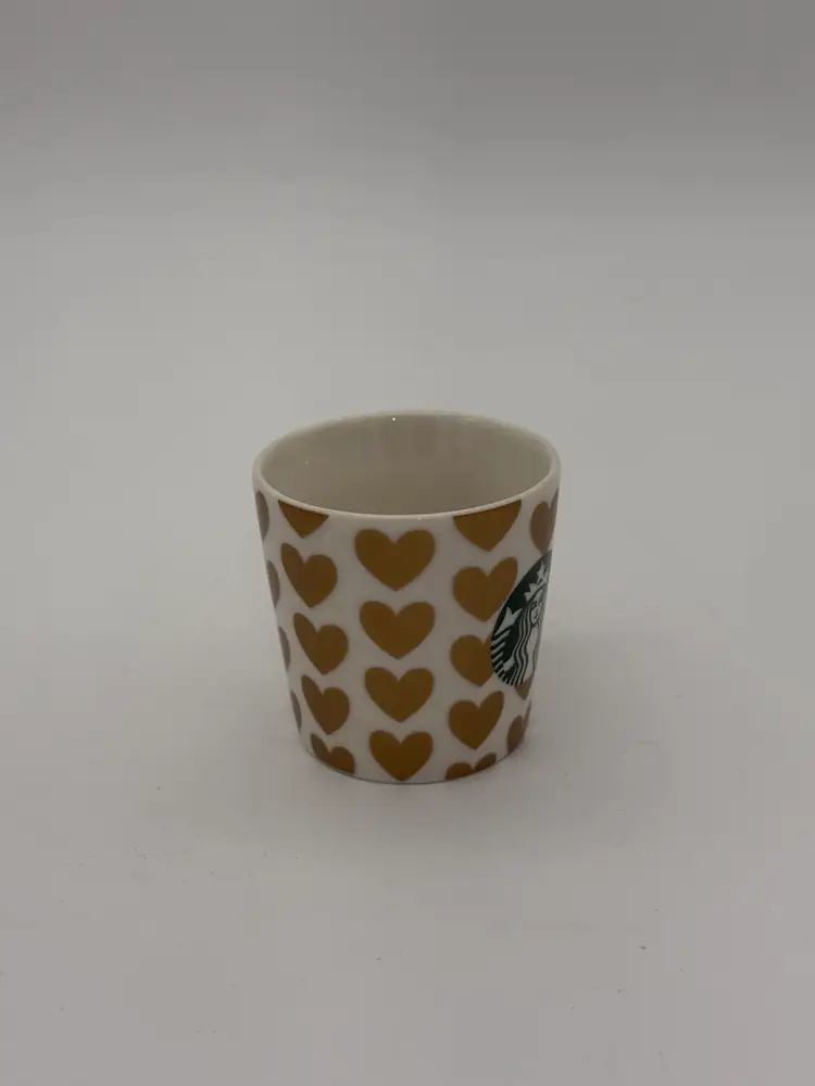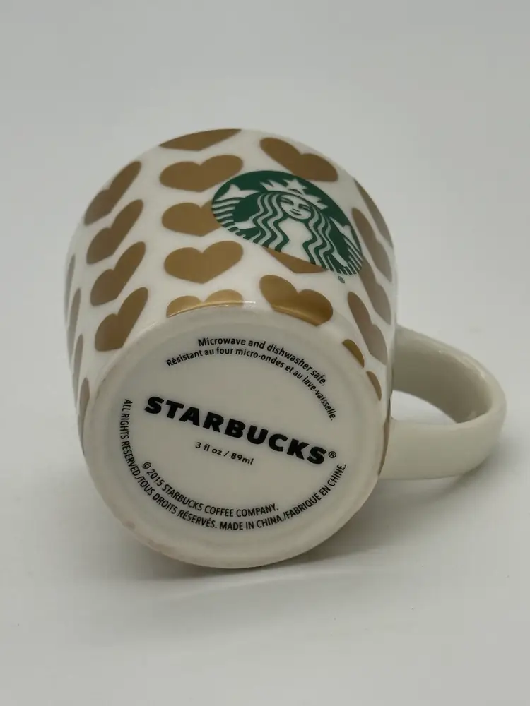 The Collectible Classic 3oz Starbucks Gold Hearts Siren Demitasse Espresso Shot Mug Cup with handle is a limited edition espresso coffee cup featuring a white background with gold and green accents. Created in 2015, this original Starbucks advertising piece is a collector's item for fans of the coffee and tea theme. Made in China, this cup showcases the iconic Starbucks brand in a unique and stylish design, perfect for any coffee lover's collection. In excellent lightly used condition!