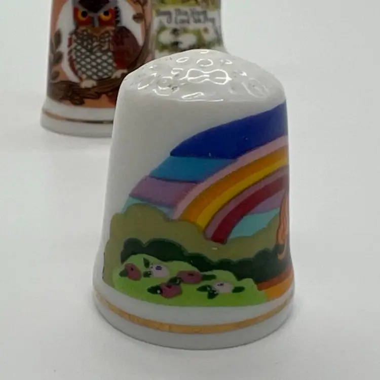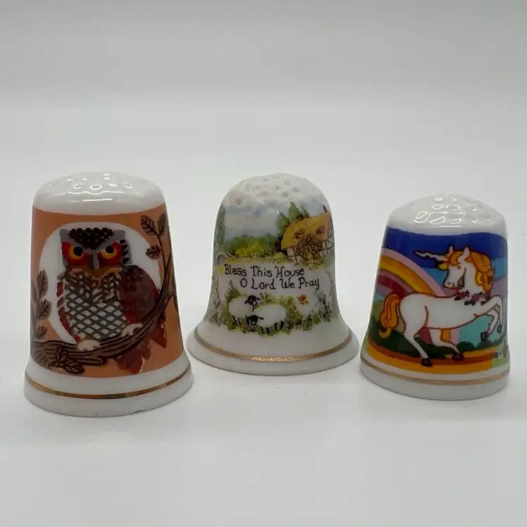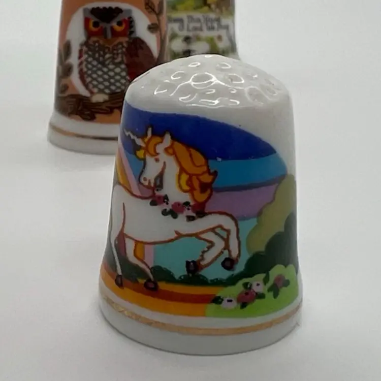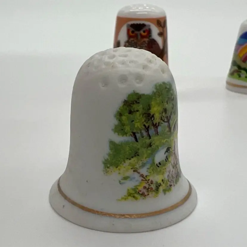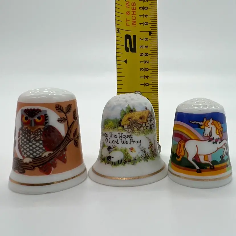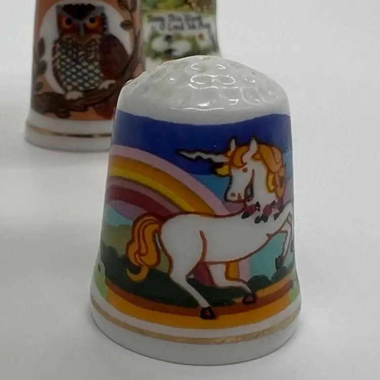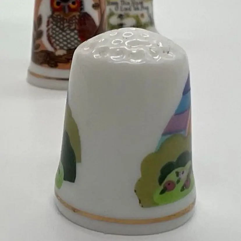 This small collection of thimbles by Creative Creations is in great condition. They measure about an inch tall. The owl has a small chip as pictured. No other damage.