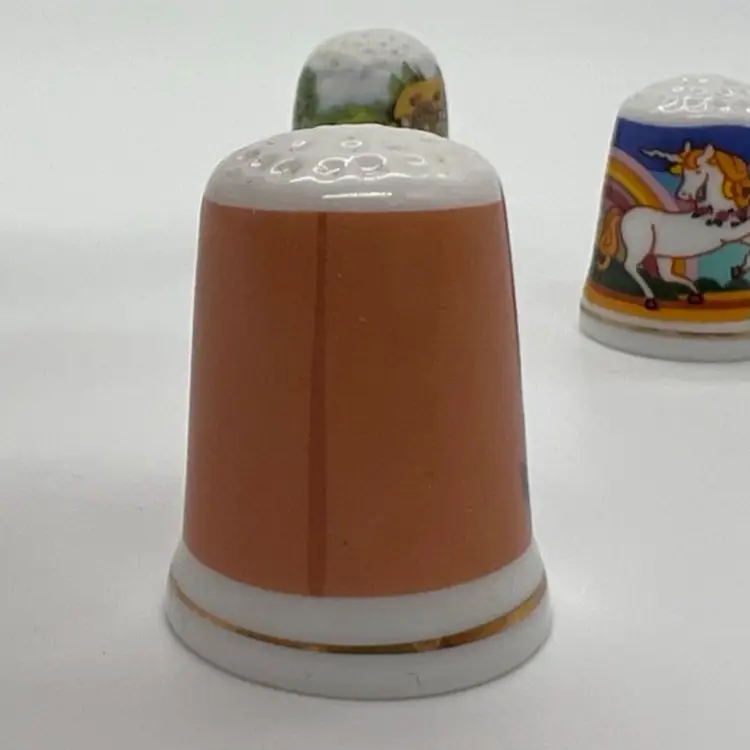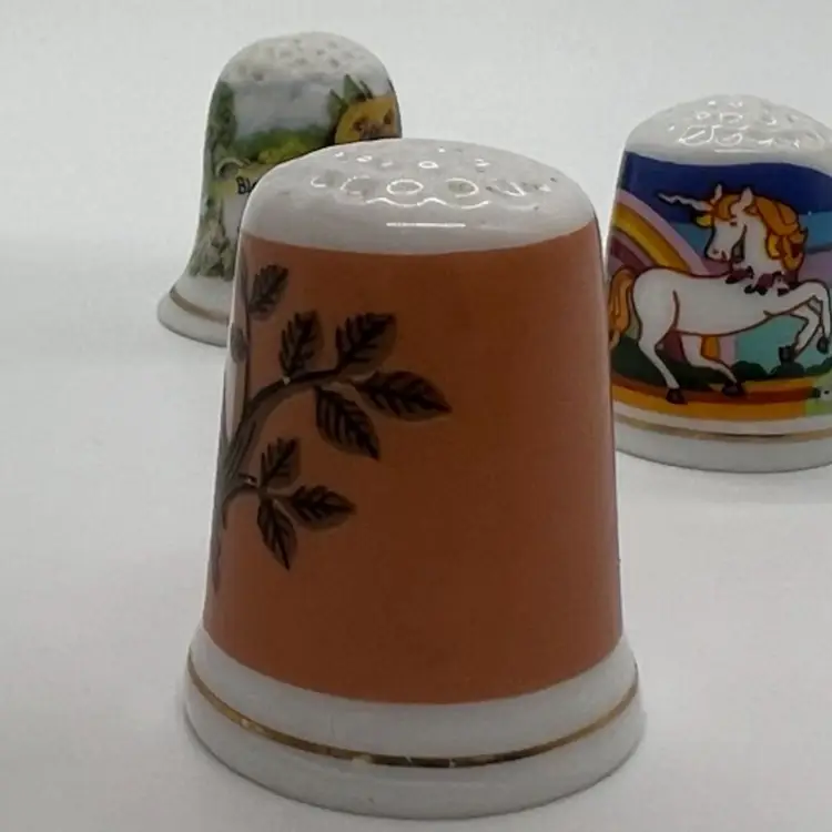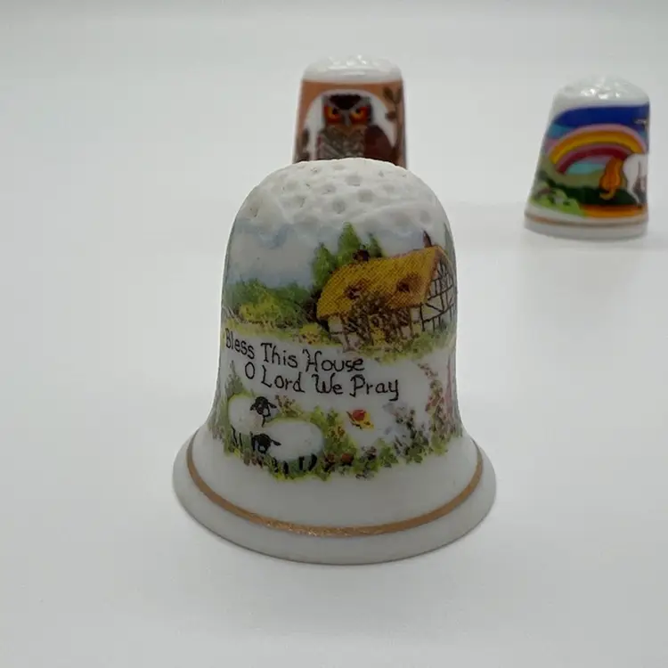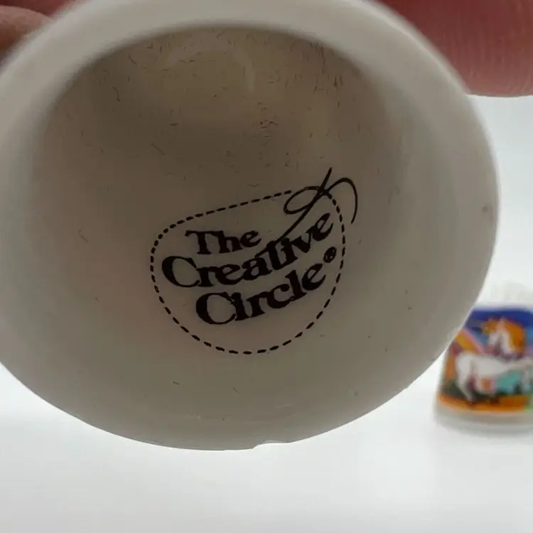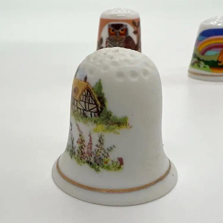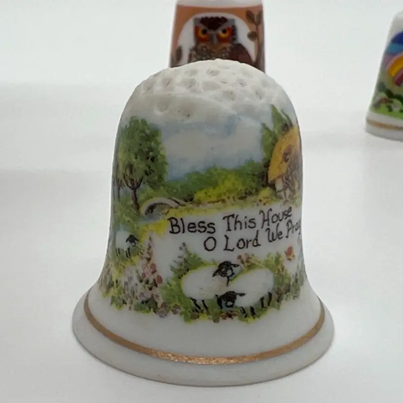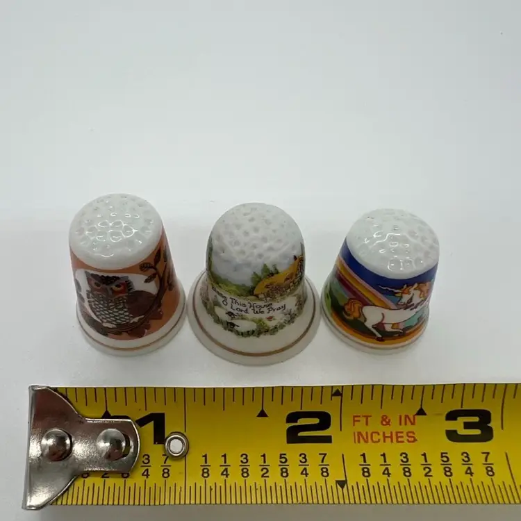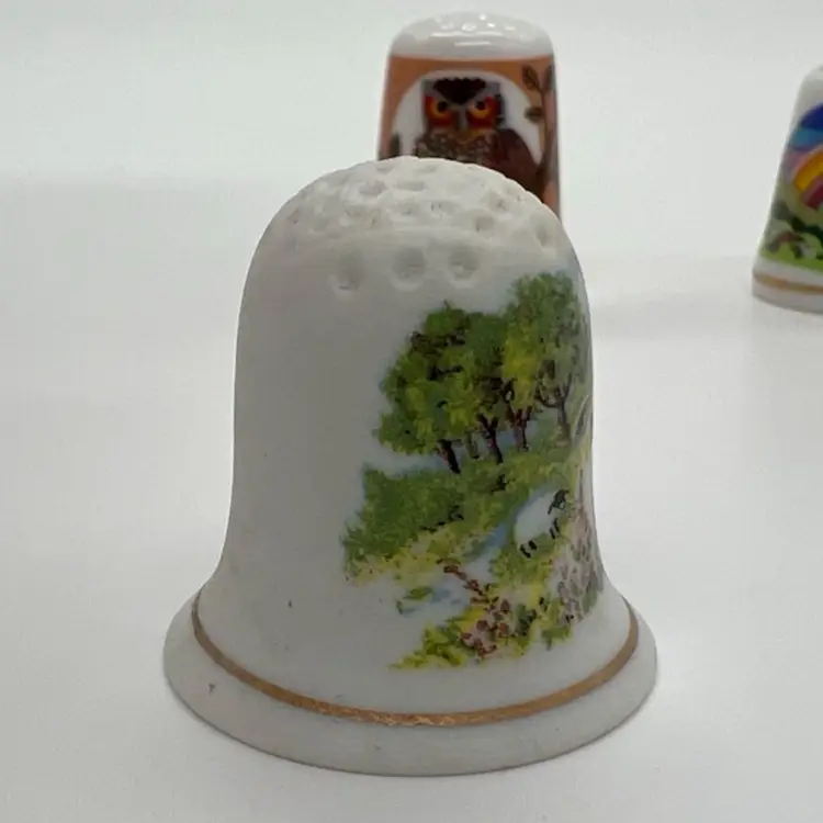 This small collection of thimbles by Creative Creations is in great condition. They measure about an inch tall. The owl has a small chip as pictured. No other damage.