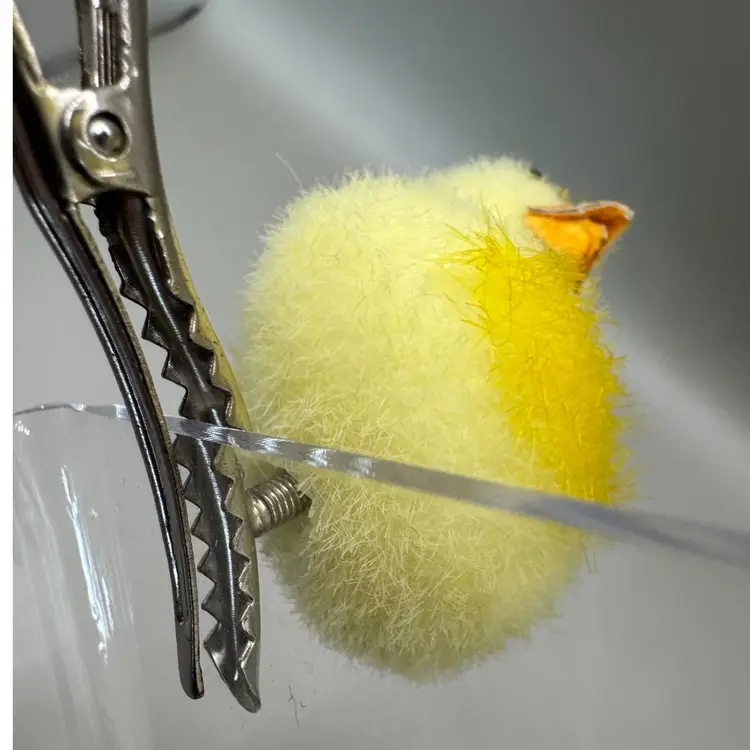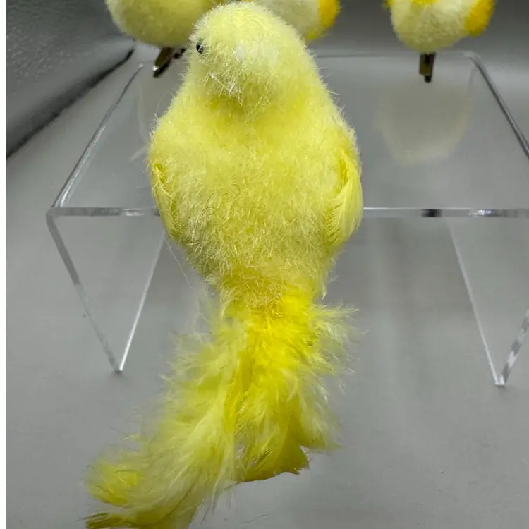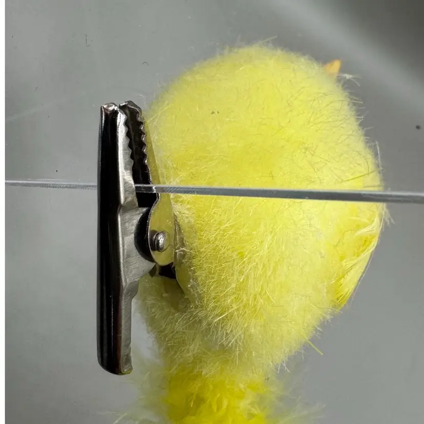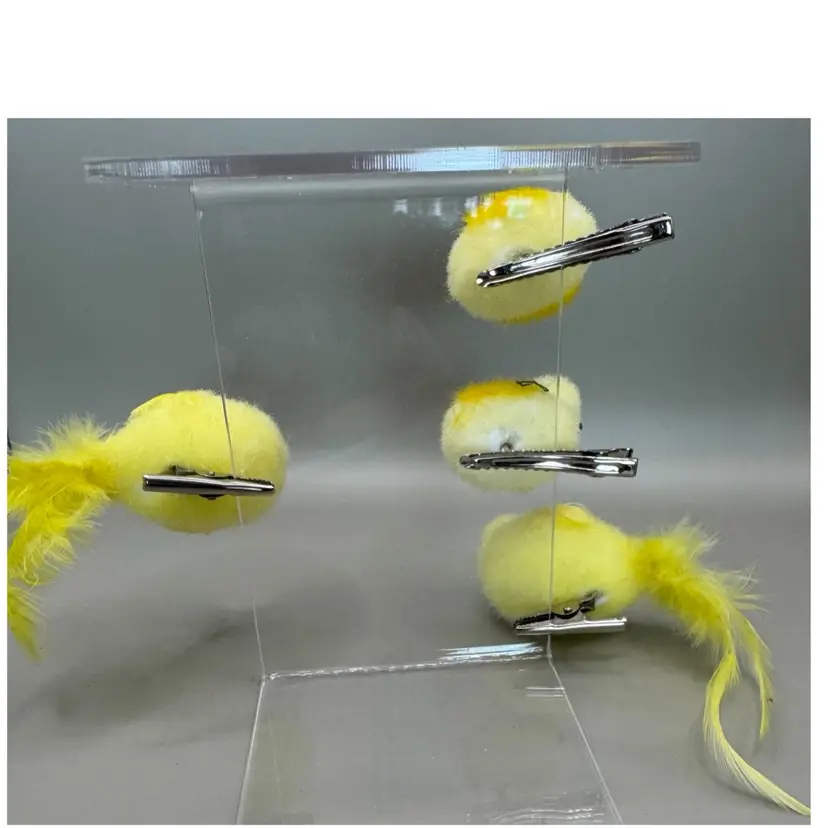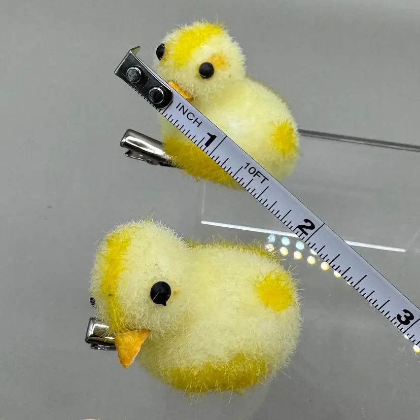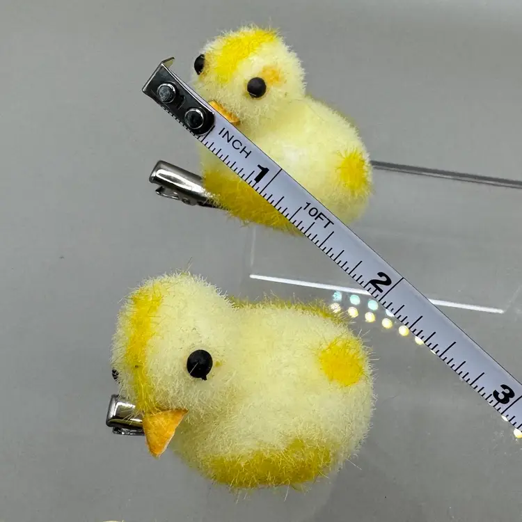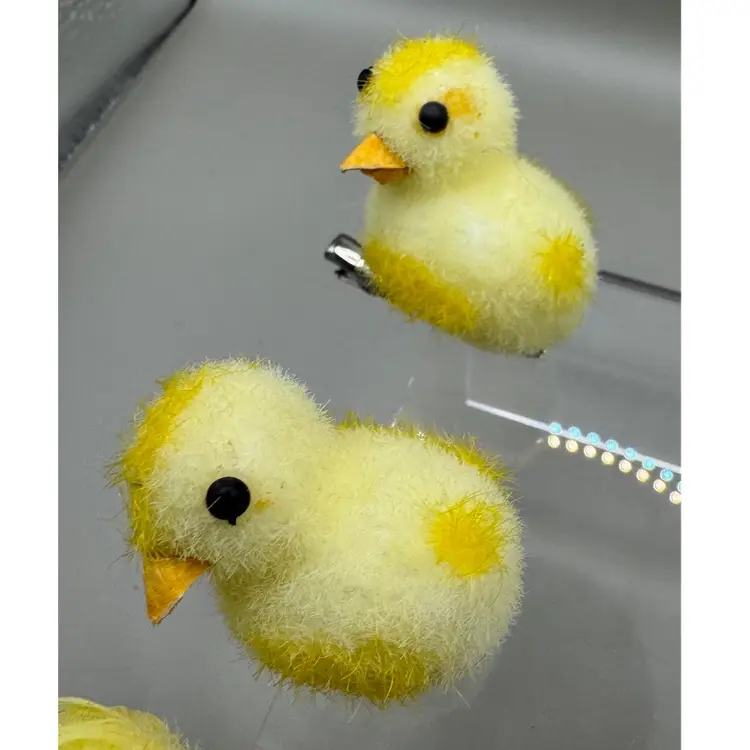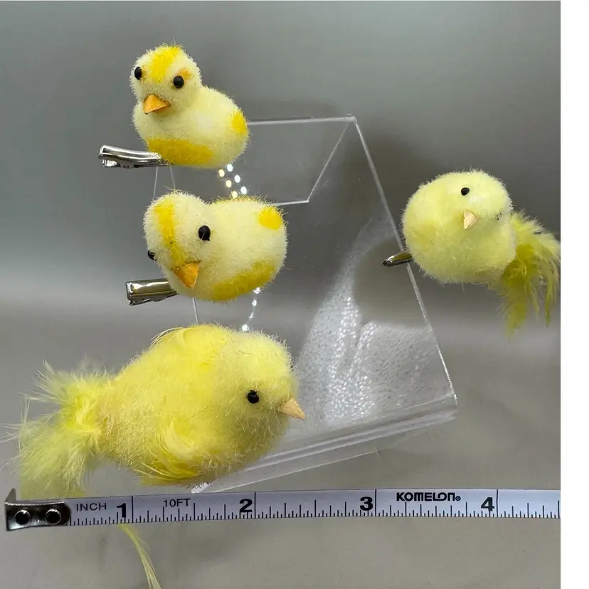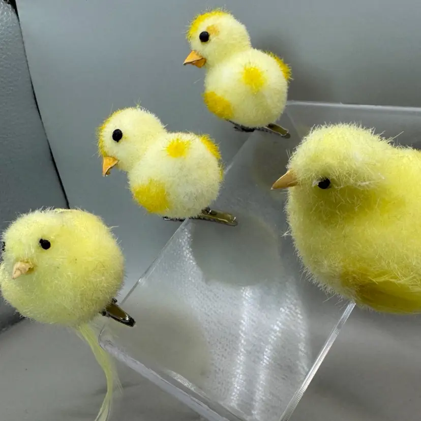 Very fun collection of Easter chicks. Beeks are a strong cardboard material. Black eyes are plastic. The spring loaded clamps are very strong and sturdy. I especially love the yellow spots. Condition of chicks is very good.