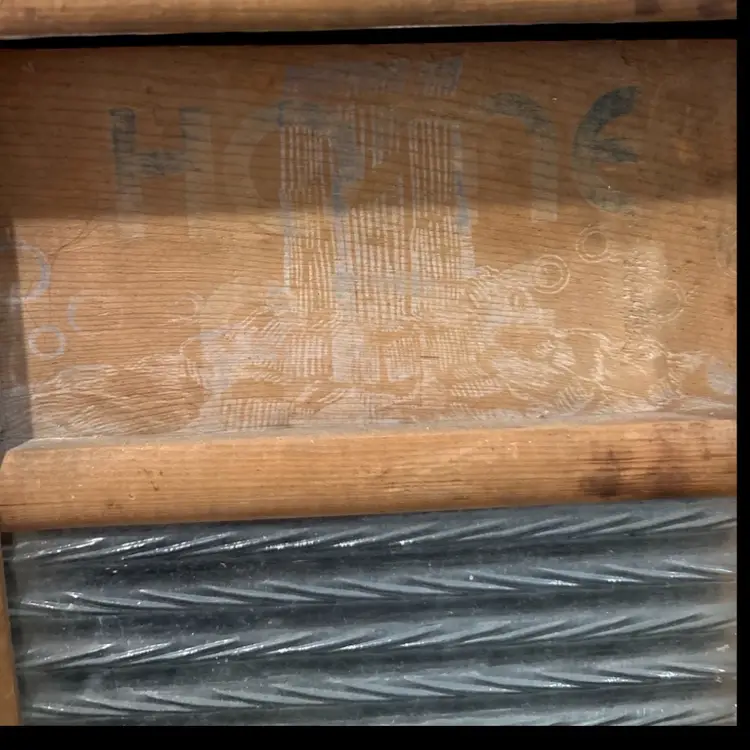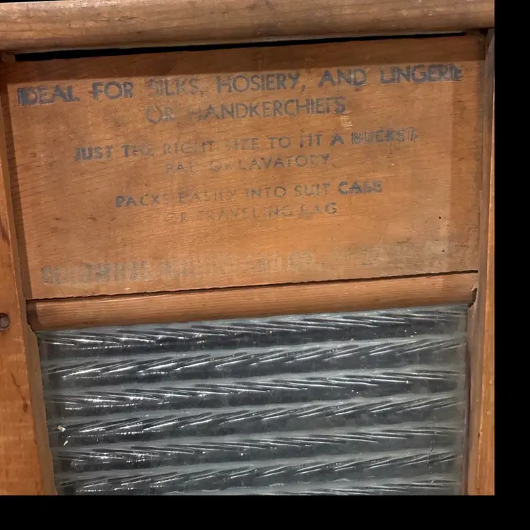 BRIEF HISTORY LESSON The Columbus Washboard Company, founded in 1895 in Columbus, Ohio, is the last remaining U.S. washboard manufacturer still in operation today. During the 1930s and 1940s, their glass washboards were marketed as “fine wash” boards for silks, hosiery, and lingerie — a gentler alternative to tin or zinc. Compact “travel size” versions like this one were advertised as easy to pack in a suitcase or use in a hotel lavatory. The “Home” waterfall logo seen on this example is a hallmark of their Depression- and WWII-era advertising.