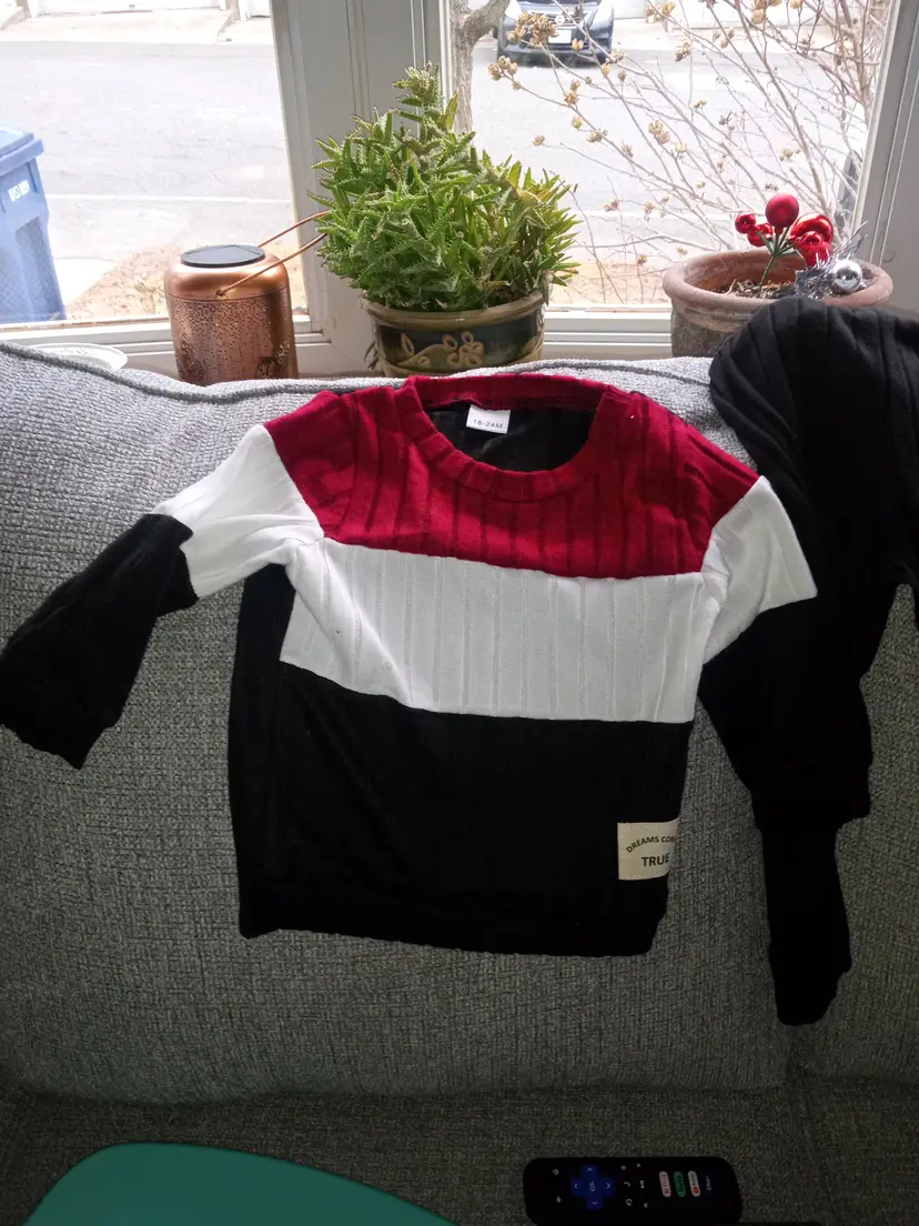 Cozy kids sweater with a stylish color block design in red, white, and black. Perfect for keeping warm and looking cool!