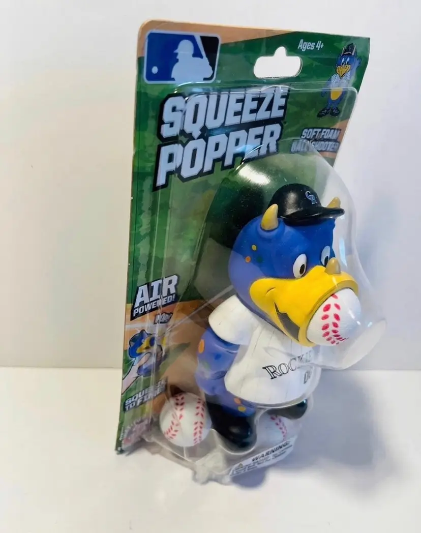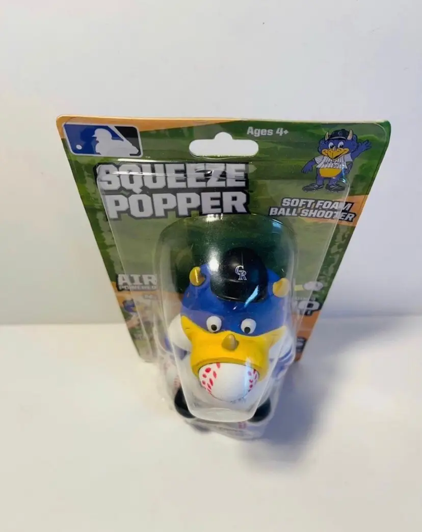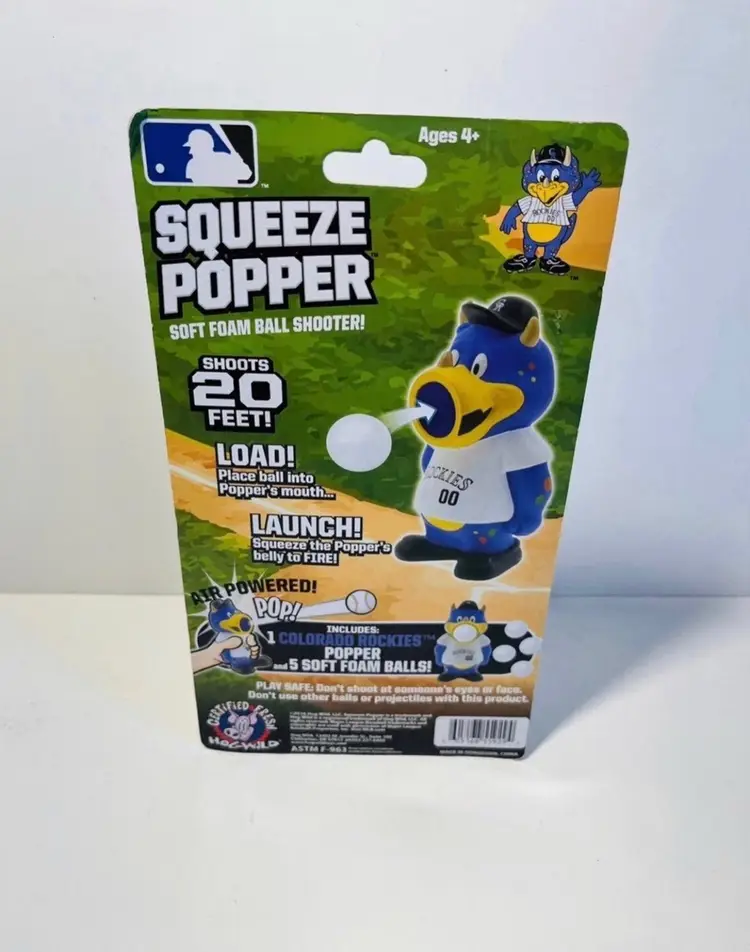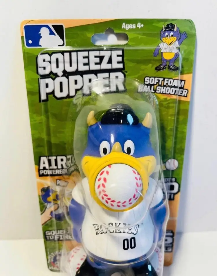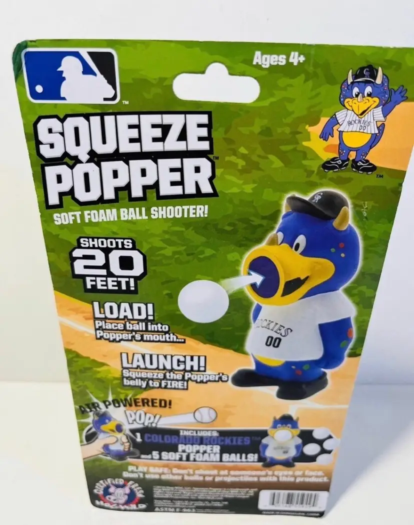 Colorado Rockies Dinger the dinosaur squeeze popper soft foam ball shooter MLB Major League Baseball This is new and sealed from 2016, only slight wear on packaging Includes 5 soft foam balls Ages 4+ Shipped in bubble wrap in a poly mailer Thank you for stopping by :)