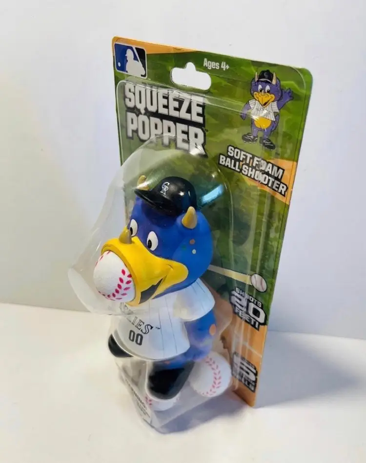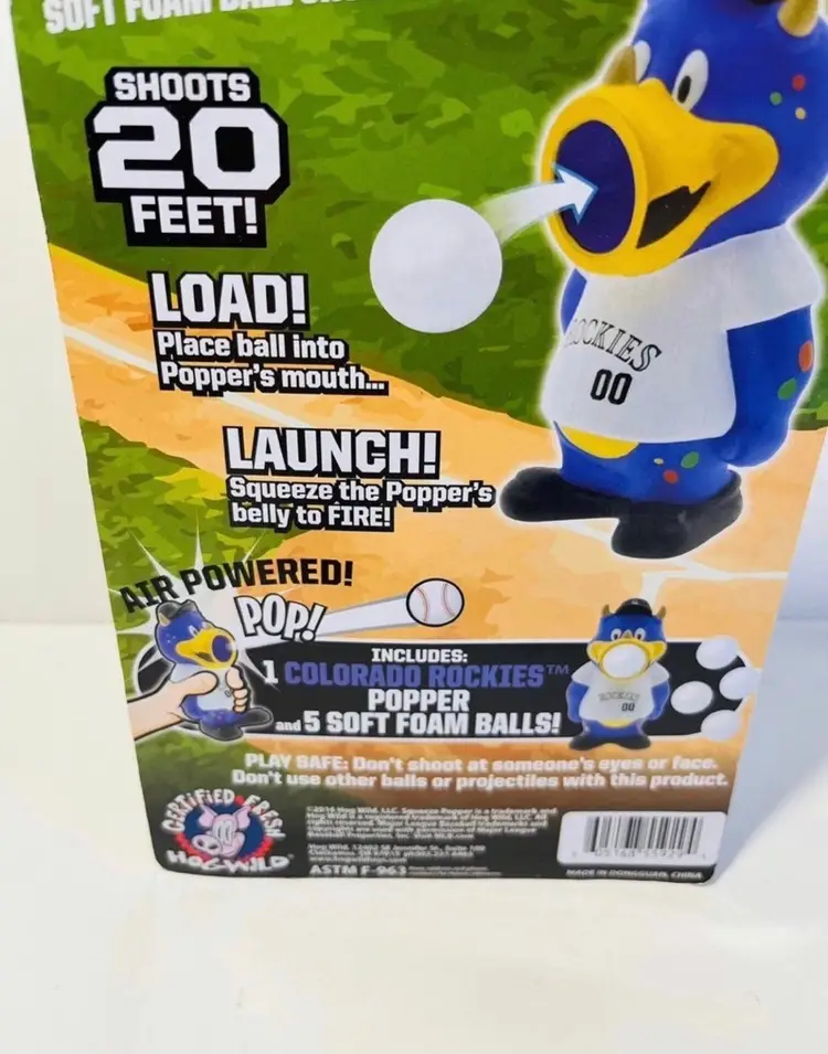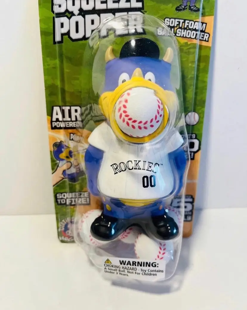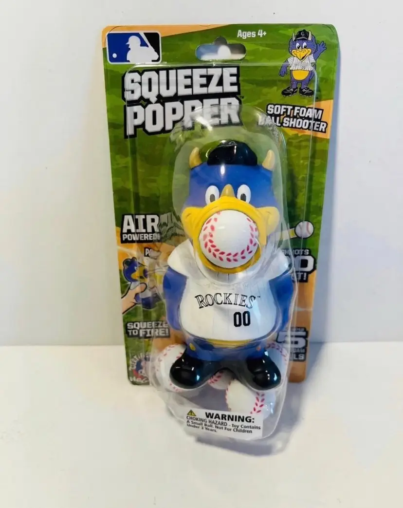 Colorado Rockies Dinger the dinosaur squeeze popper soft foam ball shooter MLB Major League Baseball This is new and sealed from 2016, only slight wear on packaging Includes 5 soft foam balls Ages 4+ Shipped in bubble wrap in a poly mailer Thank you for stopping by :)