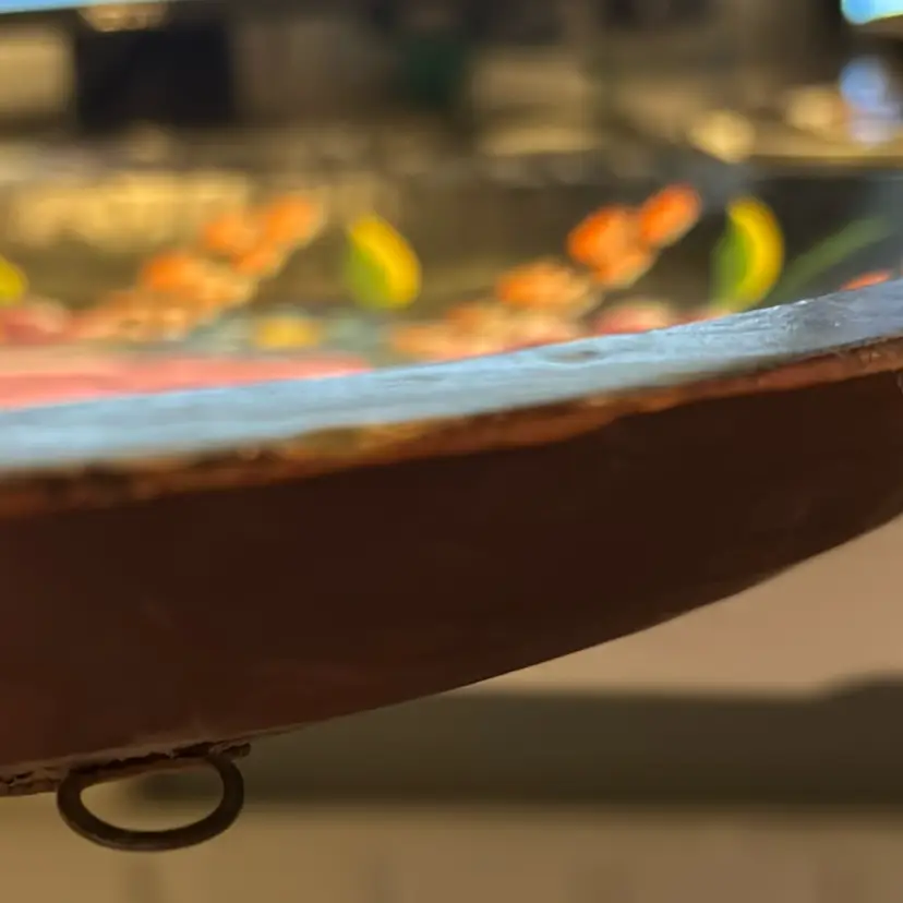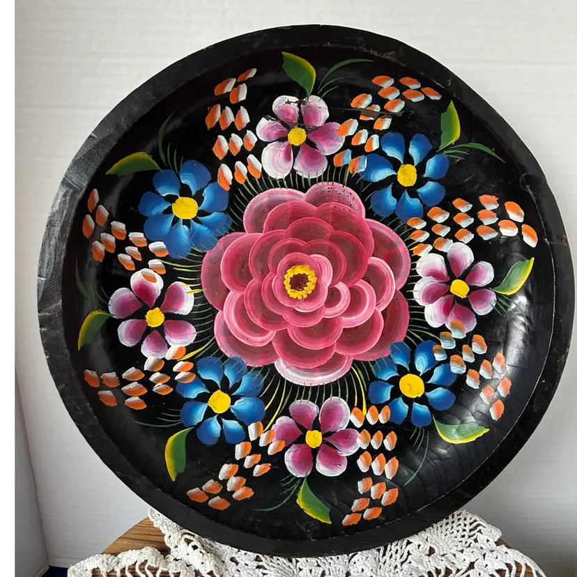 Wonderful wooden Mexican Batea bowl that can also be used as a wall hanging. Hand painted folk art florals which are nice and bright. No chips or cracks.