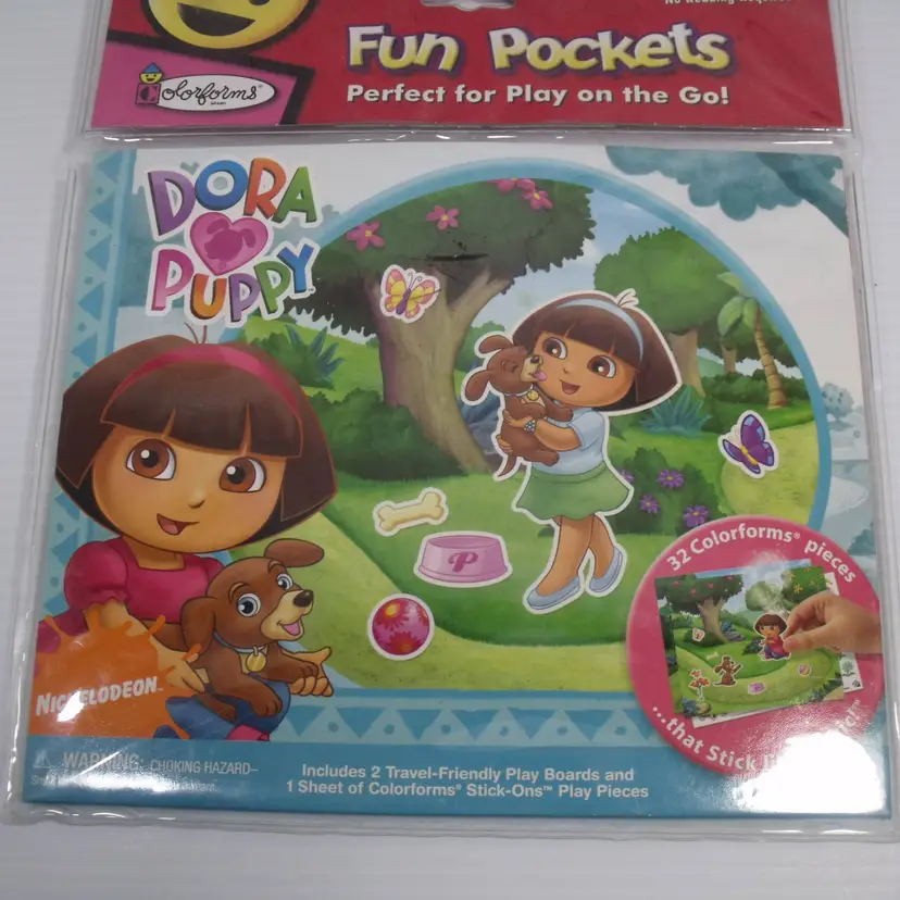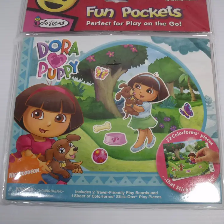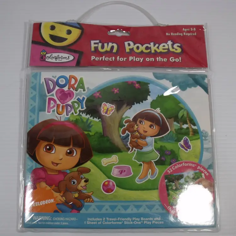 The Colorforms Fun Pockets Dora the Explorer PlaySet is a classic toy from 2009 that is perfect for children aged 3-8 years old. Featuring the popular Nickelodeon character, Dora the Explorer, this playset offers interactive and imaginative play opportunities. Great for travel with 2 travel play boards and 32 Colorforms Stick-Ons Play Pieces. Made in China by Colorforms, this toy is sure to entertain young fans of the lovable character.