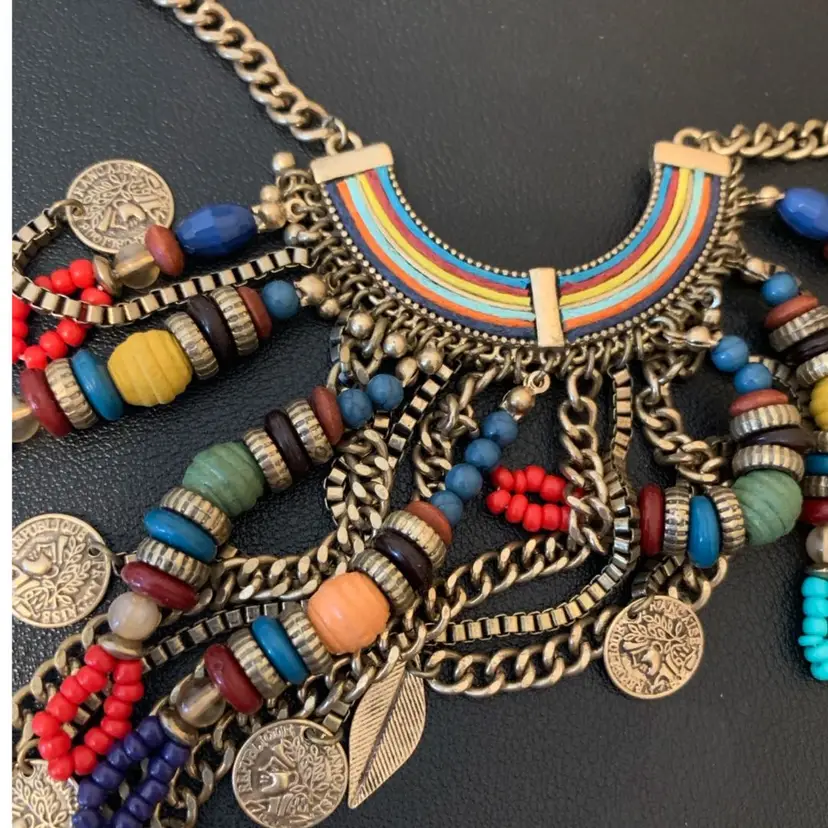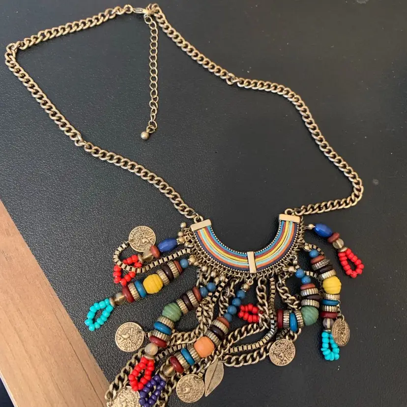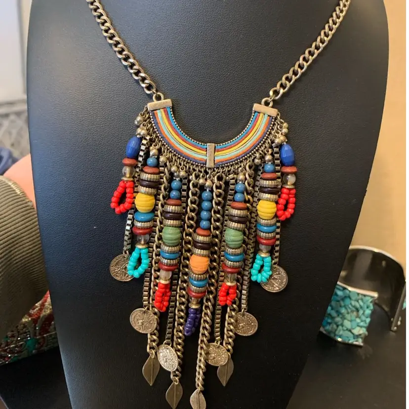 This is a great necklace for the upcoming warmer months the necklace is colorful and full of movement. Statement piece without looking too heavy There are no makers mark on this. It has an 8 inch drop from clasp to top of pendant and has a 2 inch extender Nicely made and in excellent condition