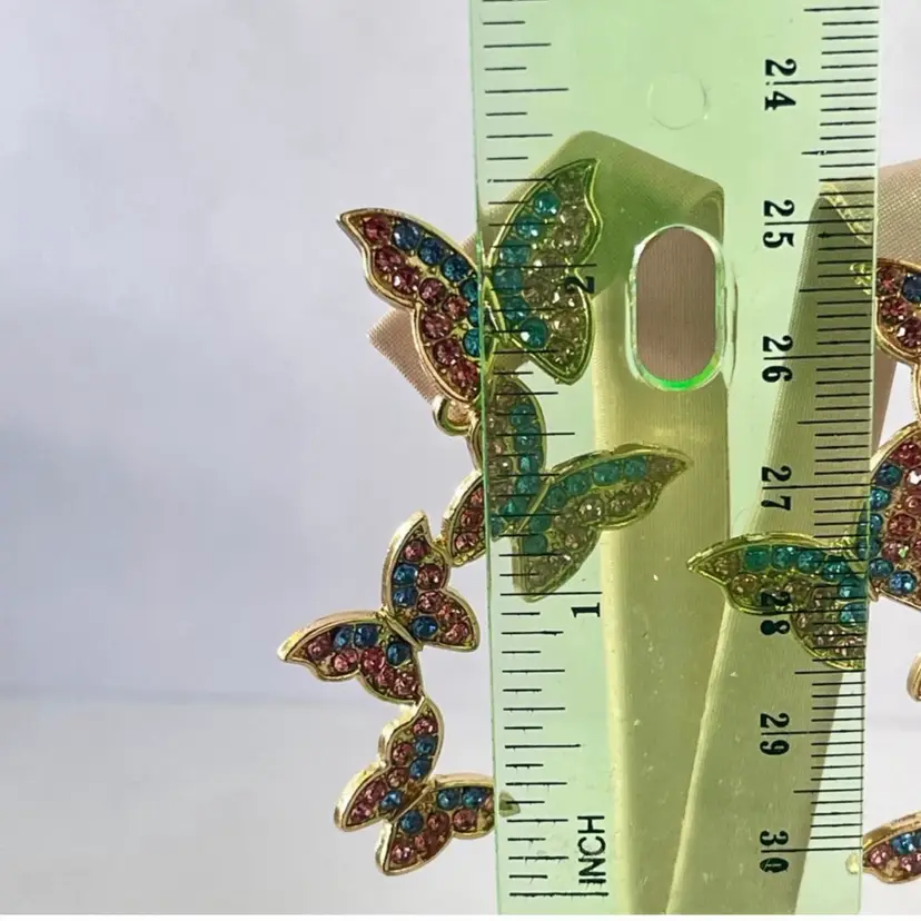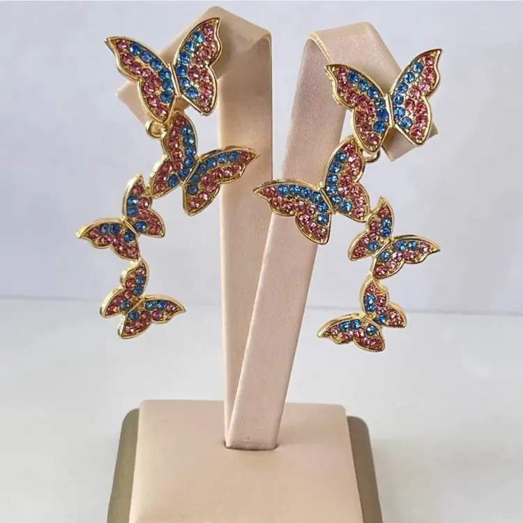 Butterfly dangle earrings featuring vibrant pink and blue rhinestones set in a gold tone finish. Statement earrings have a cascading butterfly design that adds movement and sparkle.