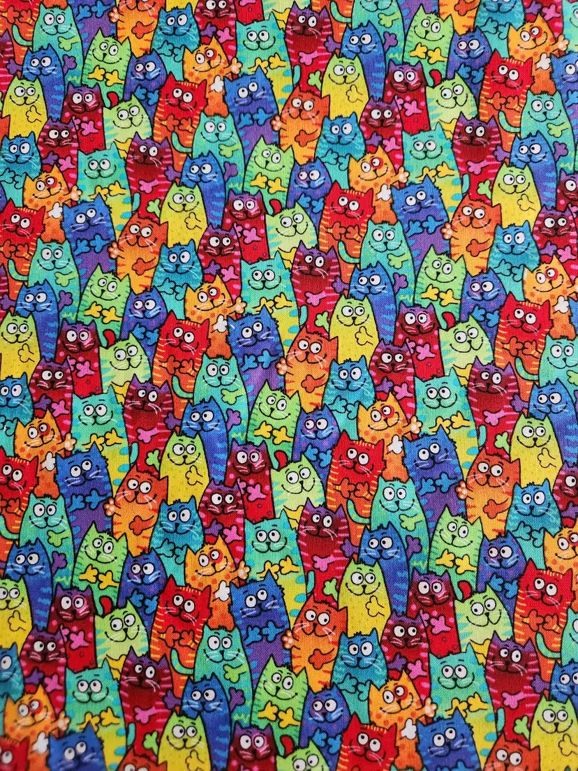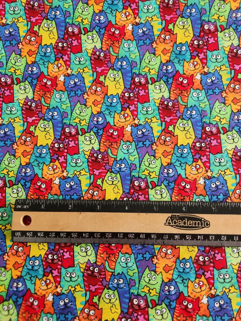This fabric has different colored cats all over it. The fabric is bright and cheerful. It is 100% cotton. The size of each cat is approximately 3/4 inch wide. I have included a ruler in the second picture so that you can get an idea of the size of the design. The fabric is 44 inches wide. The fabric is sold in one yard increments. If you order more than a yard, it will be cut as one continuous piece.