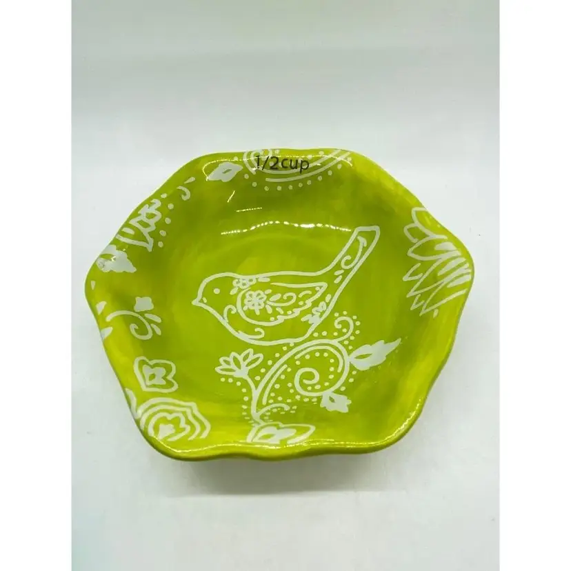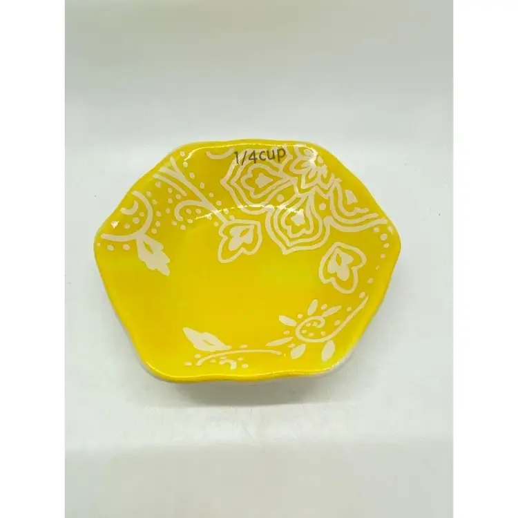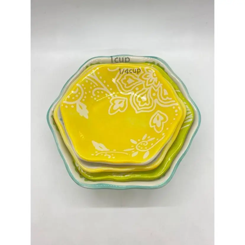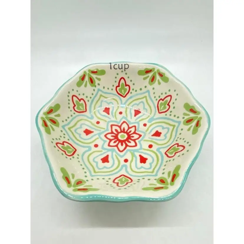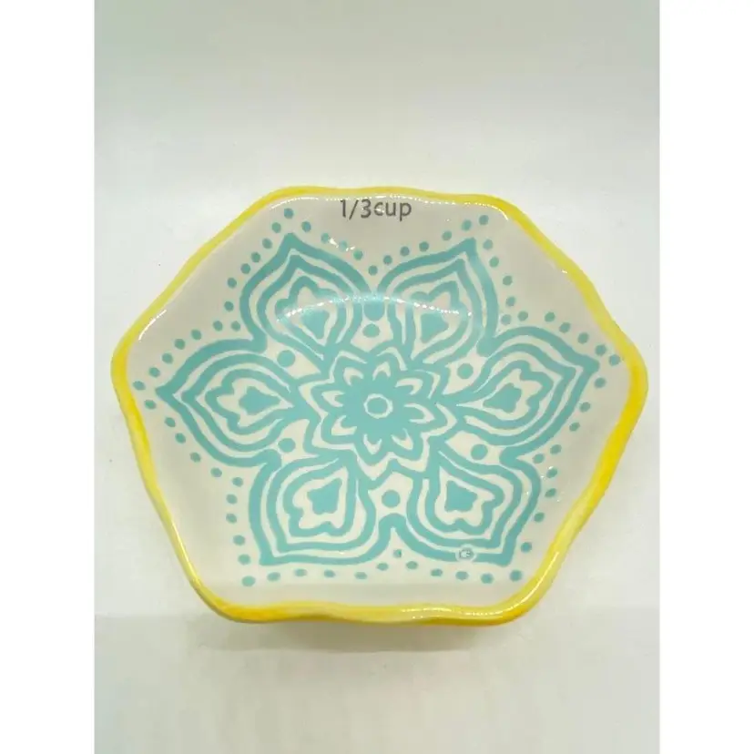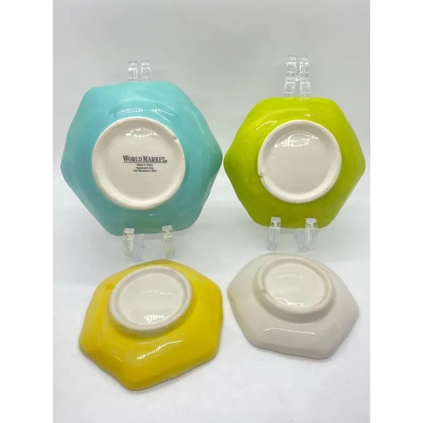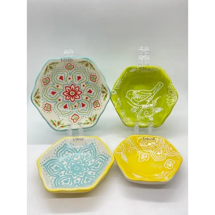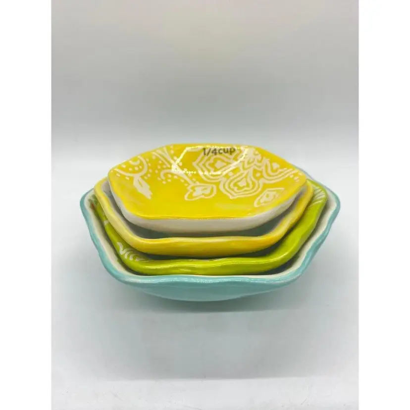 Colorful Ceramic Stackable Measuring Cups -Set of 4 - World Market Set includes: 1 Cup ½ Cup 1/3 Cup ¼ Cup In beautiful condition but the ¼ cup does have some crazing on the bottom – see picture Please review all pictures, pictures are part of the description