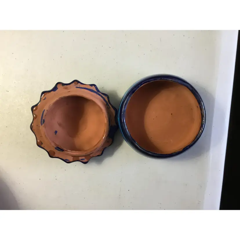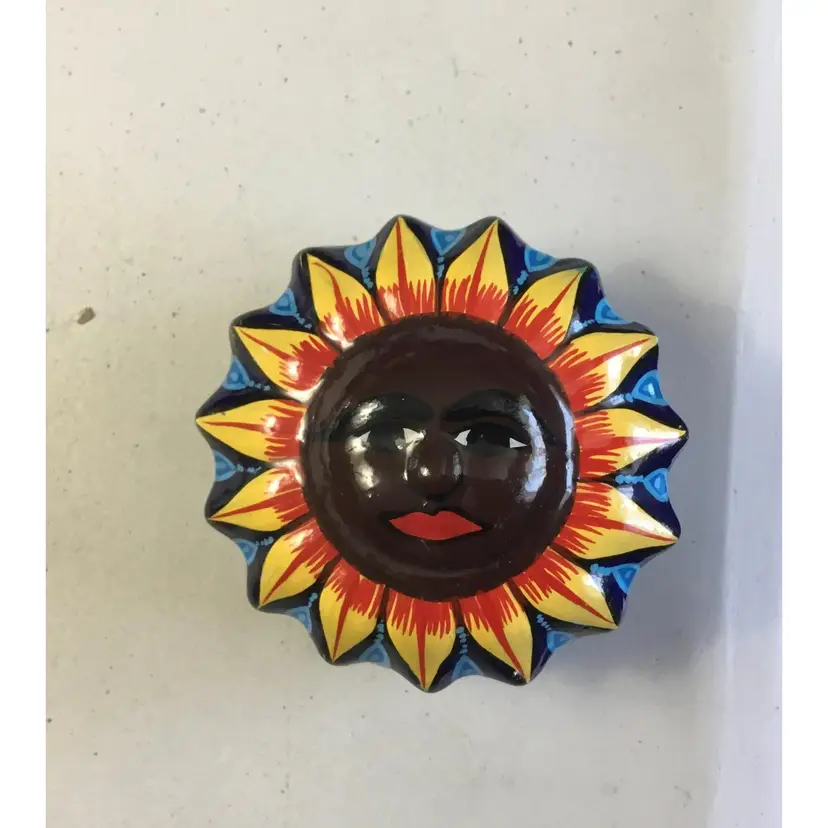 3" wide, 2" high, sunny African sunflower dish. Terra cotta ceramic with 3 shades of blue glaze, red and yellow petals, smiling face.