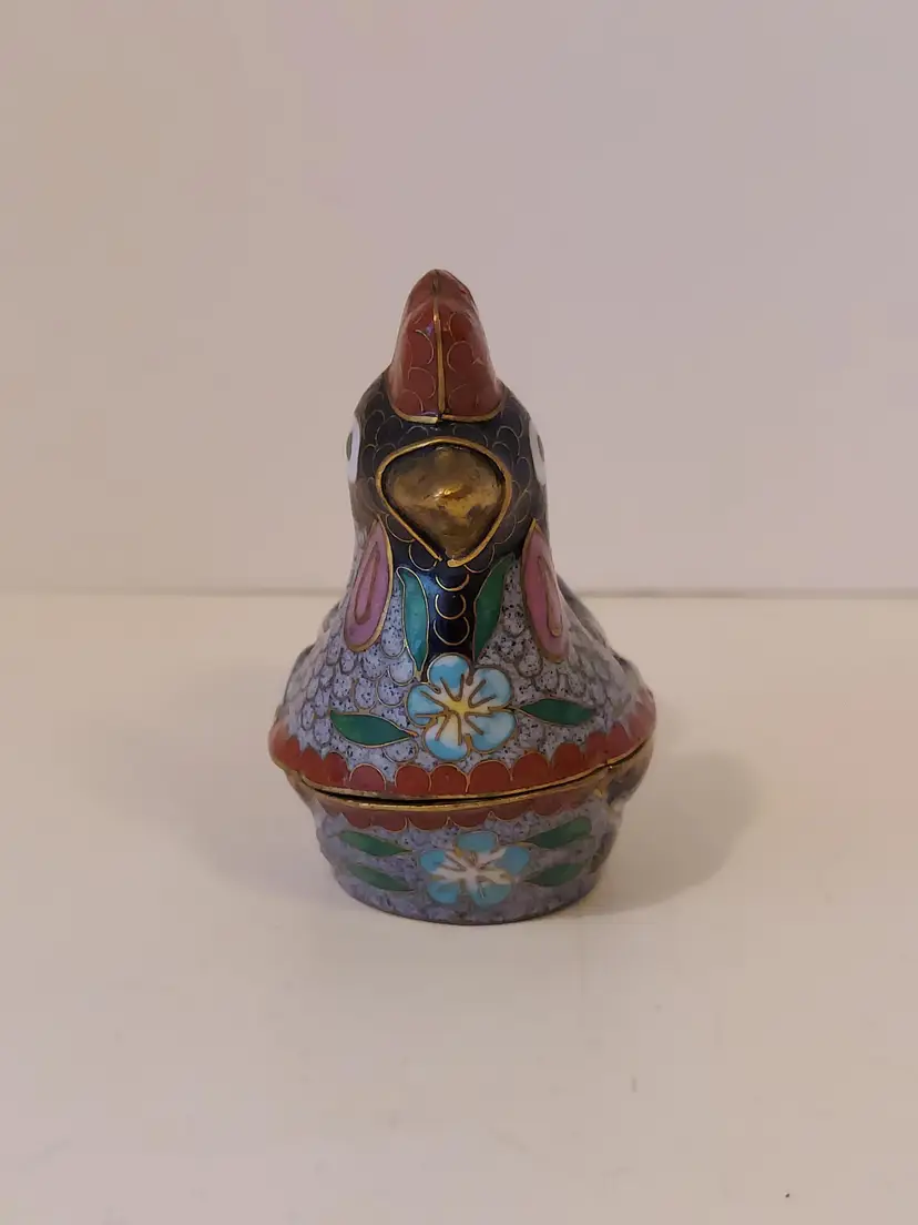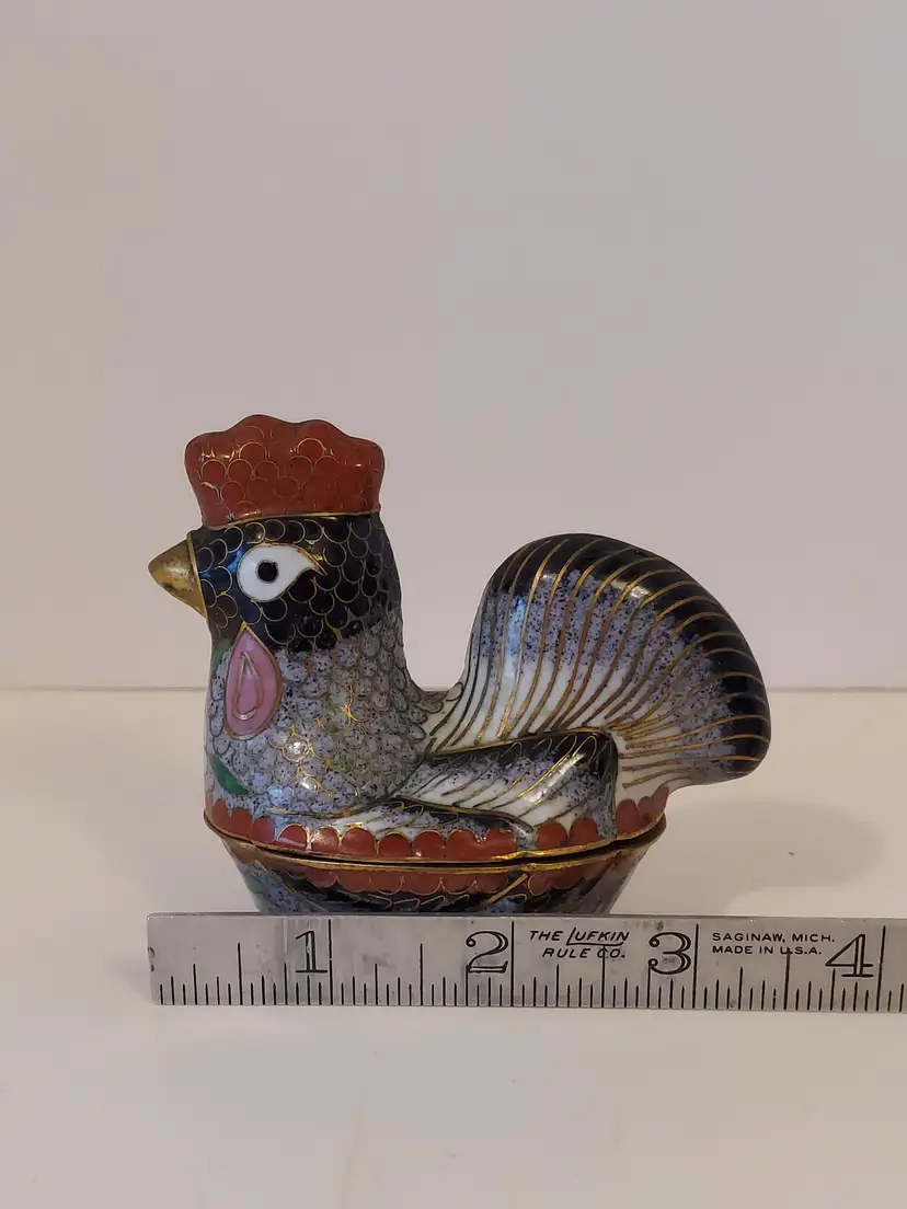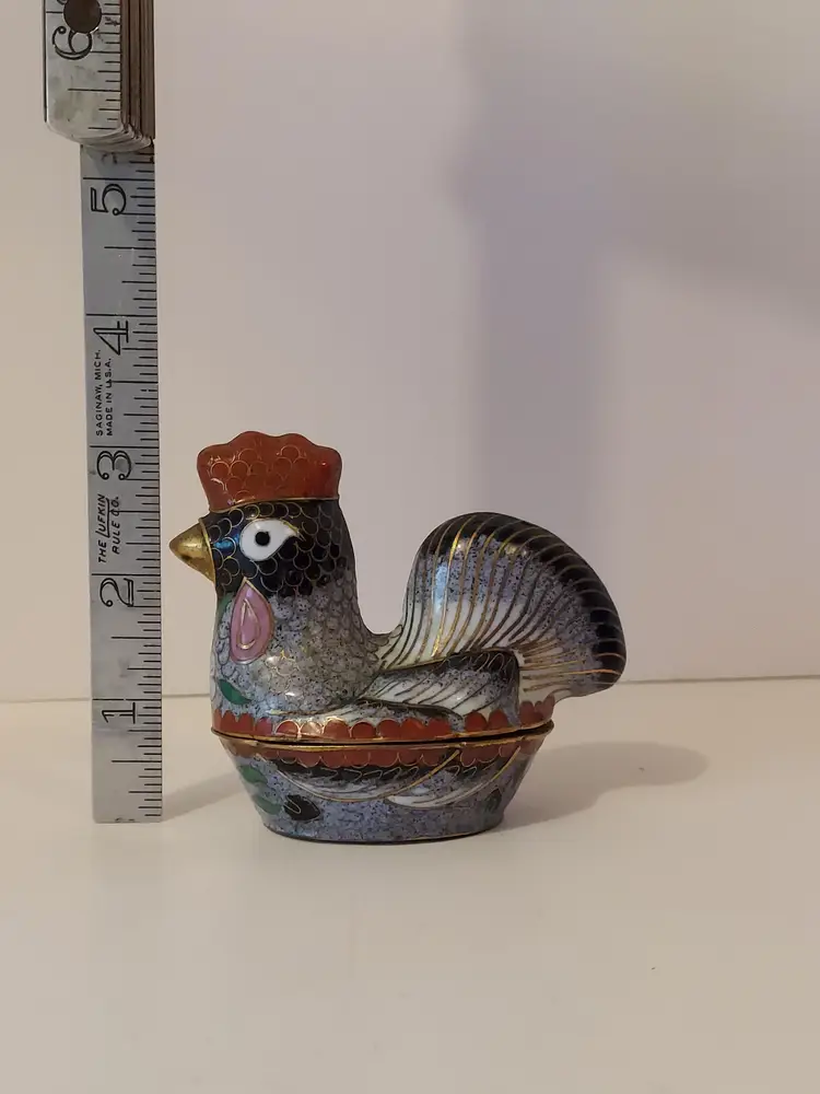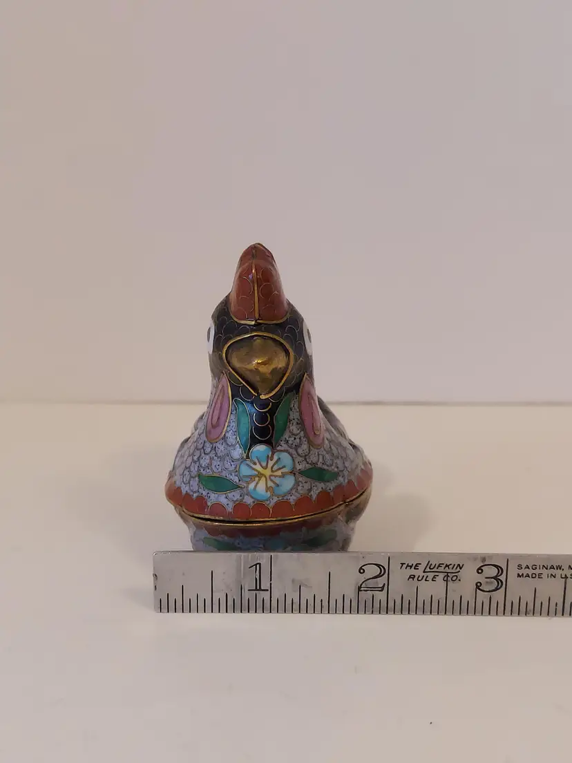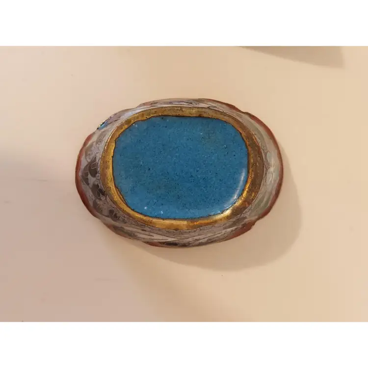 This pretty little trinket box measures approximately 3.5×3×2 inches and is in good condition.