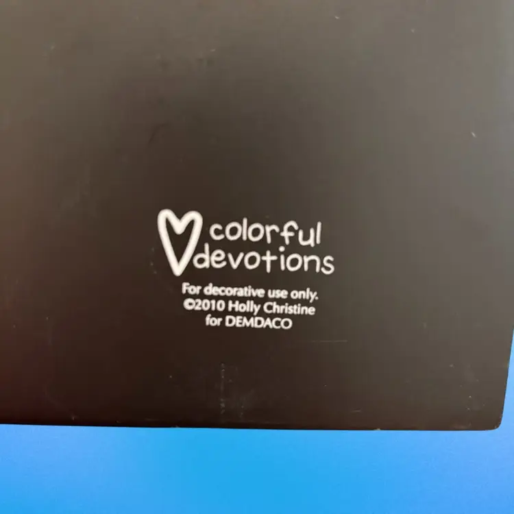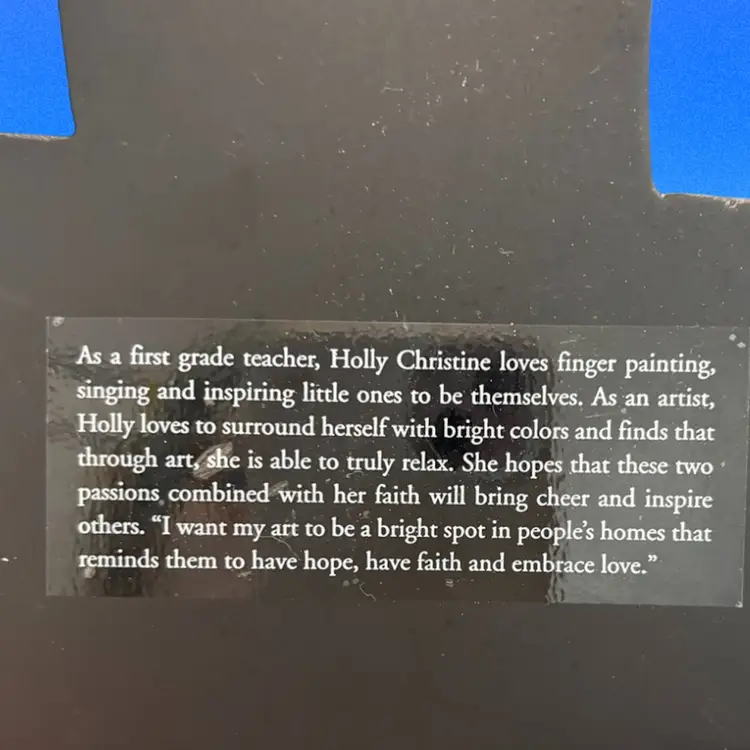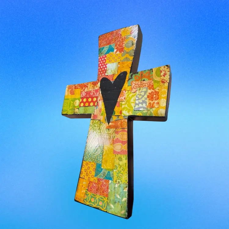 Featuring a vibrant patchwork collage design with a bold black heart at the center, this decorative cross reflects Christine’s passion for art, teaching, and faith. • Artist: Holly Christine • Collection: Colorful Devotions • Licensed by DEMDACO, ©2010 • Medium: Mixed pattern decoupage-style with glossy finish • Colors: Yellow, orange, green, teal, red, black • Size: Approx.: 15” x 9 1/2” • Marked on back with artist bio and DEMDACO stamp • Condition: Excellent vintage condition, clean, vibrant and Ready to Hang.