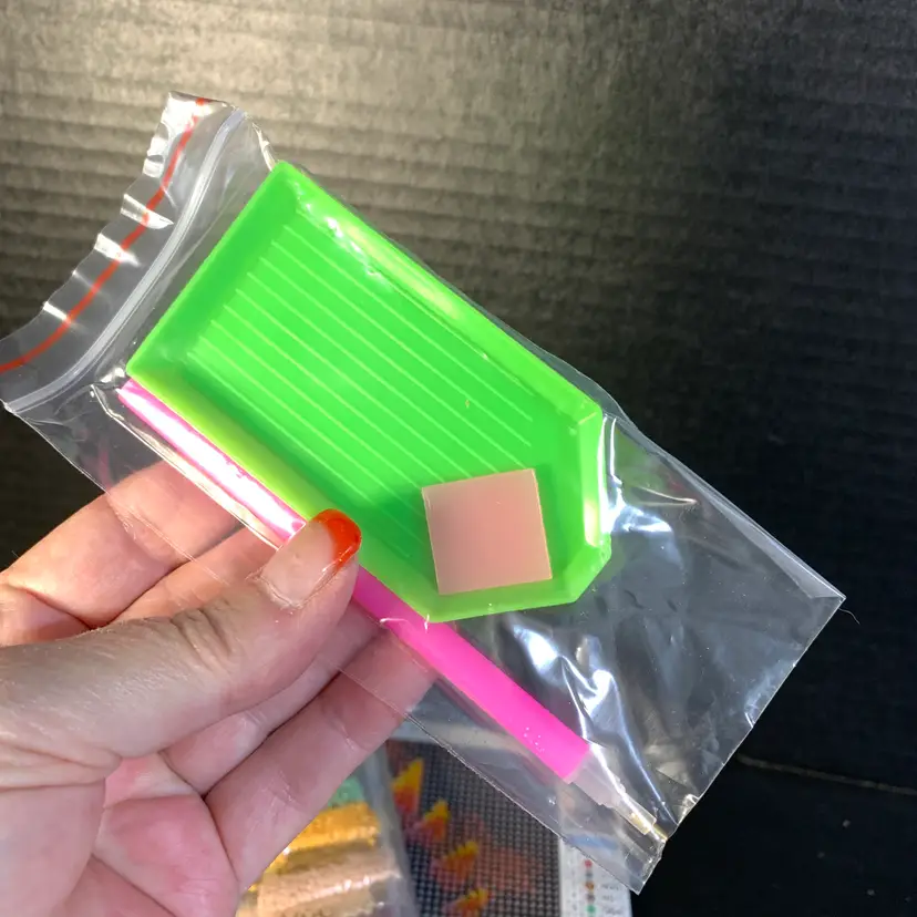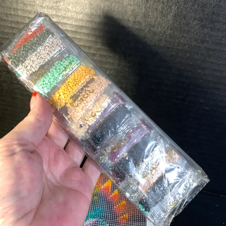 This is so colorful! Includes everything you see in the photos. Finished art measures 6 inches by 10 inches. Weighs 3 ounces. If the actual postage ends up being less than what you paid, you will be refunded for anything over one dollar.