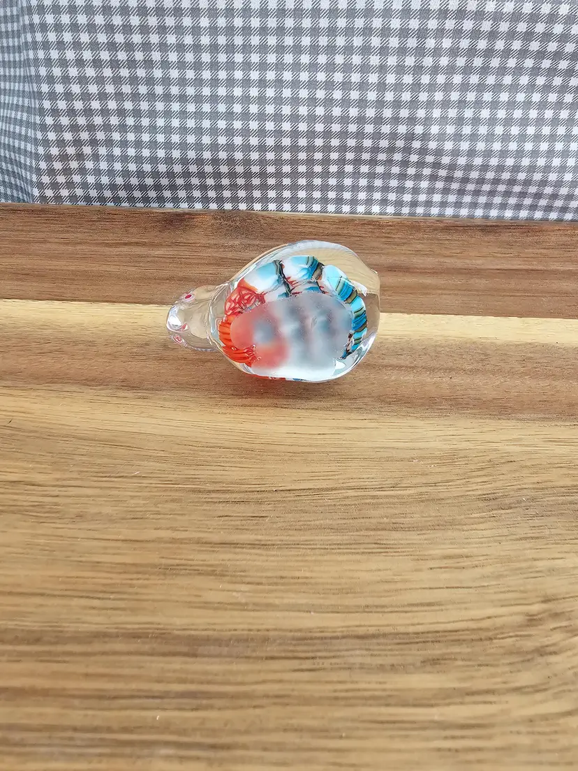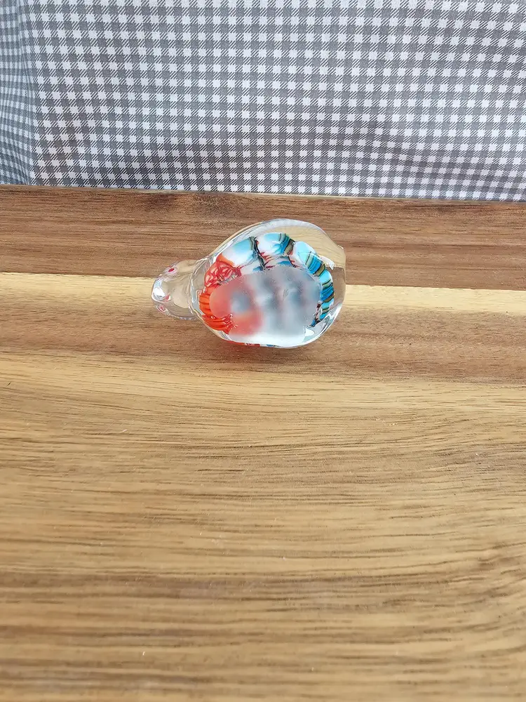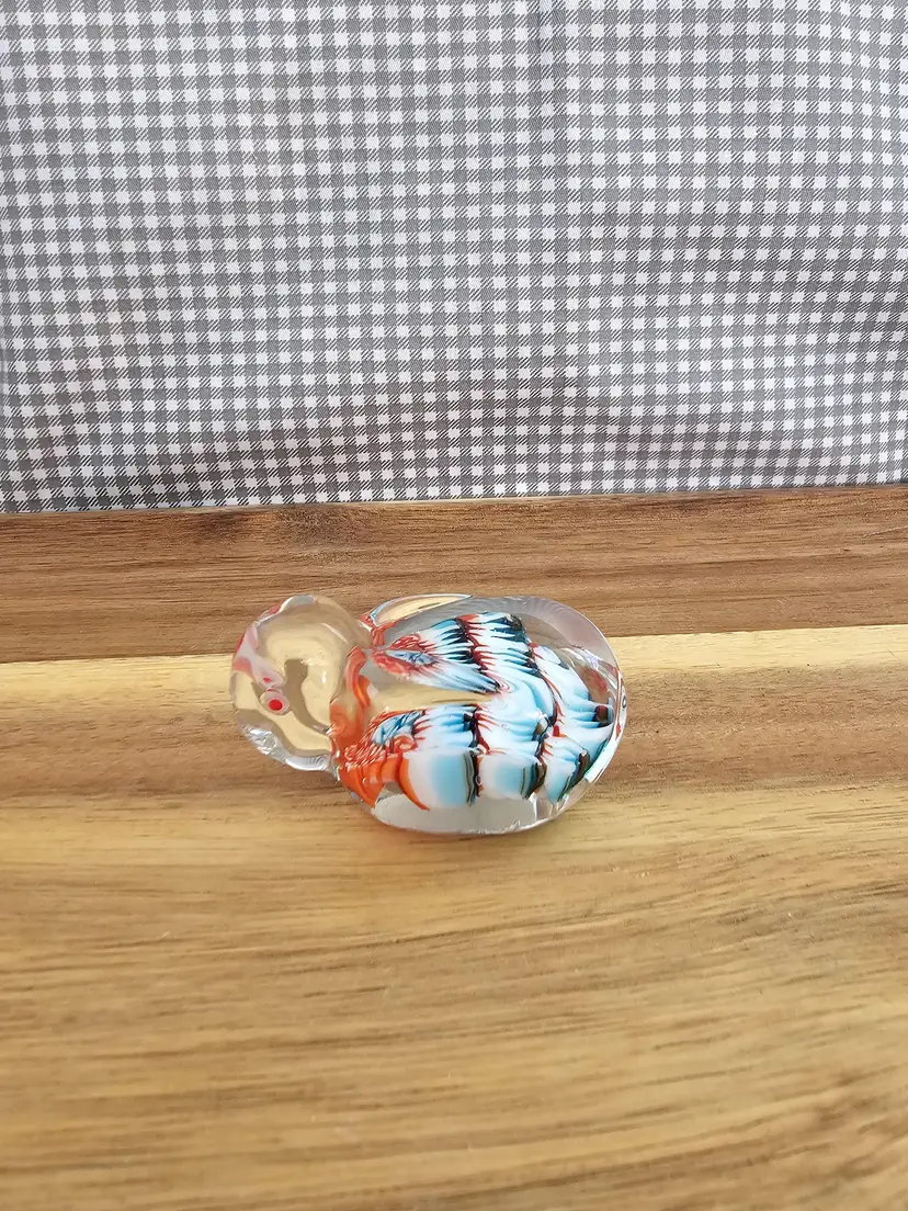 Charming glass bunny paperweight with vibrant swirls of color. Perfect for adding a splash of whimsy to your desk or shelf. A delightful piece for collectors and bunny enthusiasts.