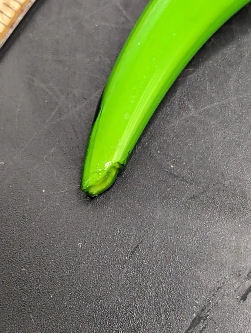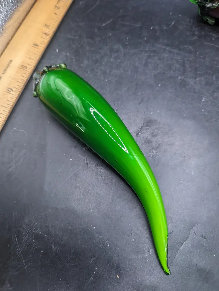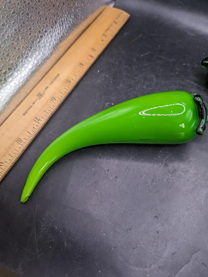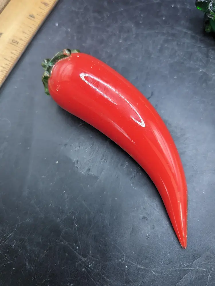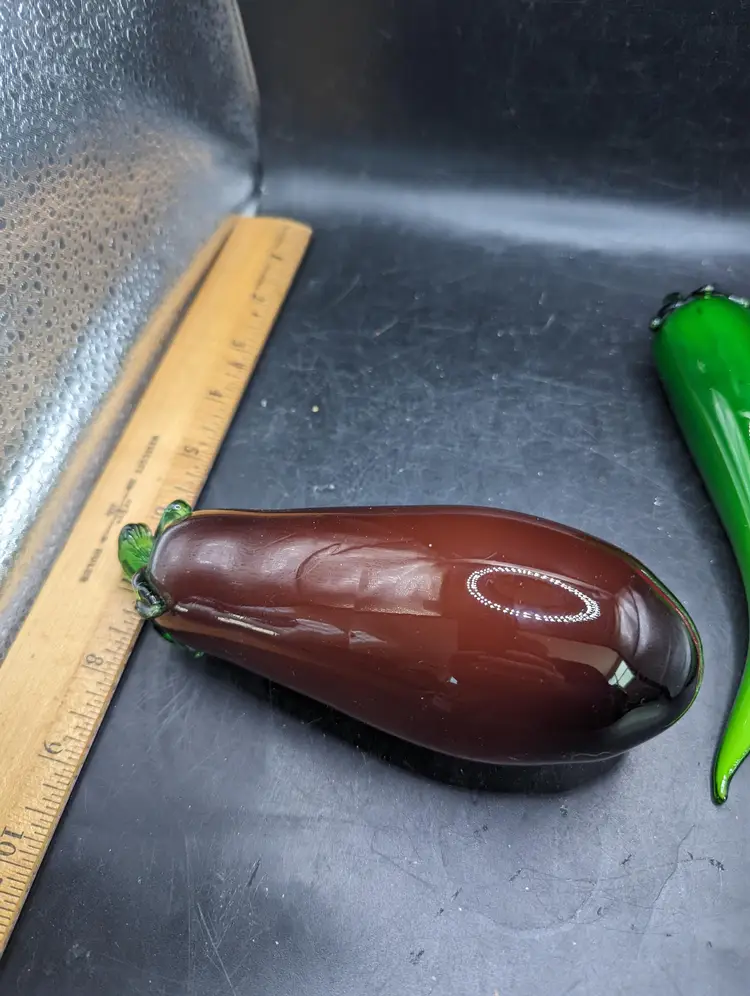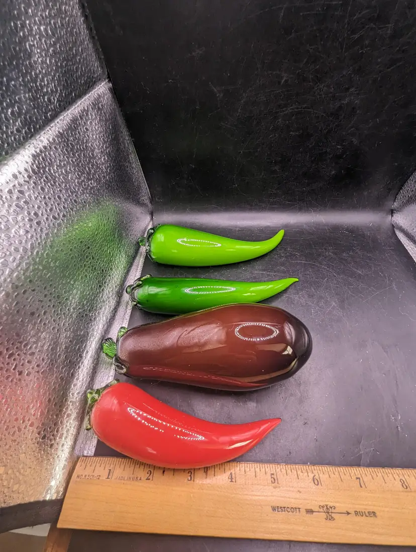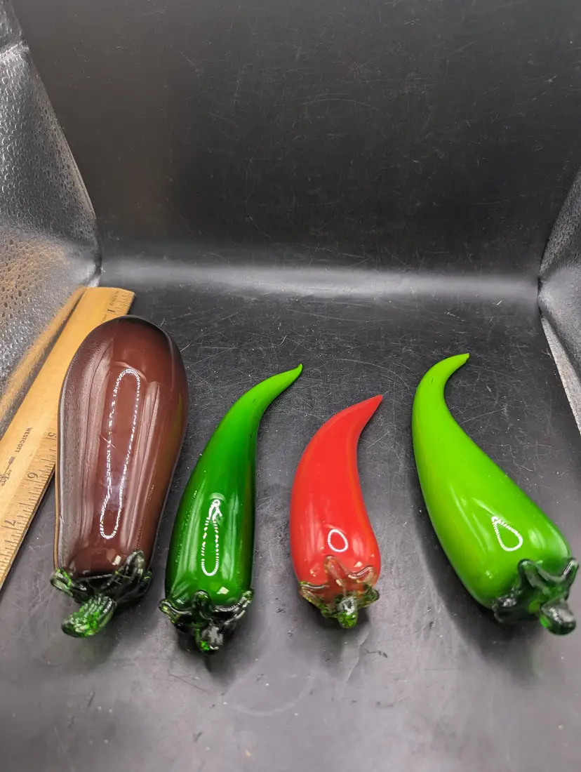 Add a splash of color to your decor with this vibrant set of glass vegetable ornaments. Featuring an eggplant and three chili peppers, these pieces are perfect for kitchen decor or as unique gifts. Please see all pictures for condition and measurements. The last picture shows a chip on one green pepper