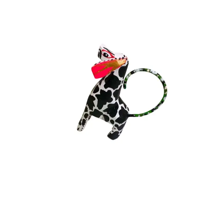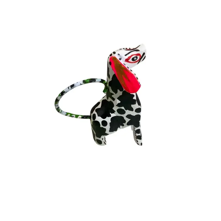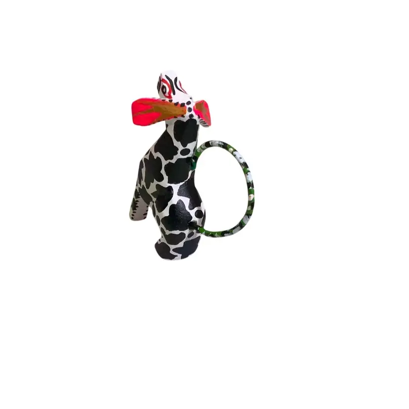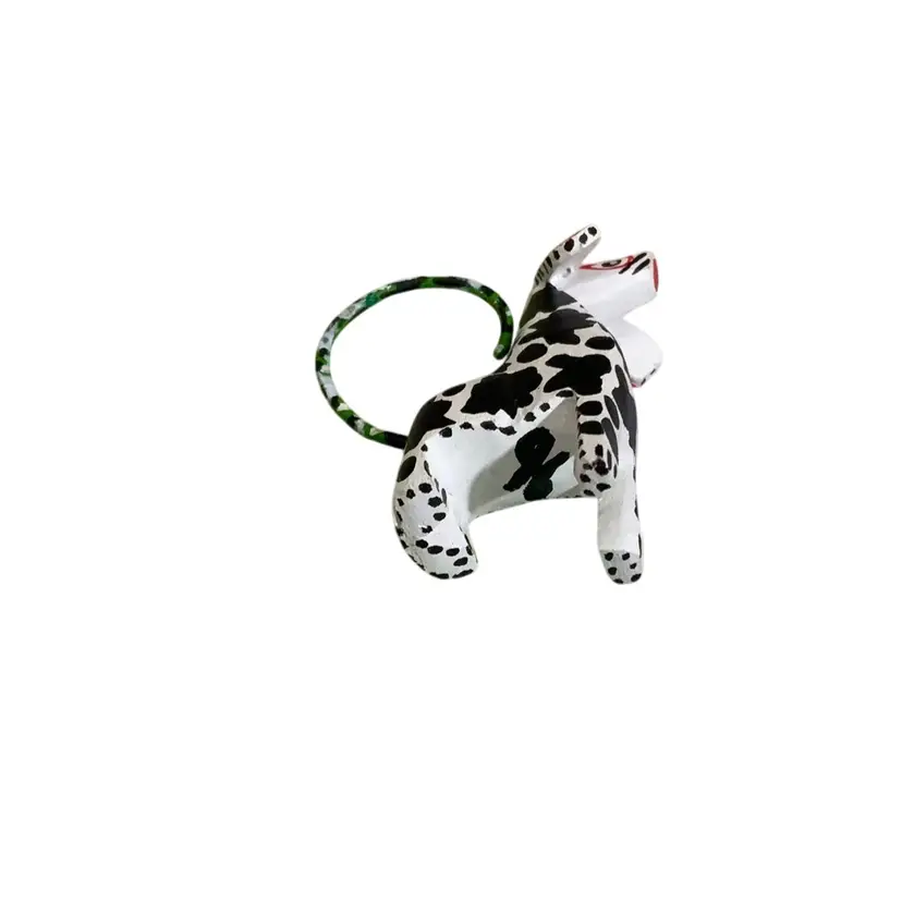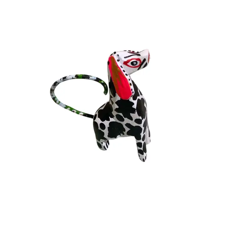 This is an Alebrije, a brightly colored Mexican folk art sculpture, specifically a coyote. Alebrijes are often made of wood and hand-painted with intricate patterns and vibrant colors. They represent fantastical creatures or animals and are considered to be spirit guides or protectors. 3” by 2.5”
